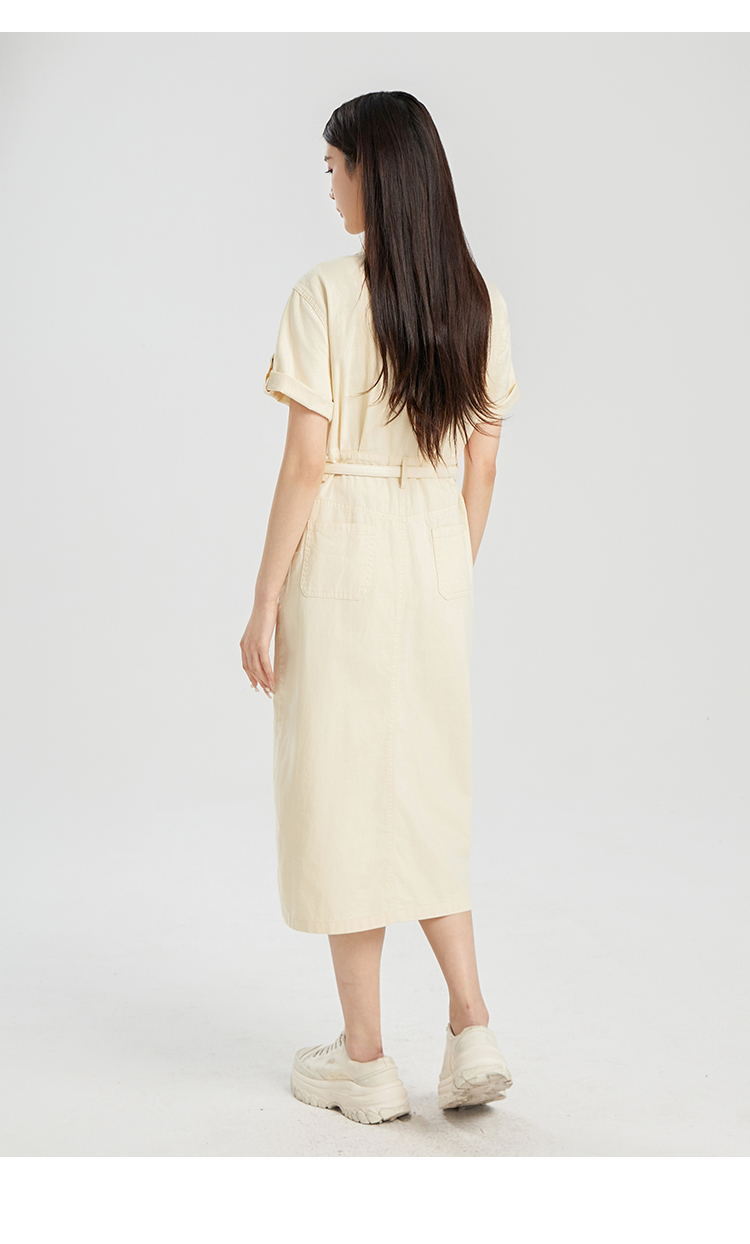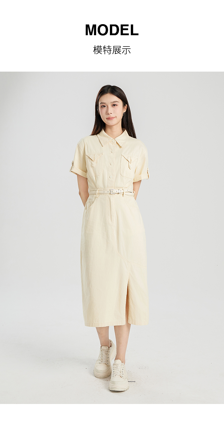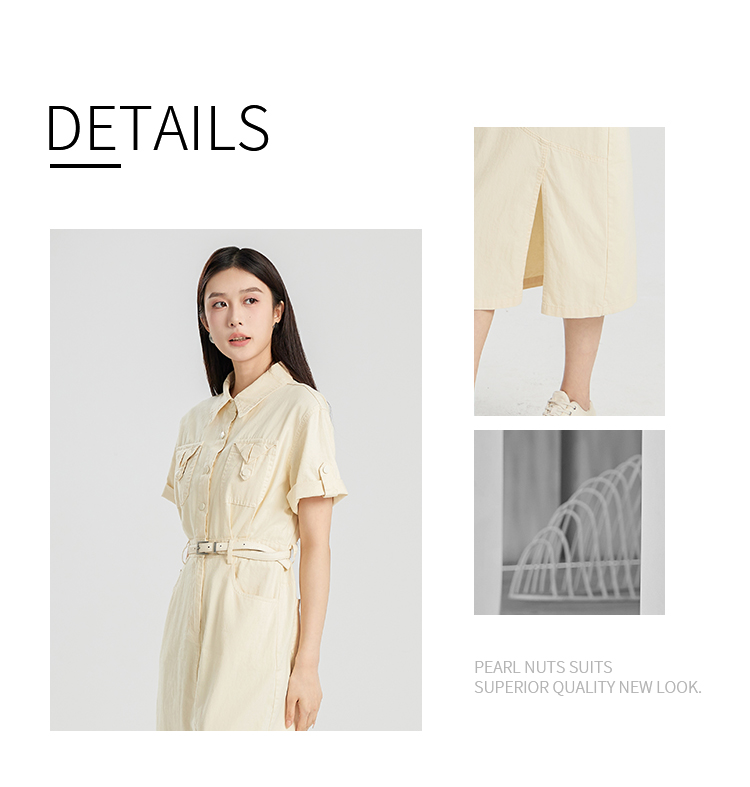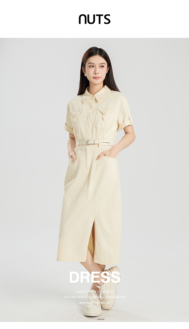 NUTS商场同款夏季杏色简约气质高腰纯棉短袖连衣裙428103408