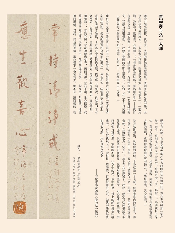 弘一大师及其弟子黄福海先生为后人留下了丰厚的精神文化遗产,影响深远。这本书法集萃彰显了家国情怀、以美育人、以德化人、严以律己的崇高风范和关爱生命、佑护苍生的大爱精神。