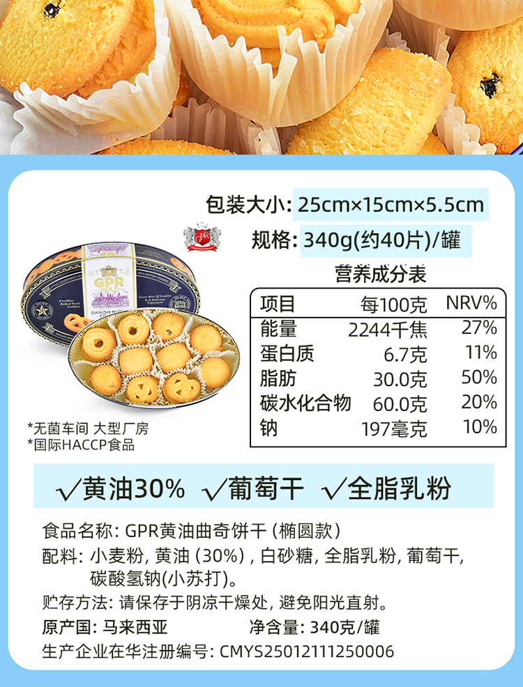 【双十一活动价】【图案随机】GPR黄油曲奇饼干椭圆款340g/052837 色泽金黄奶香浓郁