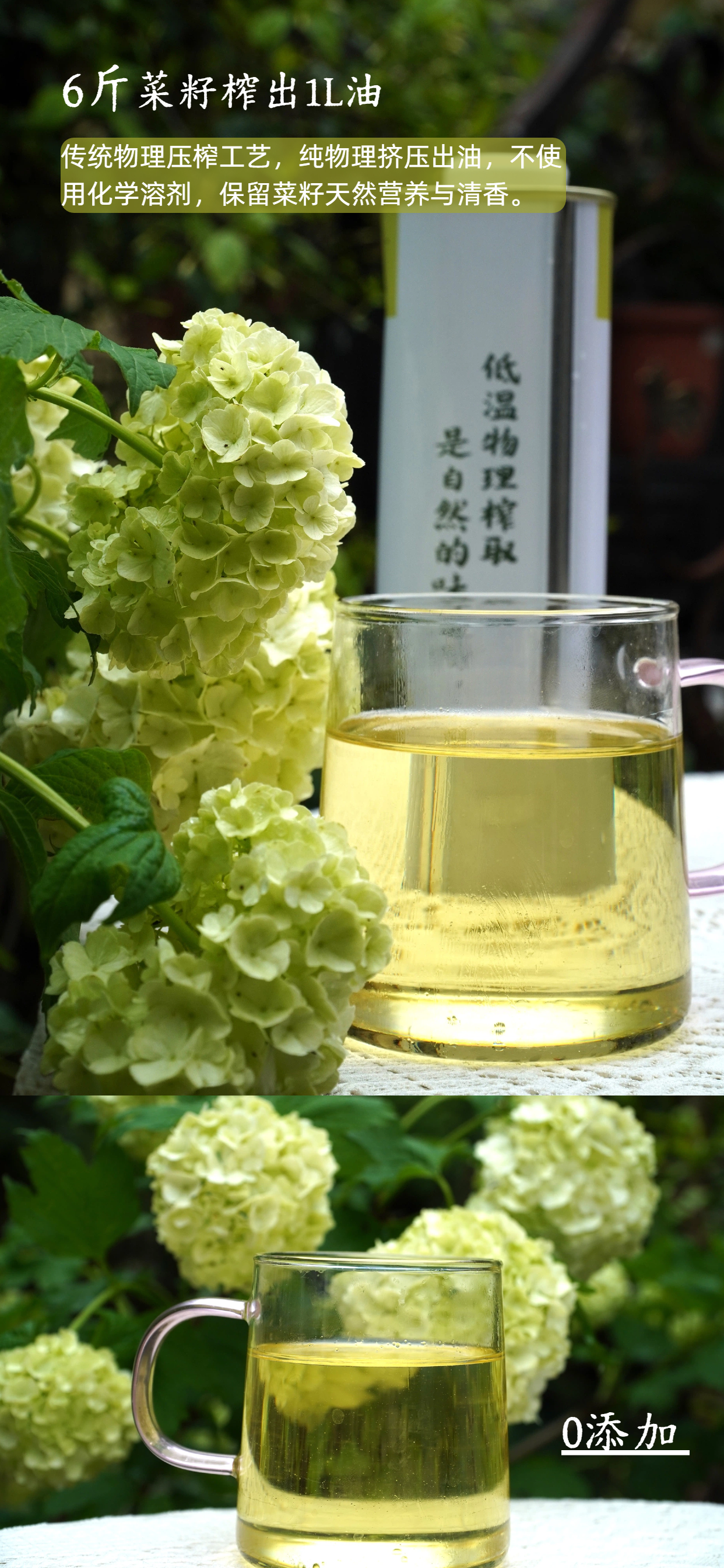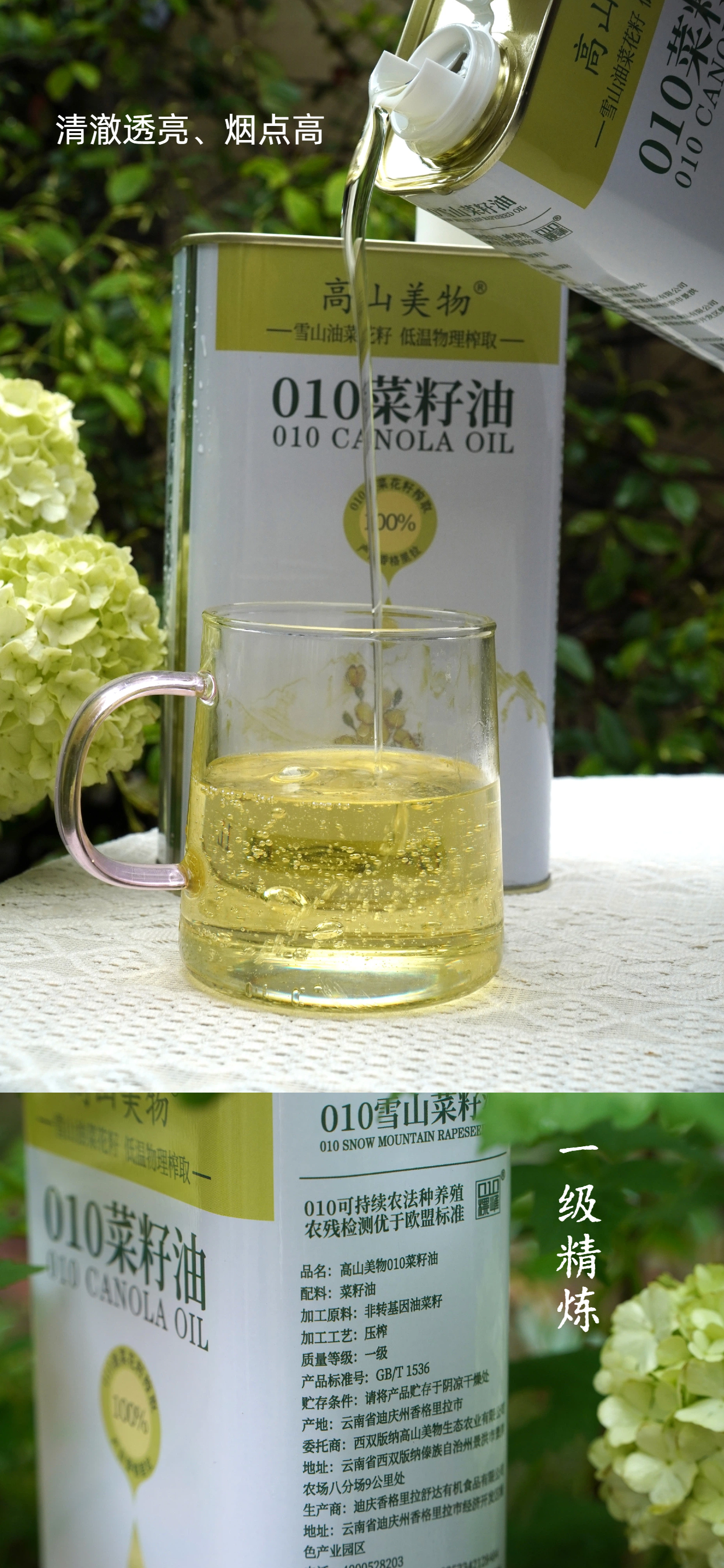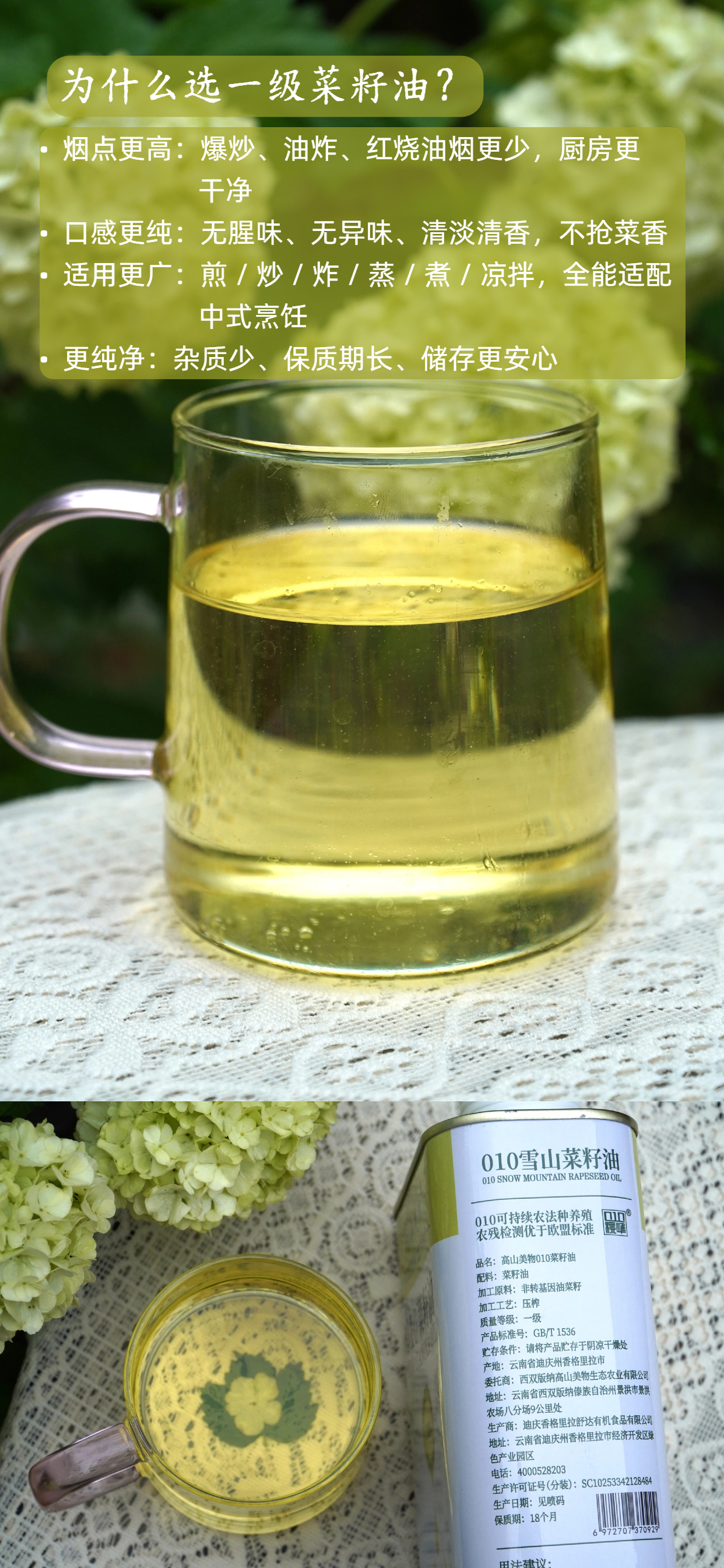010菜籽油 雪山灌溉 非转基因高原菜籽 物理压榨 0 添加 【一级精炼 清澈透亮】 清香少烟 纯正好油