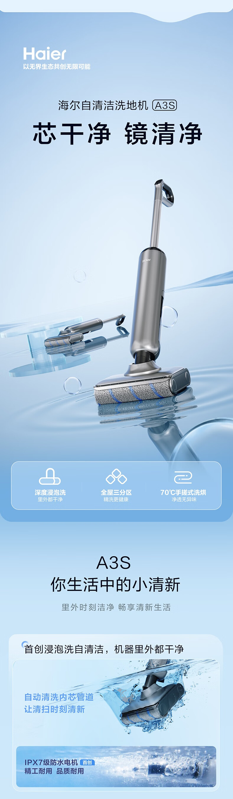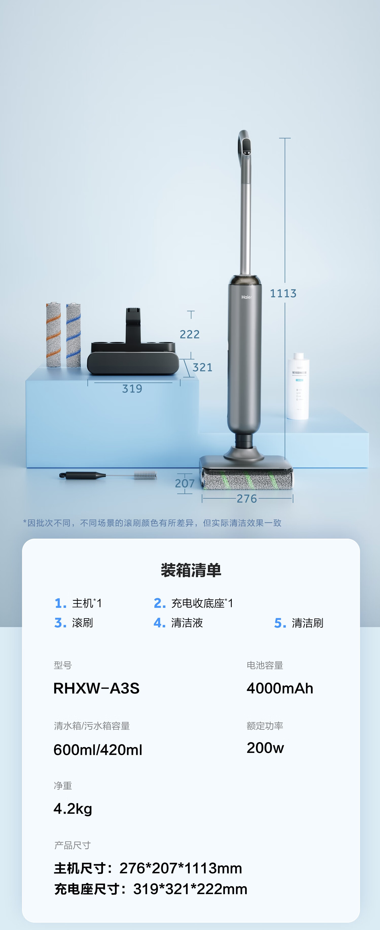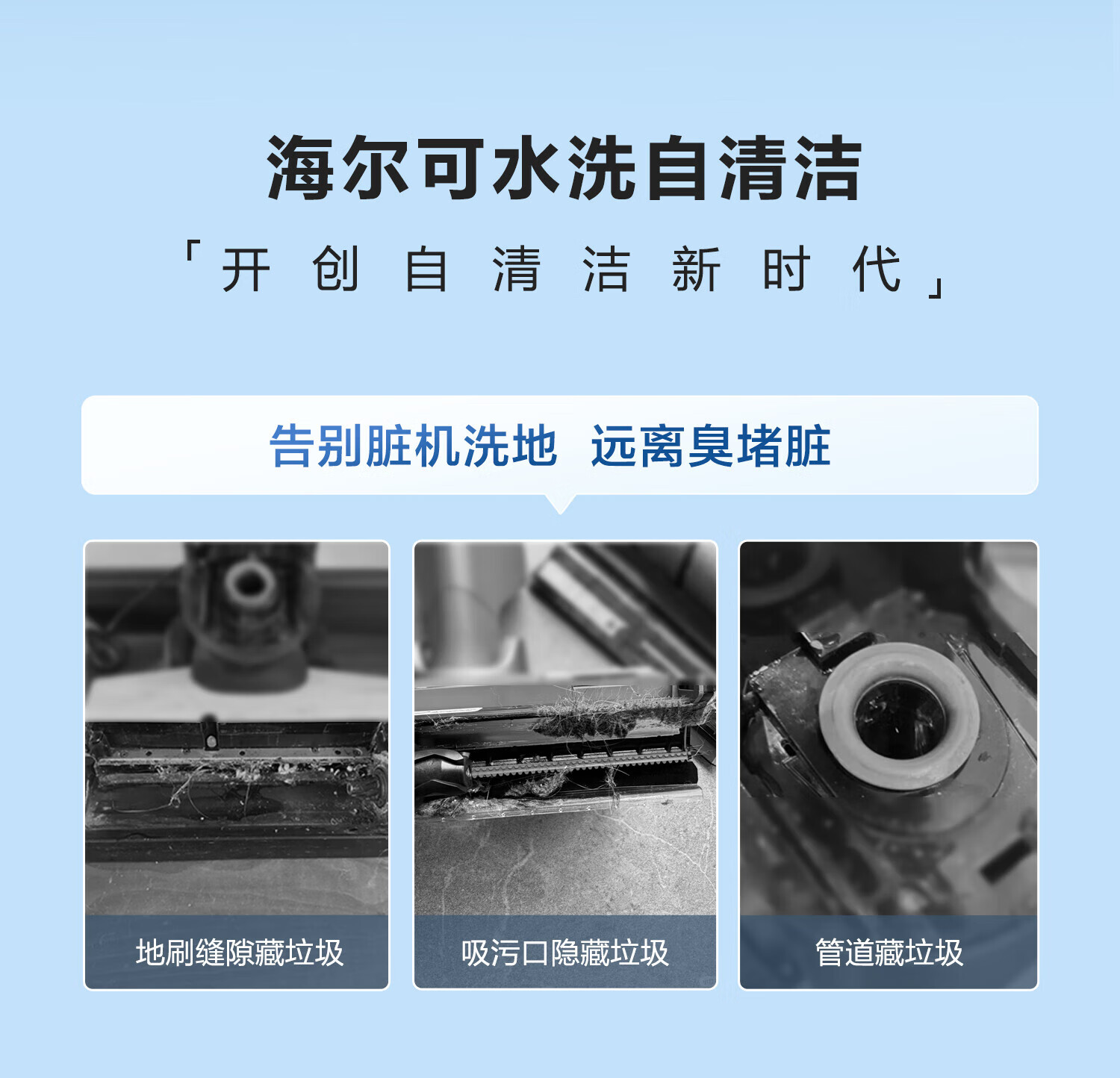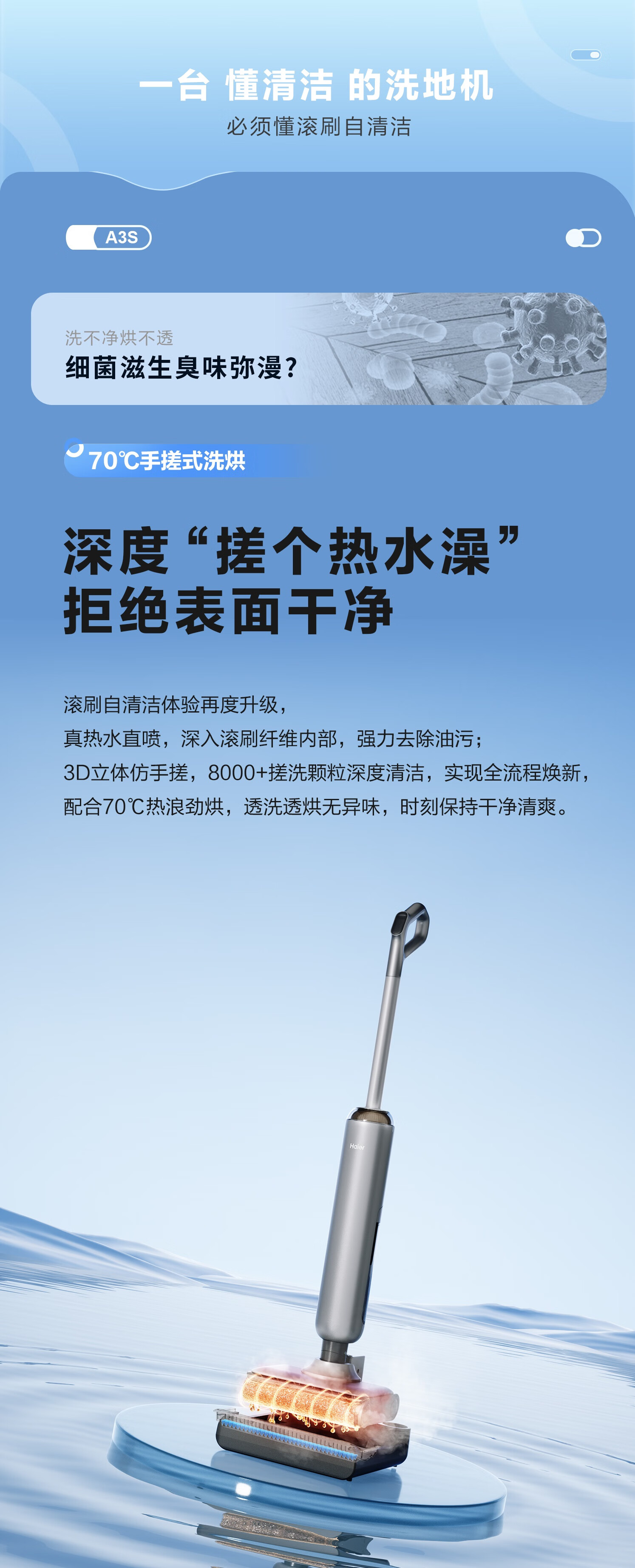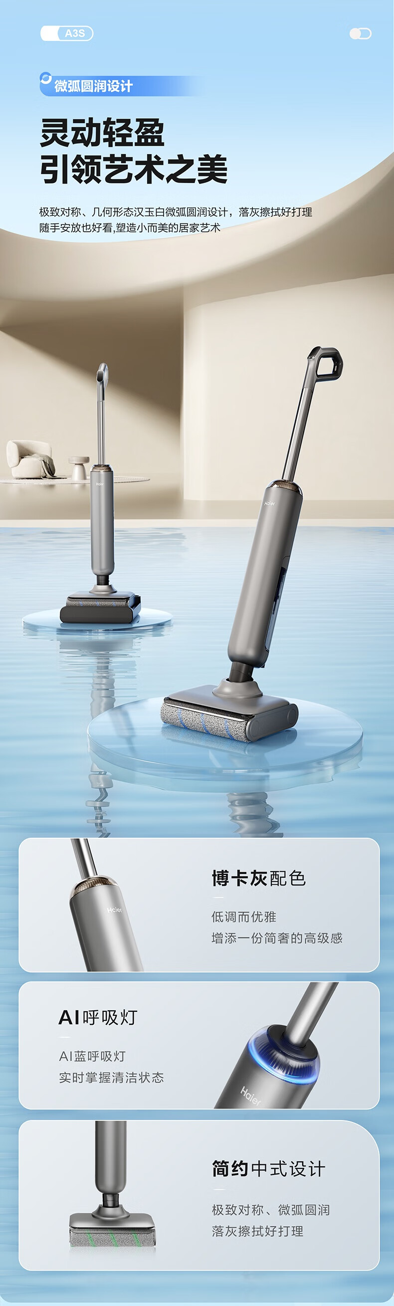海尔家用洗地机A3S高温70°热风烘干180°平躺防缠绕智能吸拖一体自动清洁洗扫地拖地机除菌手持吸尘器 A3S(典雅钢琴烤漆灰版)
