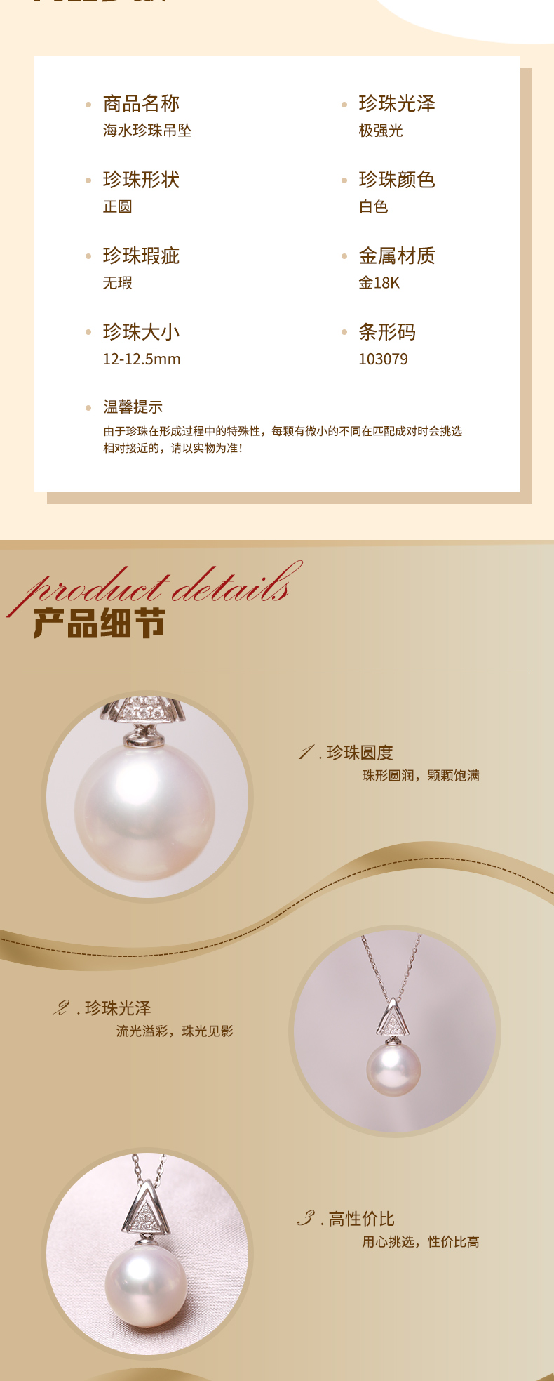 美裕 金 18K海水珍珠吊坠 南洋珠吊坠12-12.5mm白 103079