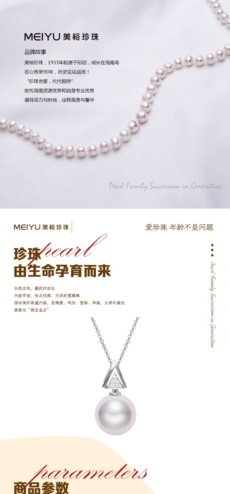 - 珍珠世家,代代相传。美裕珍珠,1933年起源于印尼,成长于海南岛。依托海南资源优势和自身专业优势,以经营南珠、南洋珠为主,专注于珍珠文化的挖掘和传播,把珍珠代表的爱意,永不间断地传承下去。
