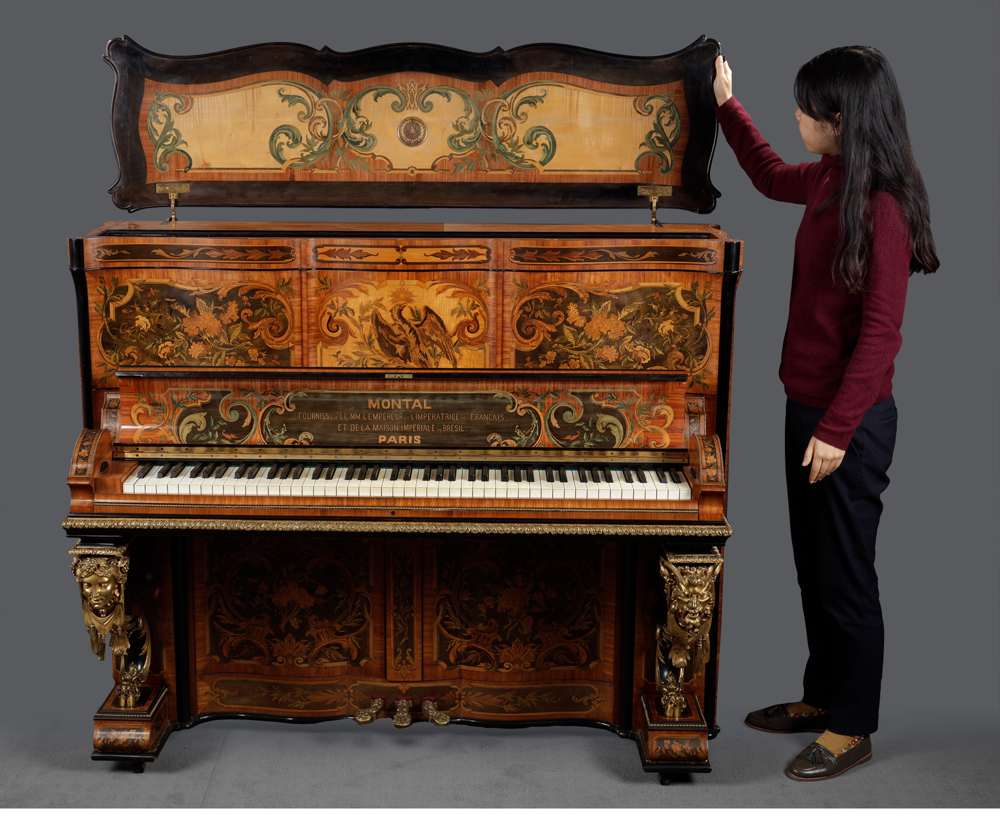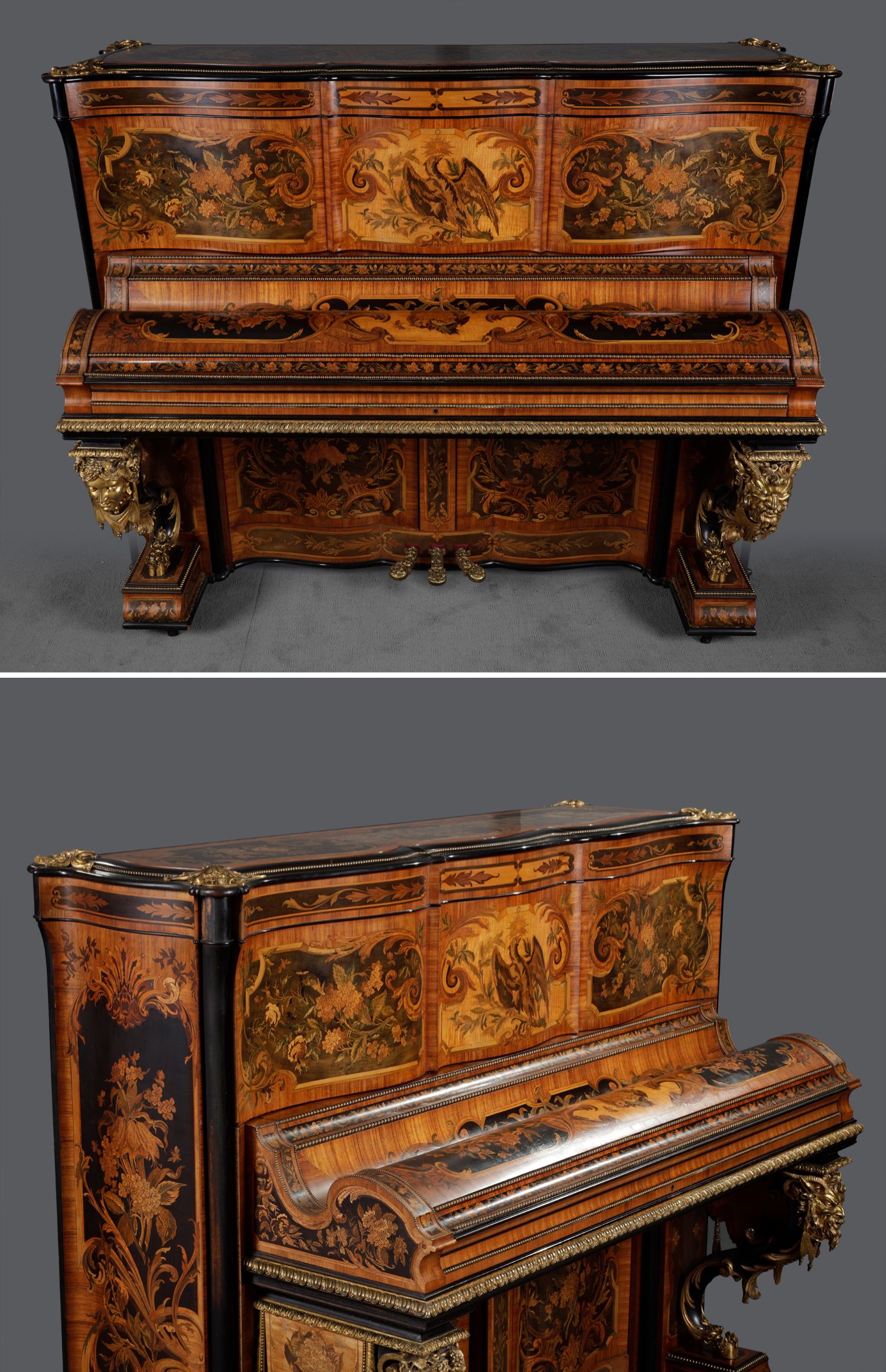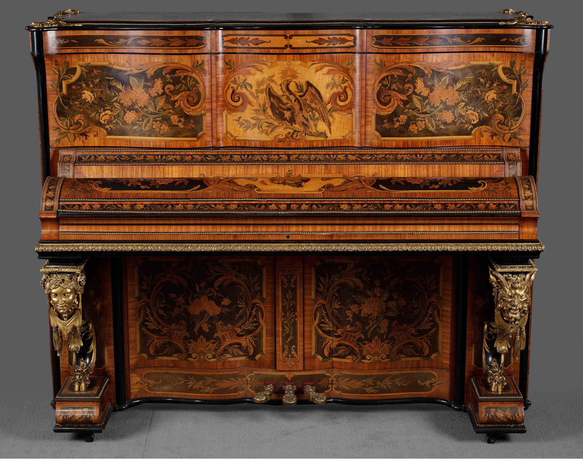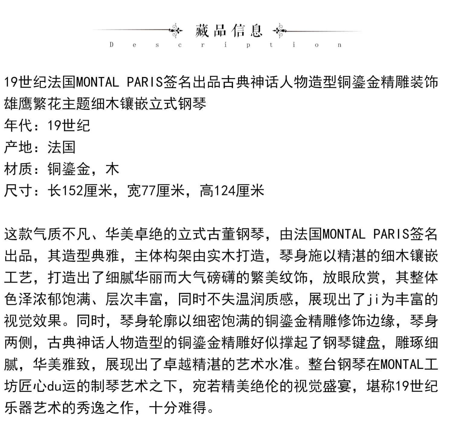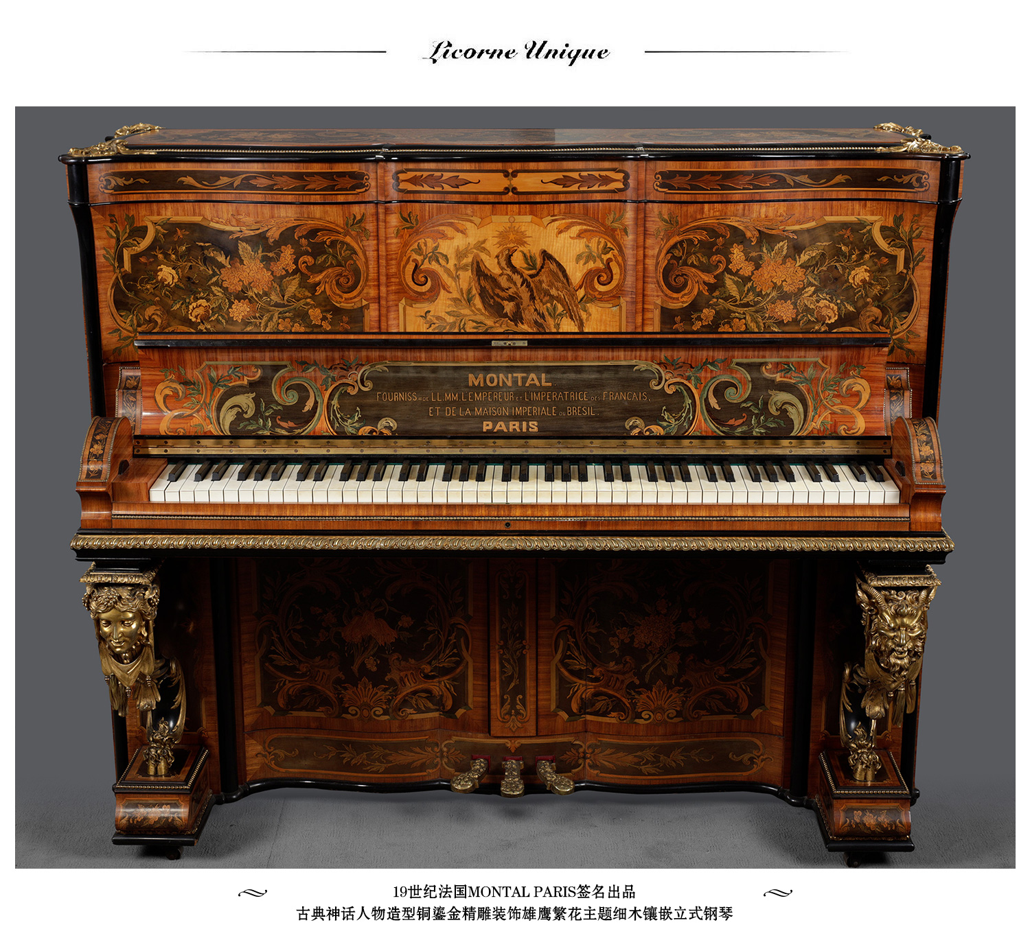 独角鹿西洋古董法国MONTAL PARIS签名铜鎏金细木镶嵌立式钢琴