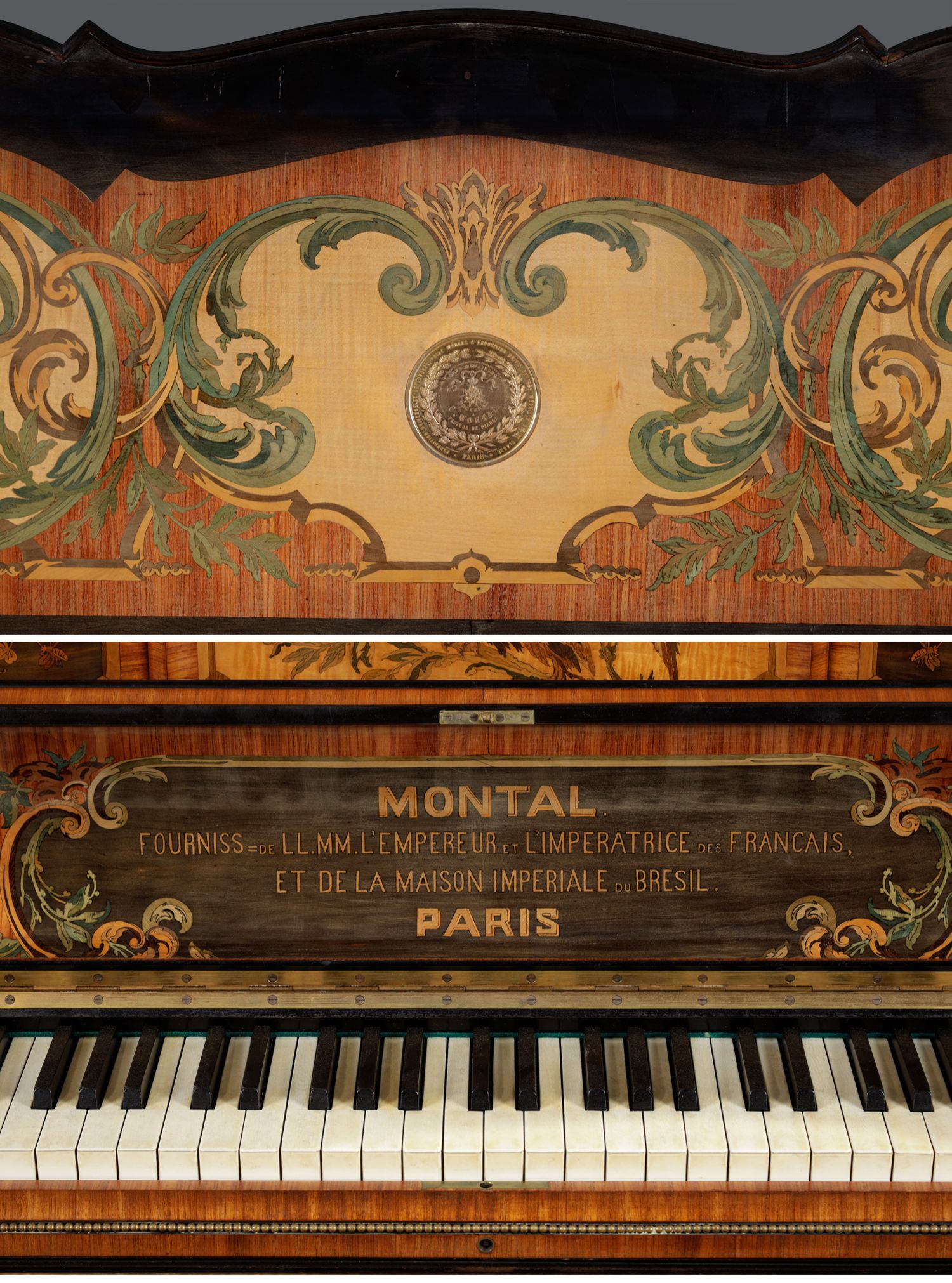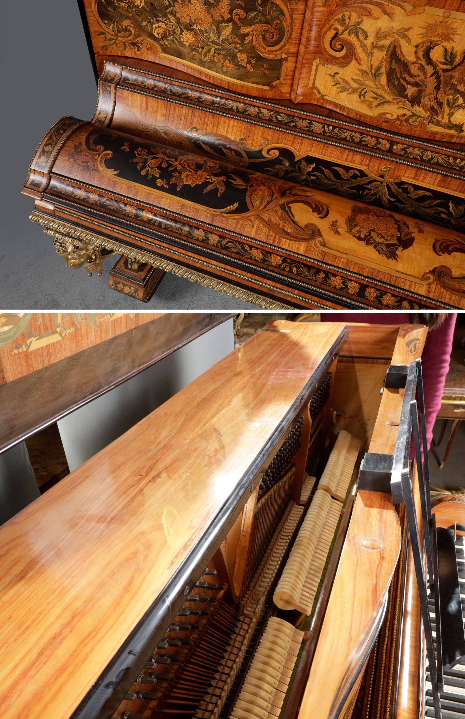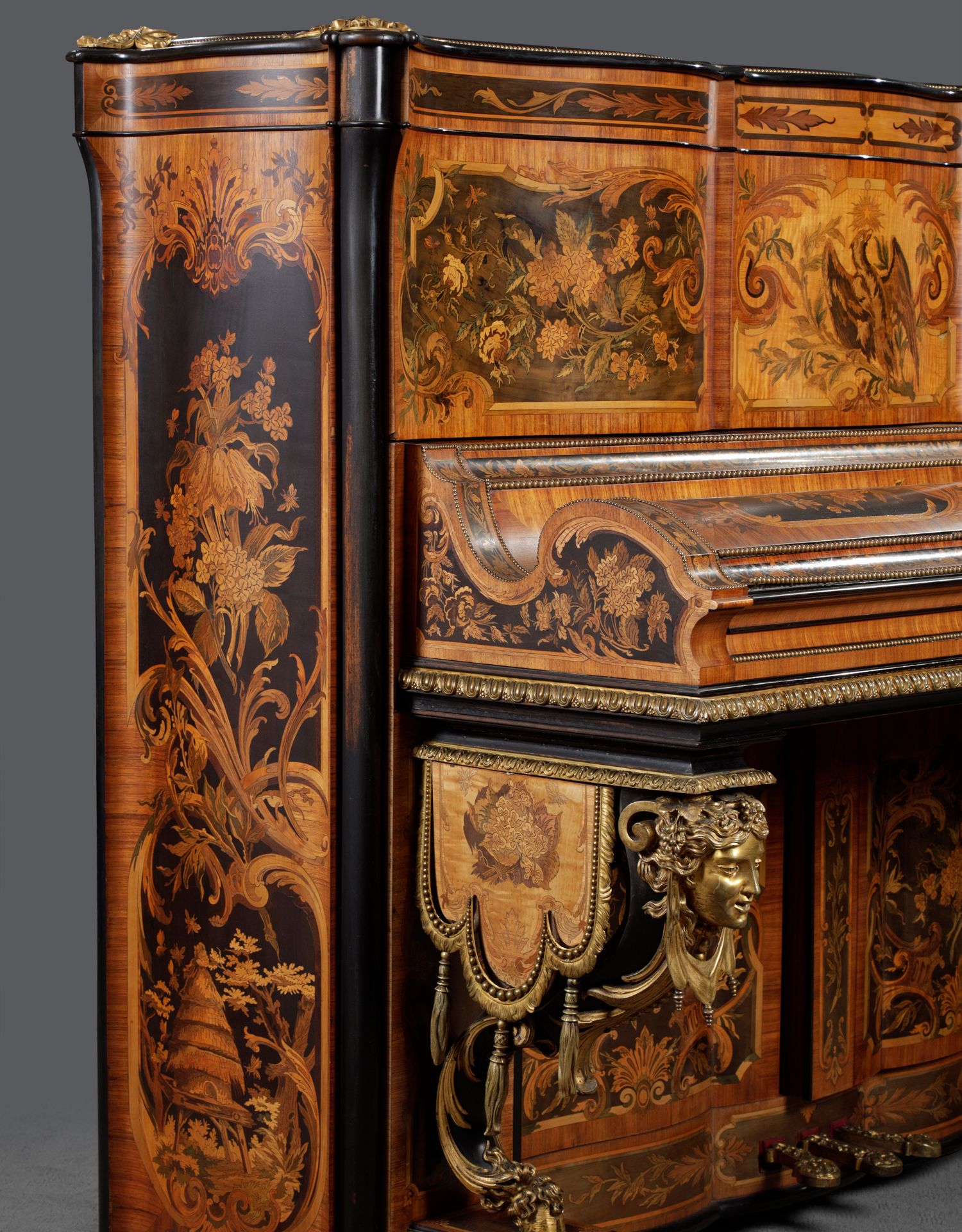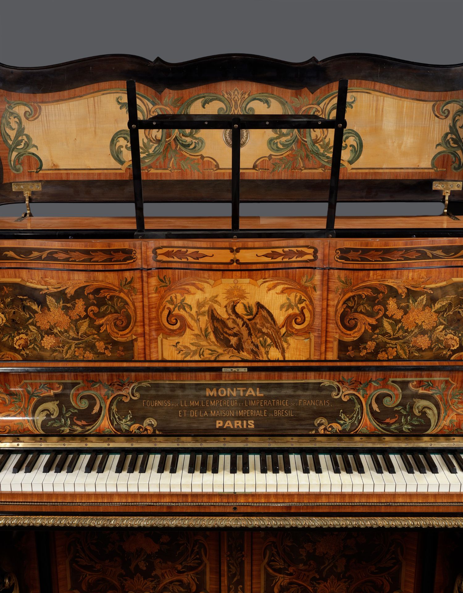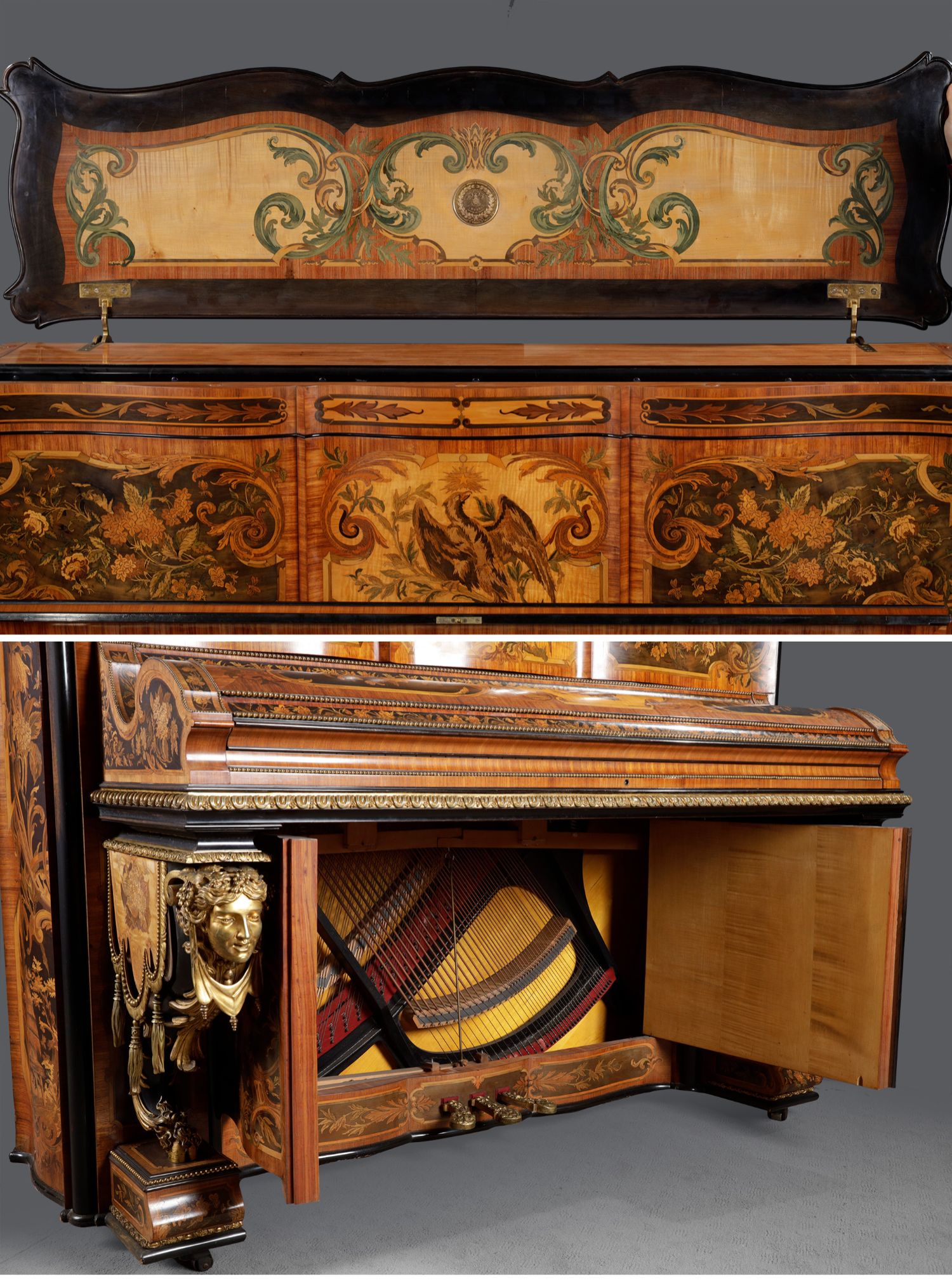 独角鹿西洋古董法国MONTAL PARIS签名铜鎏金细木镶嵌立式钢琴