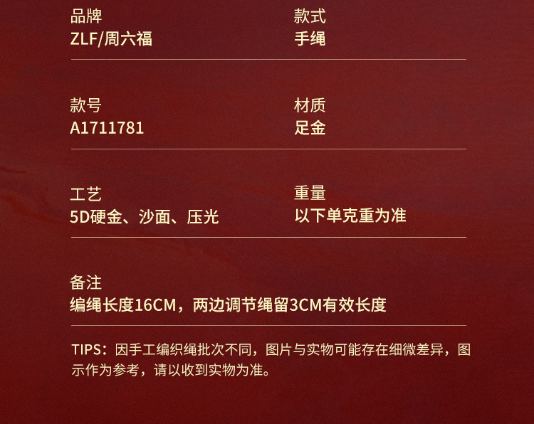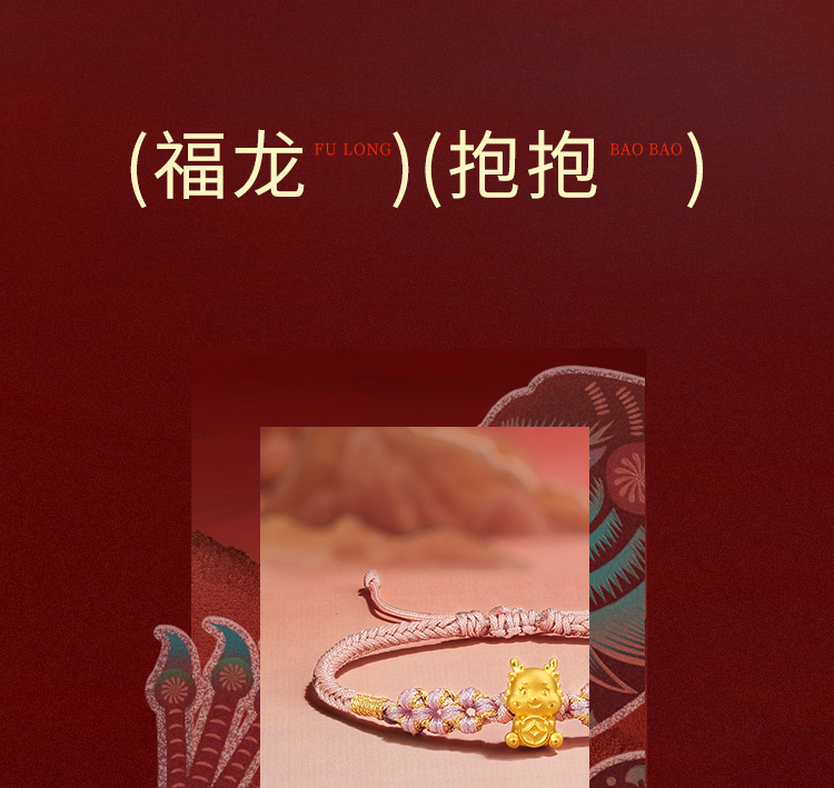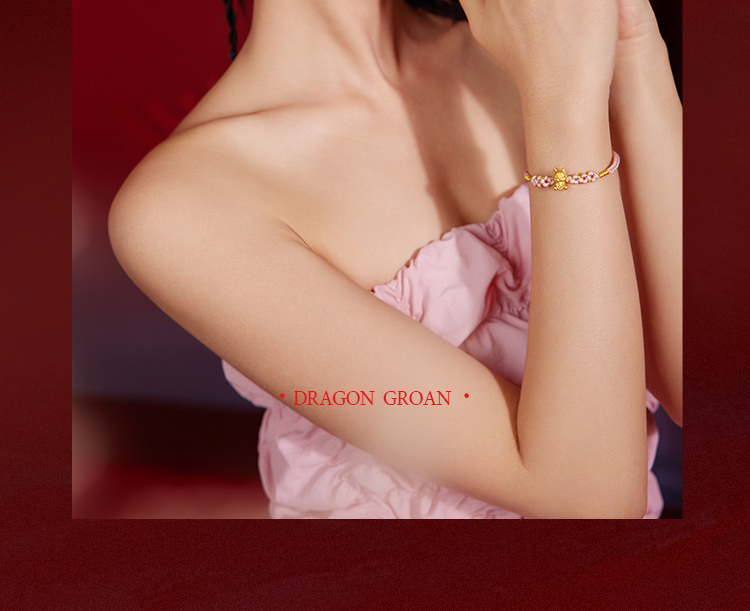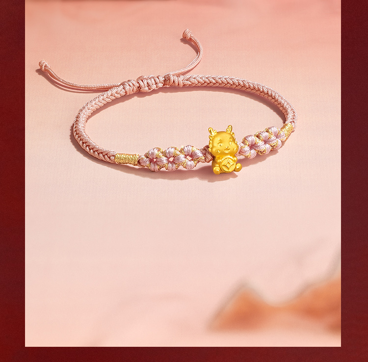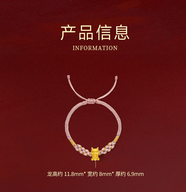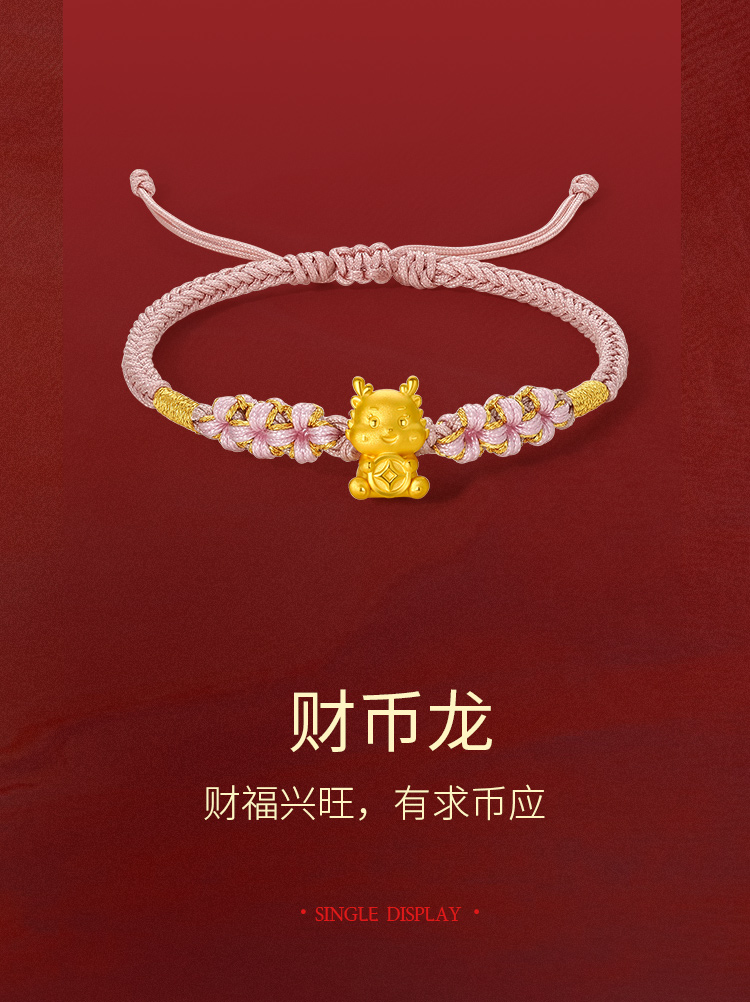 周六福5D硬金粉红手绳财币生肖龙经典花朵编绳定价足金官方手饰