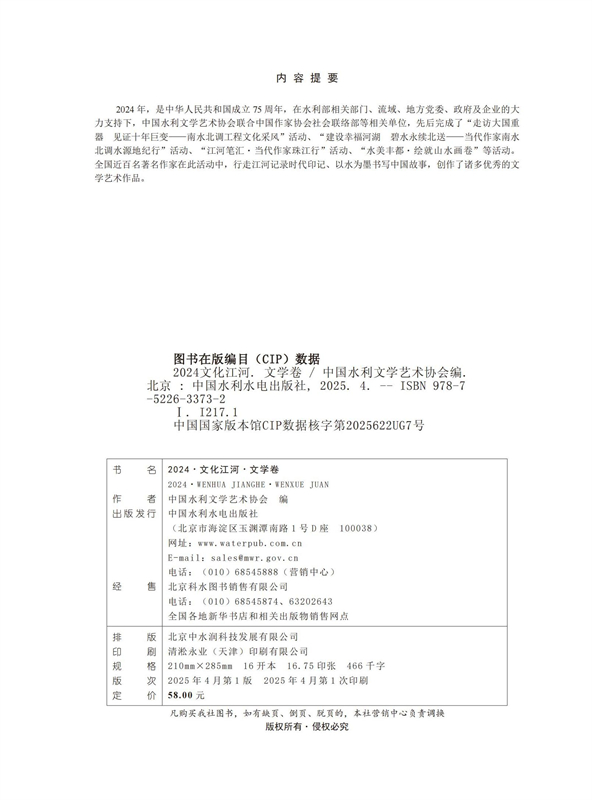 2024年,是新中国成立75周年,中国水利文学艺术协会联合中国作家协会社会联络部、《诗刊》杂志社,组织《大江文艺》杂志社、《黄河 黄土 黄种人》杂志社,在水利部相关部门、流域、地方党委政府及企业的大力支持下,先后完成了“走访大国重器 见证十年巨变——南水北调工程文化采风活动”活动、“建设幸福河湖 碧水永续北送·当代作家南水北调水源地纪行”活动、“江河笔汇·当代作家珠江行”活动以及“水美丰都·文学艺术创作”活动。全国近百名著名作家、水利系统的作家在此活动中,行走江河记录时代印记、以水为墨书写中国故事,创作了诸多优秀的文学艺术作品。中国水利文学艺术协会委托中国水利水电出版社将活动成果编辑出版,以飨读者。本书是2024年文化江河之一文化卷。
