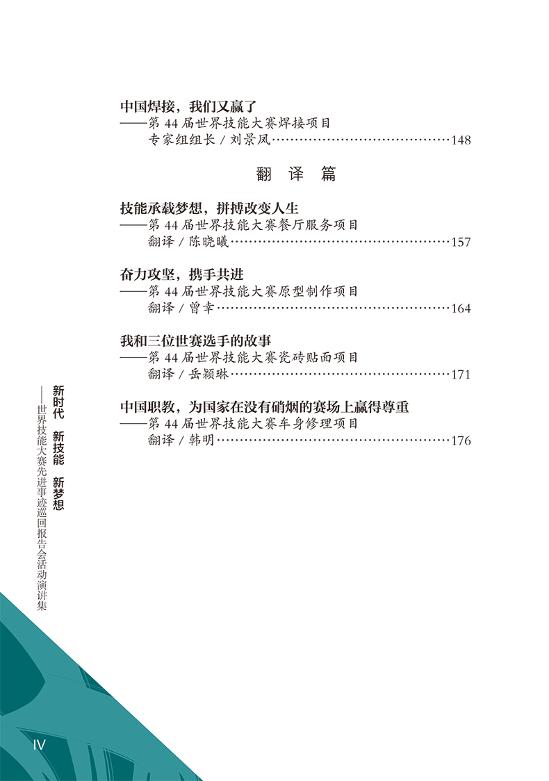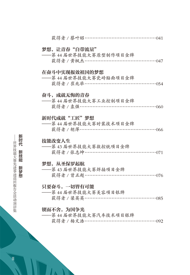 为宣传本次世界技能大赛先进事迹,充分地展现选手及专家、教练、翻译的风采,让社会更广泛地了解世界技能大赛先进事迹巡回报告会内容,我们组织编写了本书。书中的内容为选手及专家、教练、翻译在活动中的演讲报告,每个人的演讲都发自肺腑、生动感人,充分展现了技能成就梦想的拼搏经历。希望他们的经历能更好地激发青年人的报国热情,促进技能水平的提升。