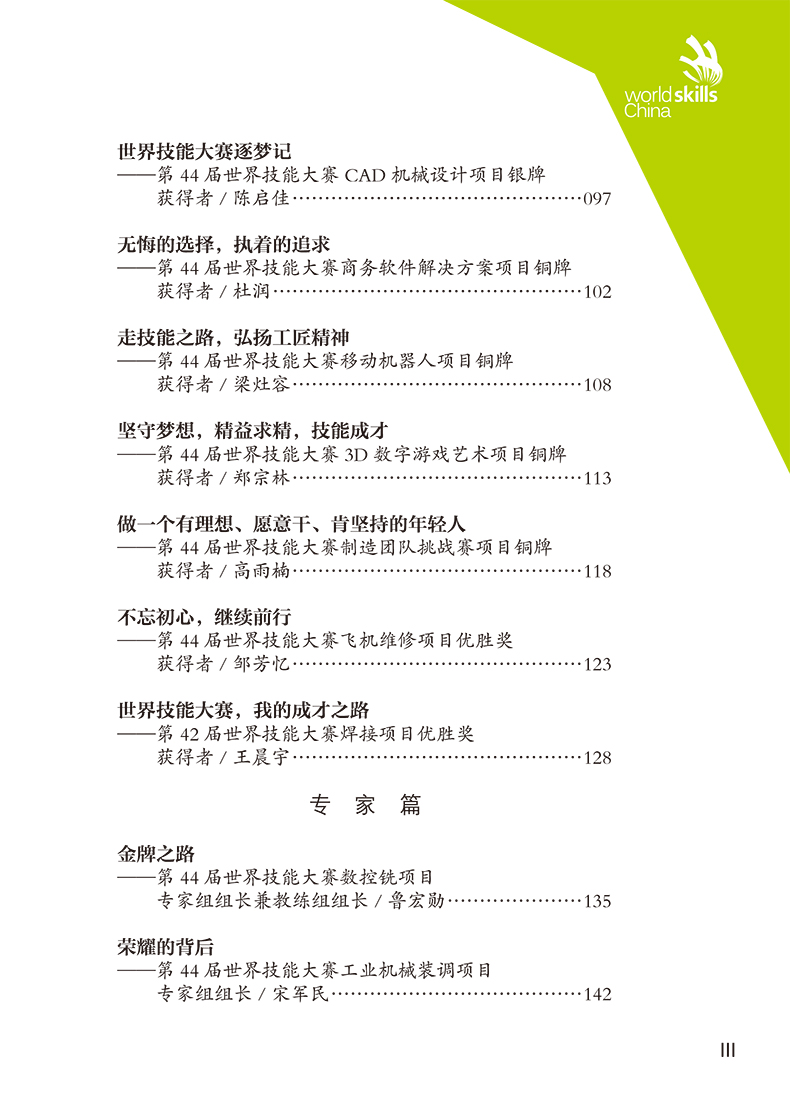 扫码看视频:图书内容为30位历届世界技能大赛参赛获奖选手以及专家、教练或翻译的先进事迹报告,书中配以二维码,扫码可观看演讲视频。