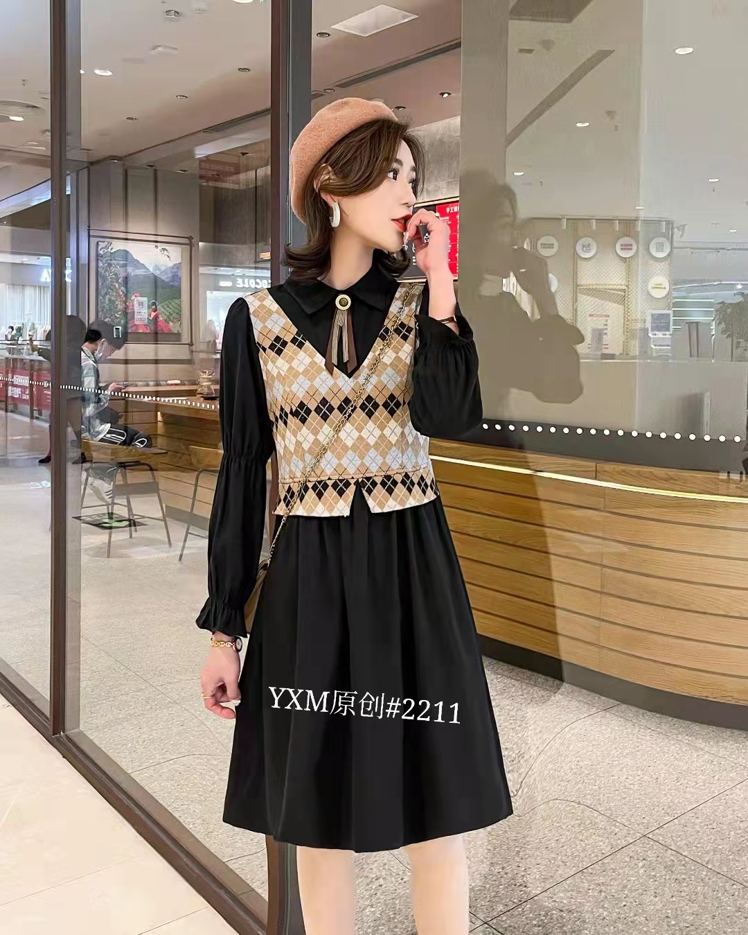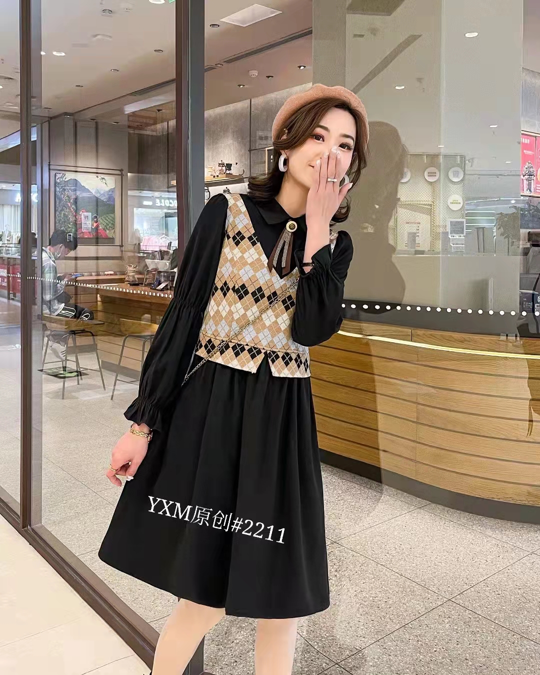 友希媚2211款今年爆款假两件套连衣裙有弹性穿着舒服有气质,面料透气性好,颜色焦糖色和黑色尺码m到2X从90斤穿到140斤