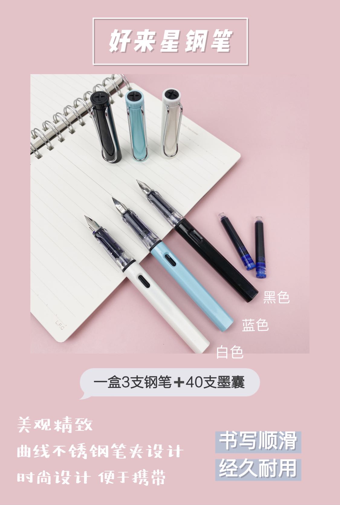 开学季福利!【3支钢笔+40支墨囊】好来星小学生优渥书法用练字儿童可替换墨水