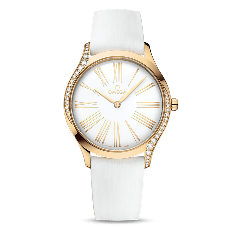 镜面材质 | 蓝宝石水晶玻璃 | 表盘 | Moonshine 18K金表壳,表壳两侧曲线优雅铺镶38颗全切割钻石。白色表盘饰有浮雕罗马数字,搭配Moonshine 18K金钻石抛光指针,表冠镶饰一颗钻石,周围环绕着由5个欧米茄品牌标识相互交叠而成的红色陶瓷花朵图案。 |
