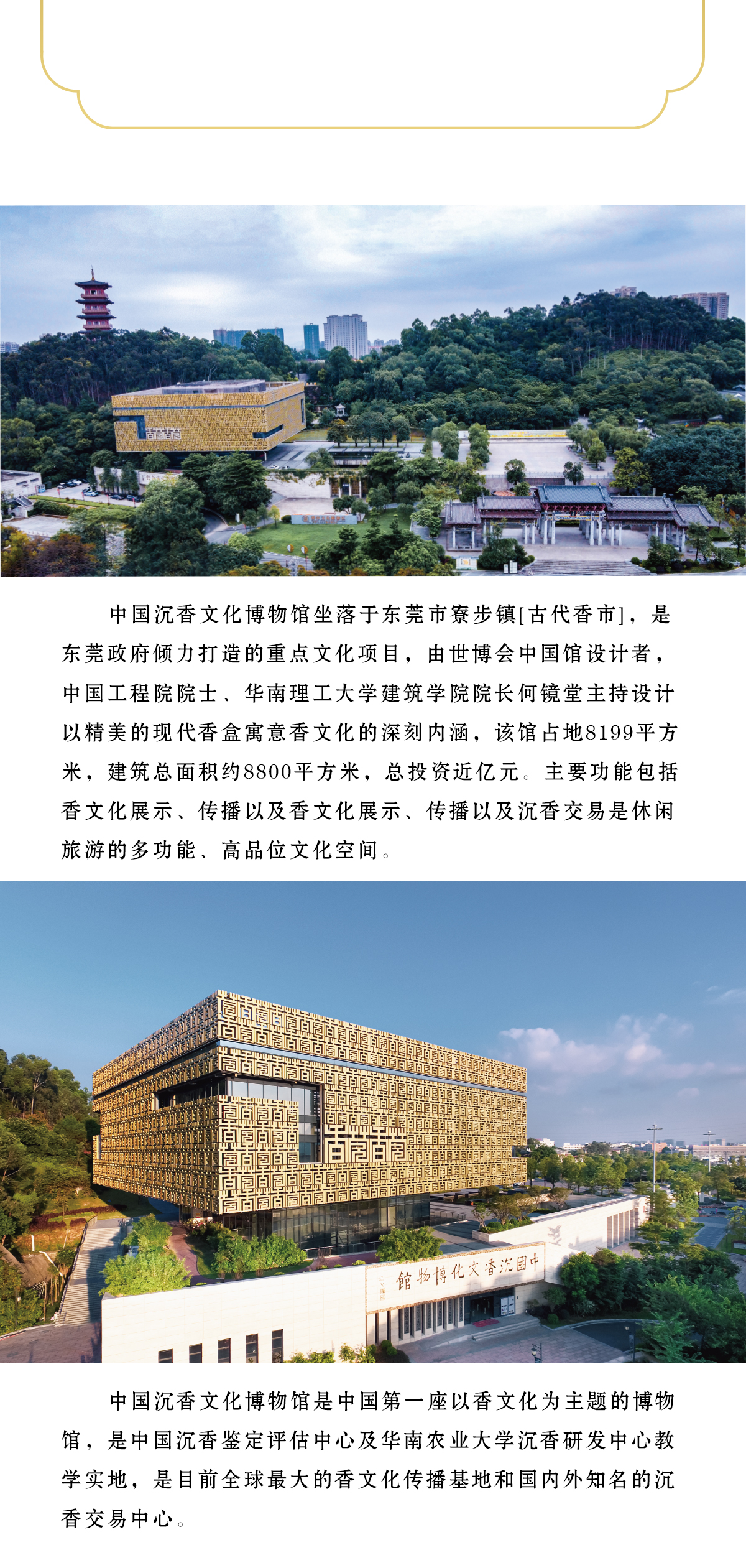 中国沉香文化博物馆坐落于古代[香市]东莞市寮步镇,是东莞政府倾力打造的重点文化项目,由世博会中国馆设计者,中国工程院院士、华南理工大学建筑学院院长何镜堂主持设计,以精美的现代[香盒]寓意香文化的深刻内