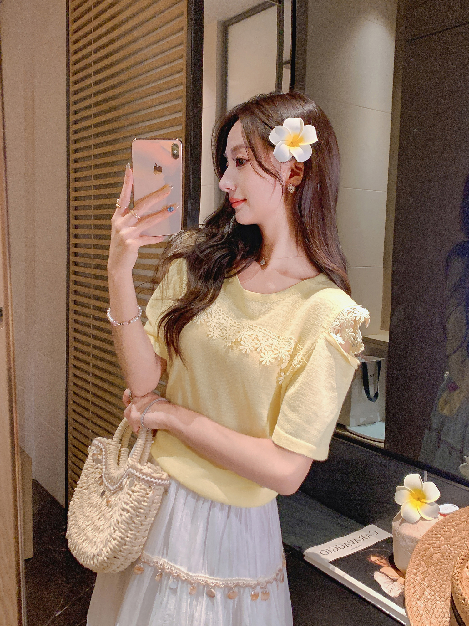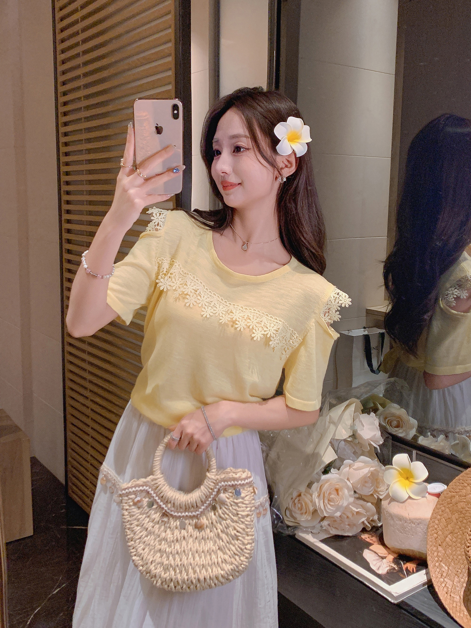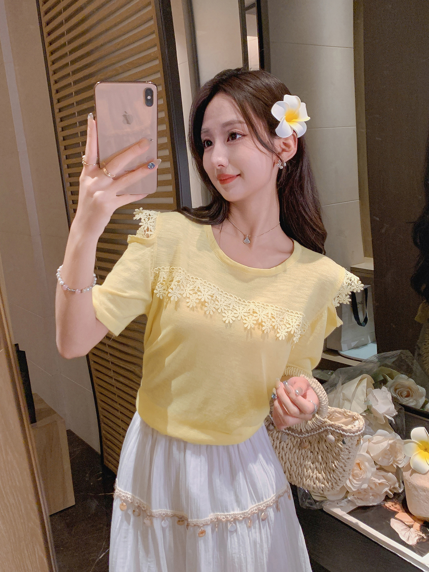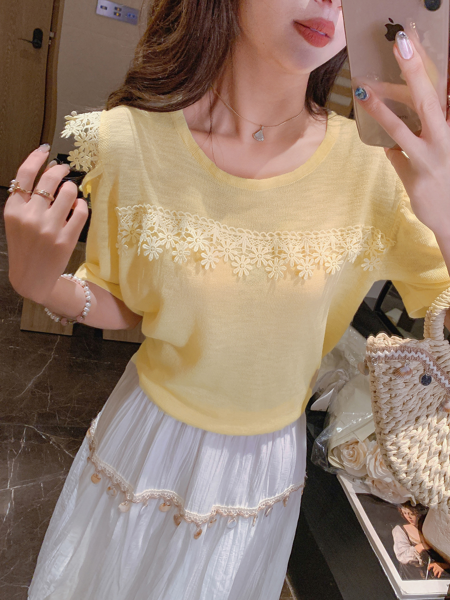 张心子【奶黄雏菊T】圆领冰丝拼接蕾丝气质上衣 U2505023