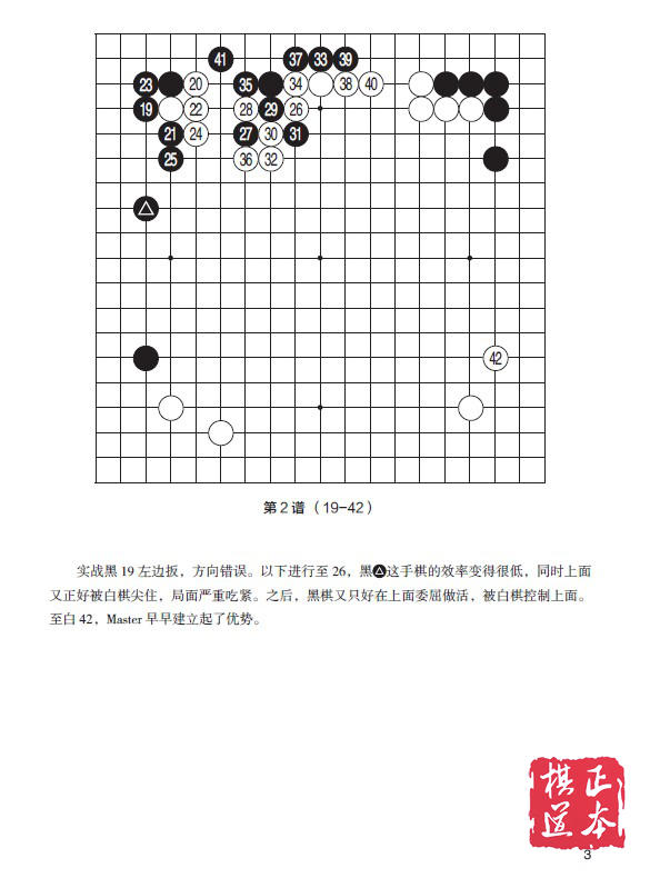 第1谱 (1-24) 这个布局不多说,已经第三次出现了,人类都是白棋的一方。可见在黑5大飞的情况下,以前黑棋这么下是很少见的。至2 3,布局和“重逢时”的那盘是一样的。不同的是,白24直接反击了。