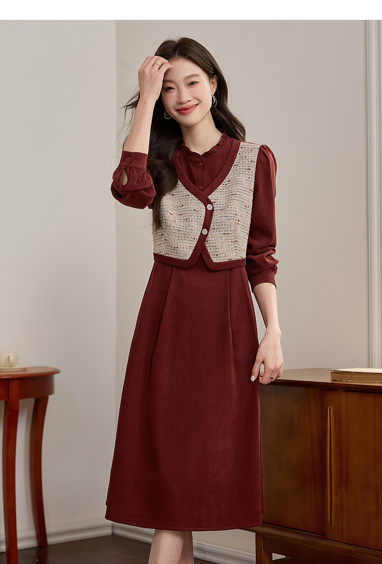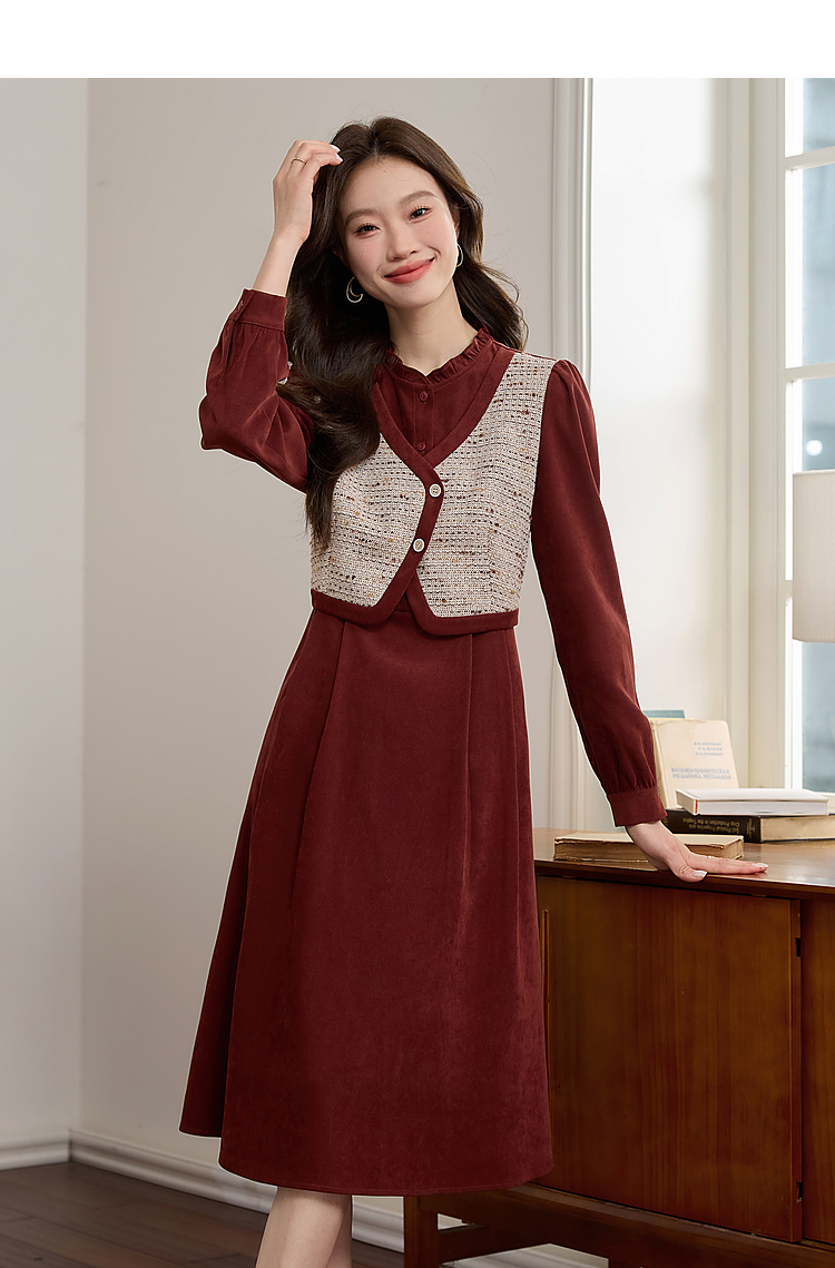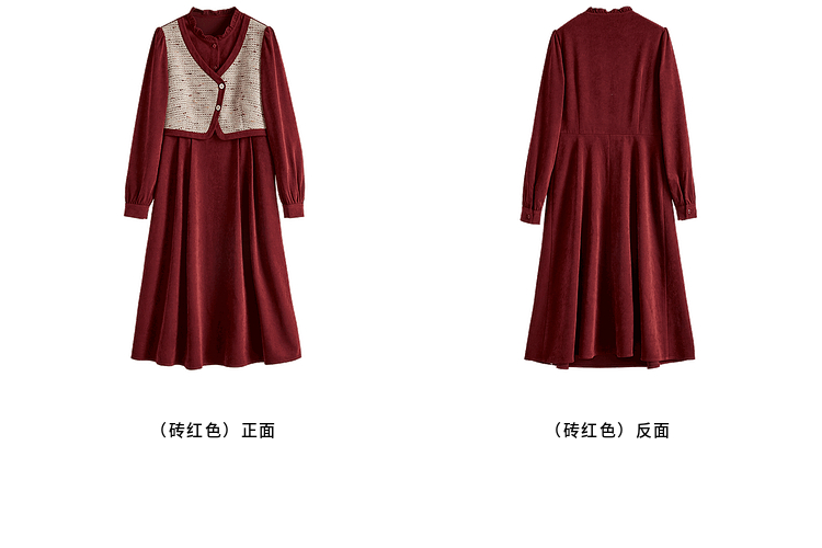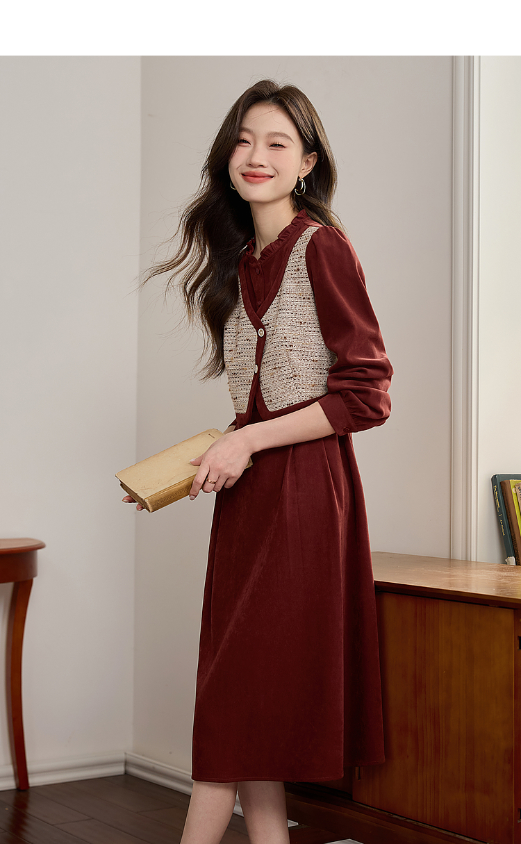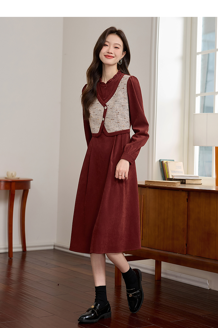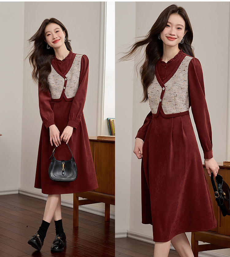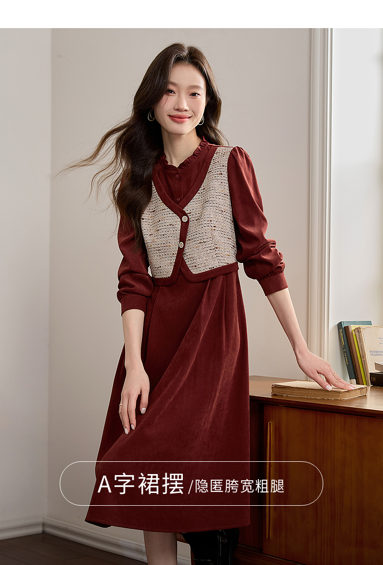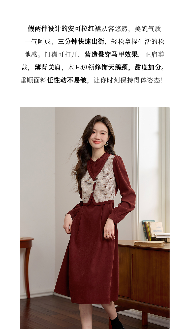 【专属特价】熙世界法式假两件红色连衣裙女长袖2025冬季新款马甲拼接气质裙子
