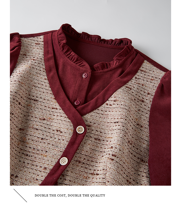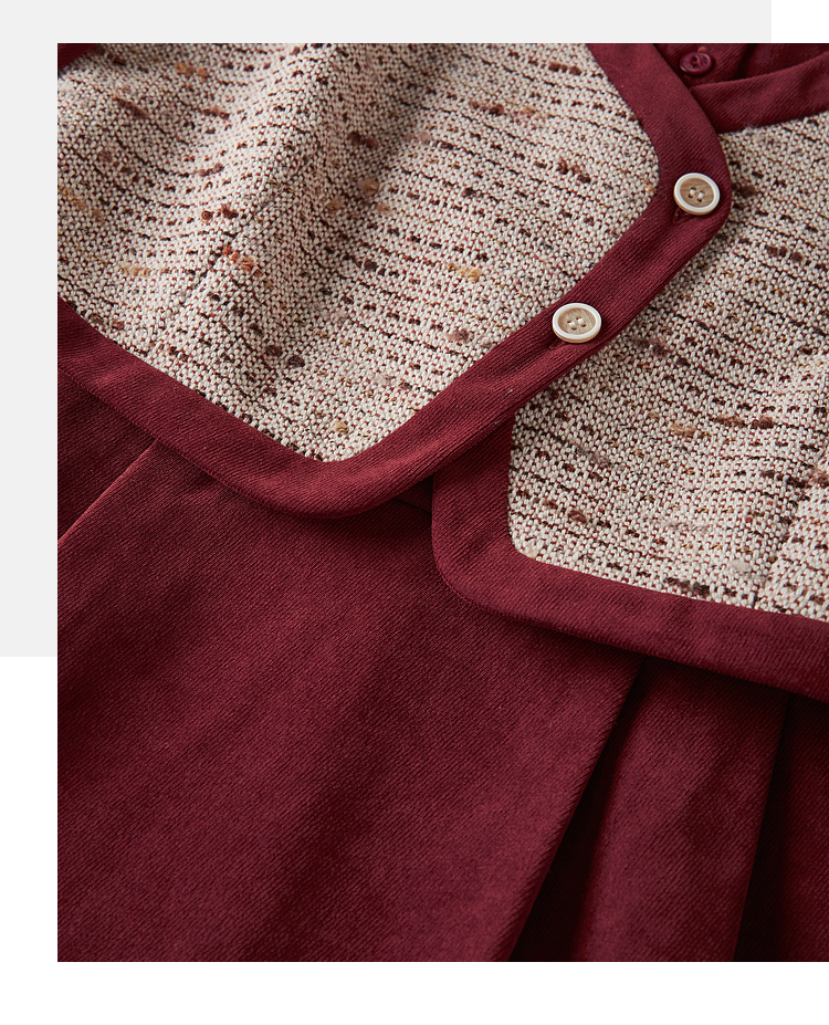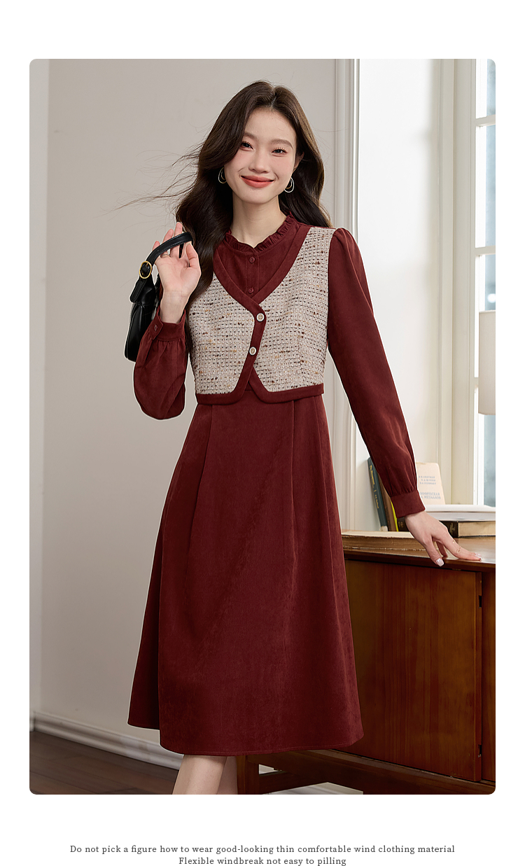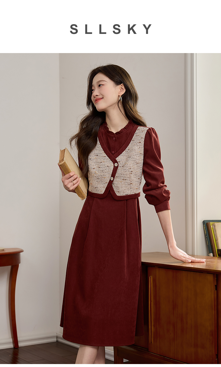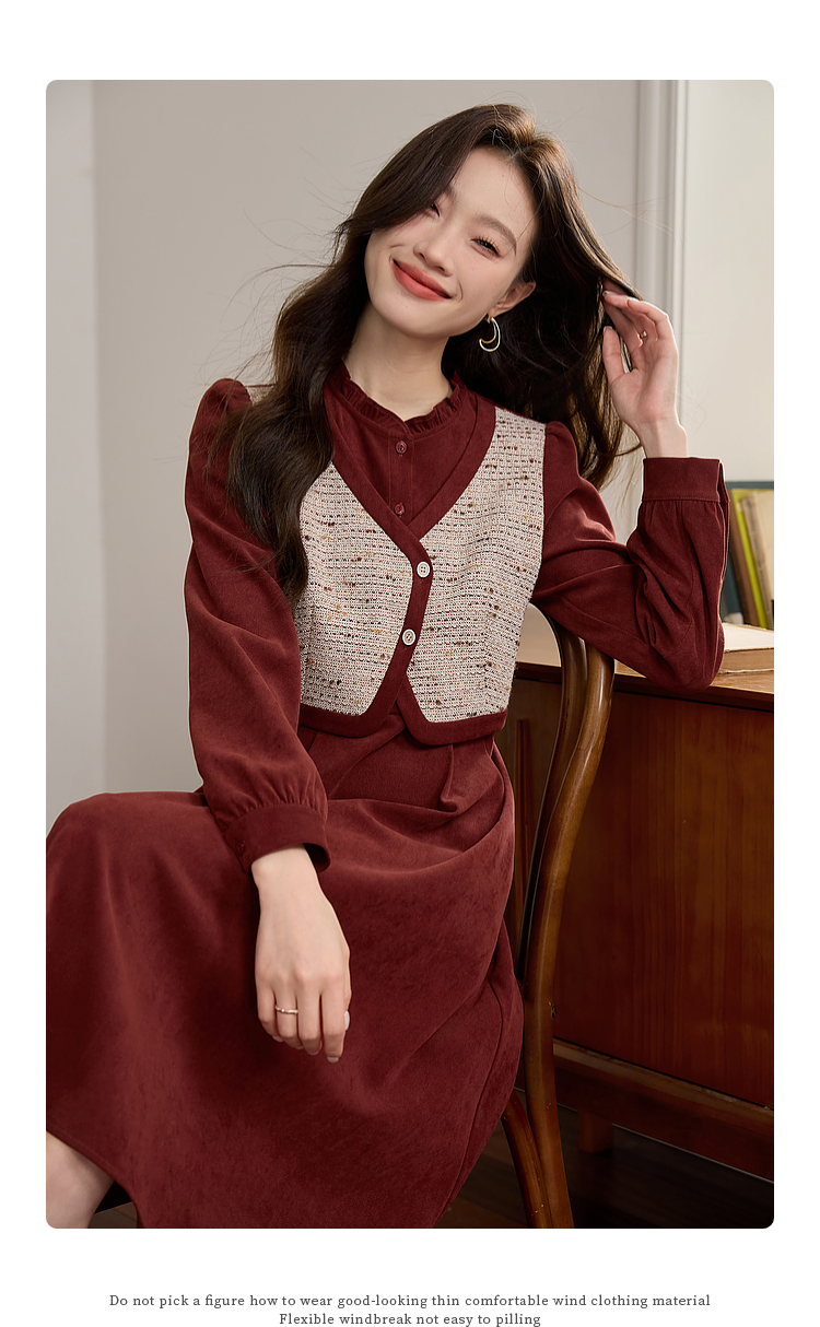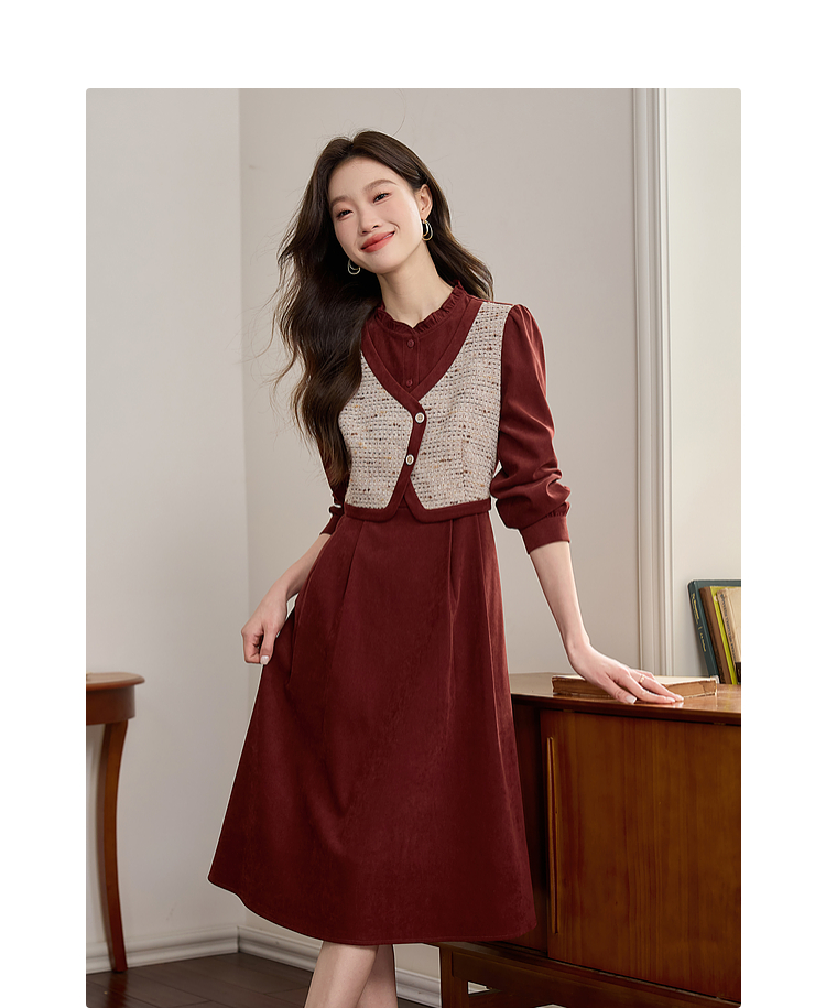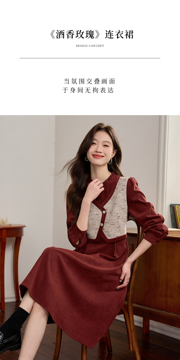 【专属特价】熙世界法式假两件红色连衣裙女长袖2025冬季新款马甲拼接气质裙子