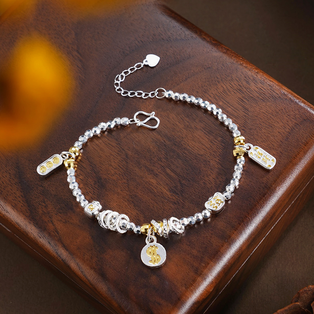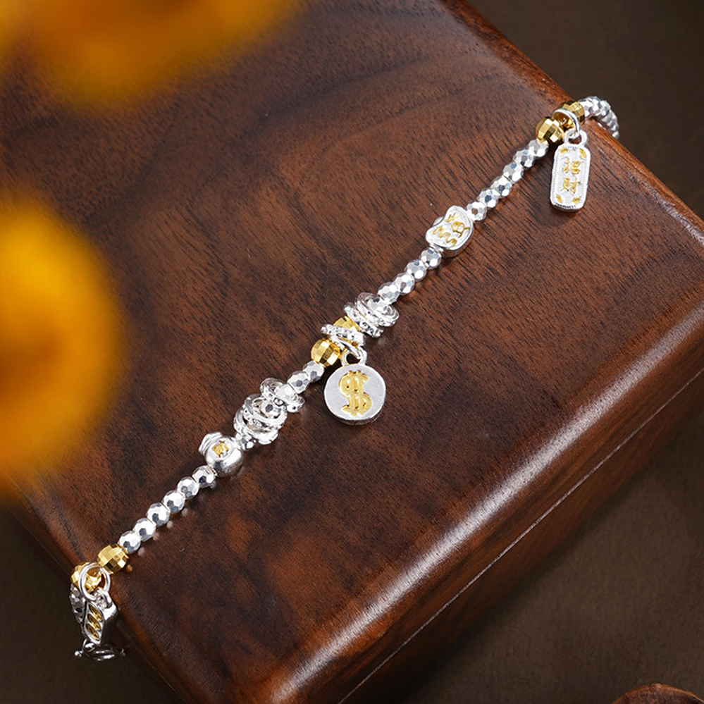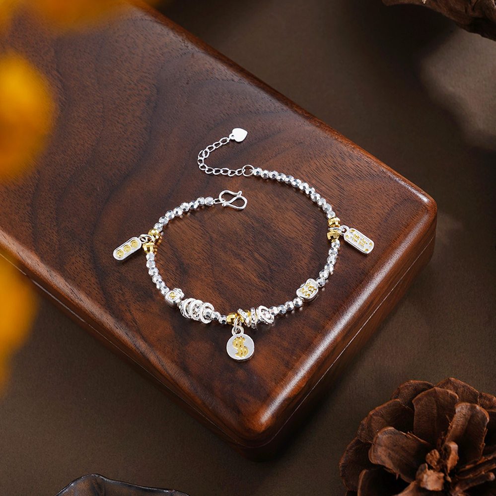 【寓意】:以纯银精铸手链,缀以美金、元宝、铜钱等吉祥坠饰,取“财源广聚”之吉兆,寓事业通达、财路亨通,福运恒久。