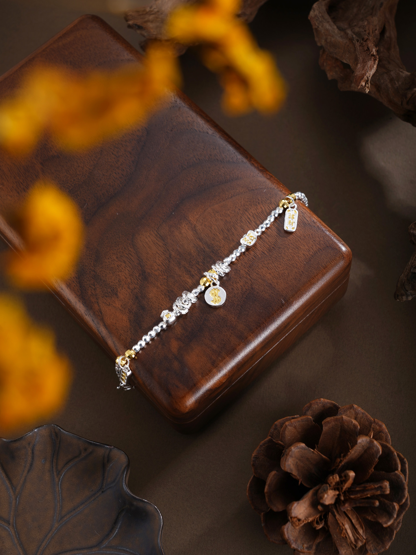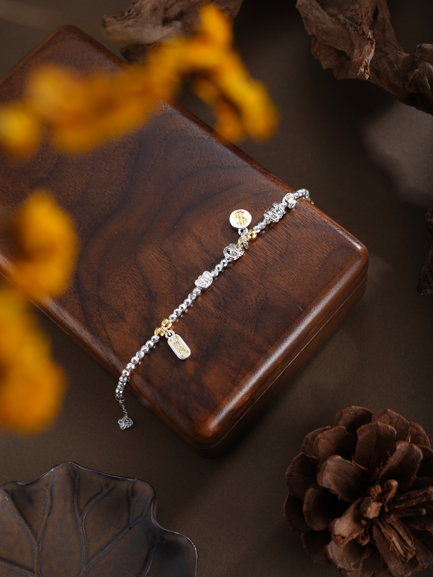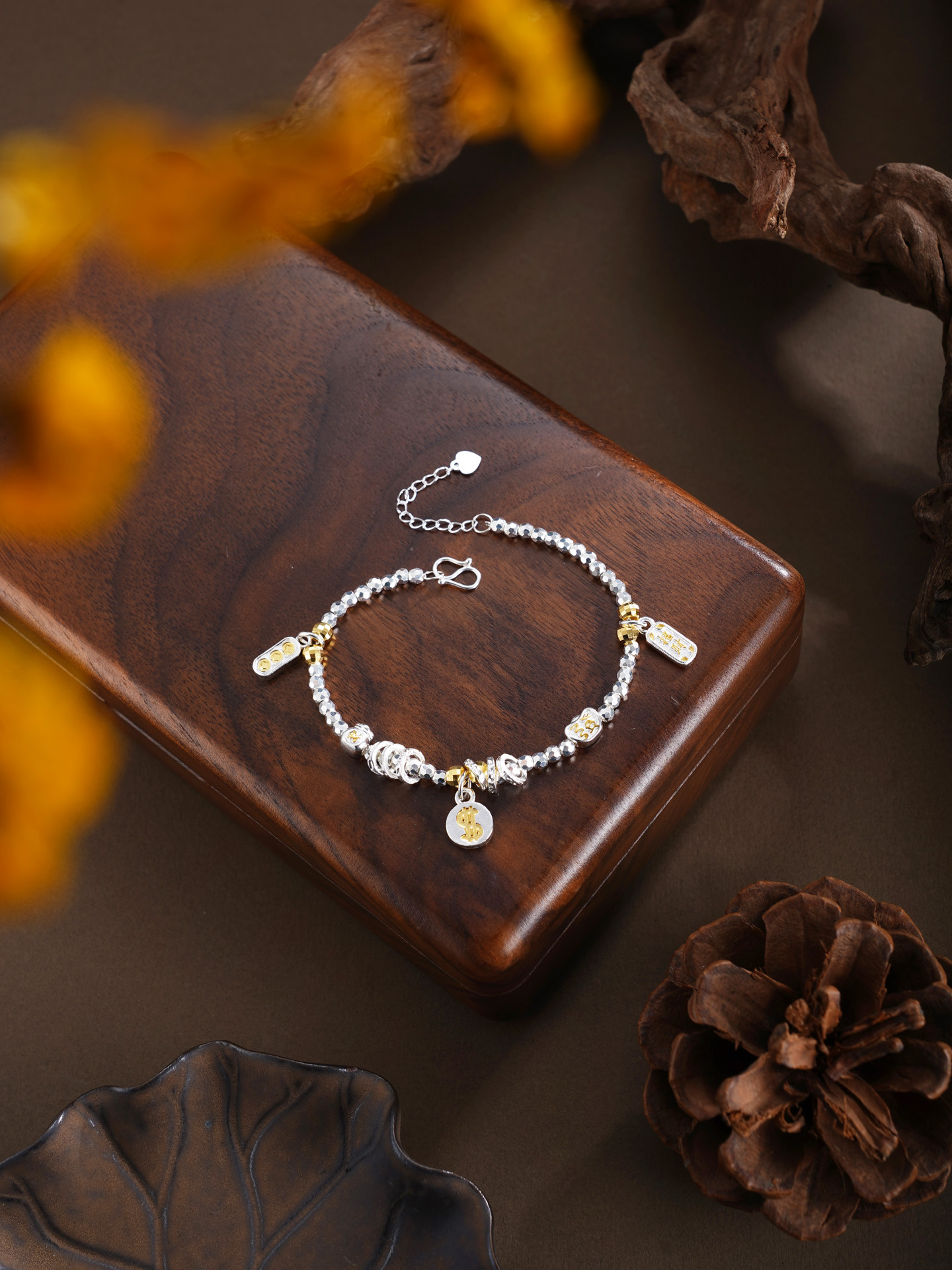 【寓意】:以纯银精铸手链,缀以美金、元宝、铜钱等吉祥坠饰,取“财源广聚”之吉兆,寓事业通达、财路亨通,福运恒久。