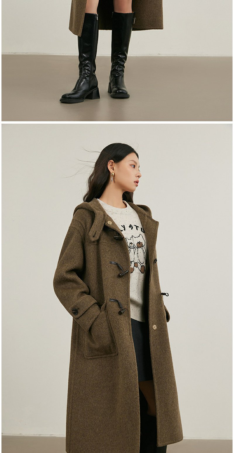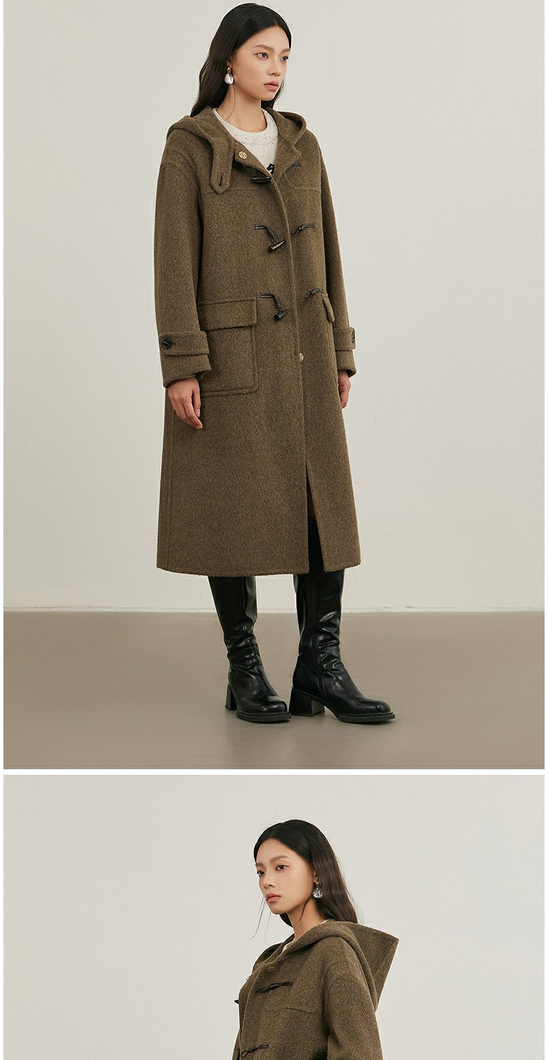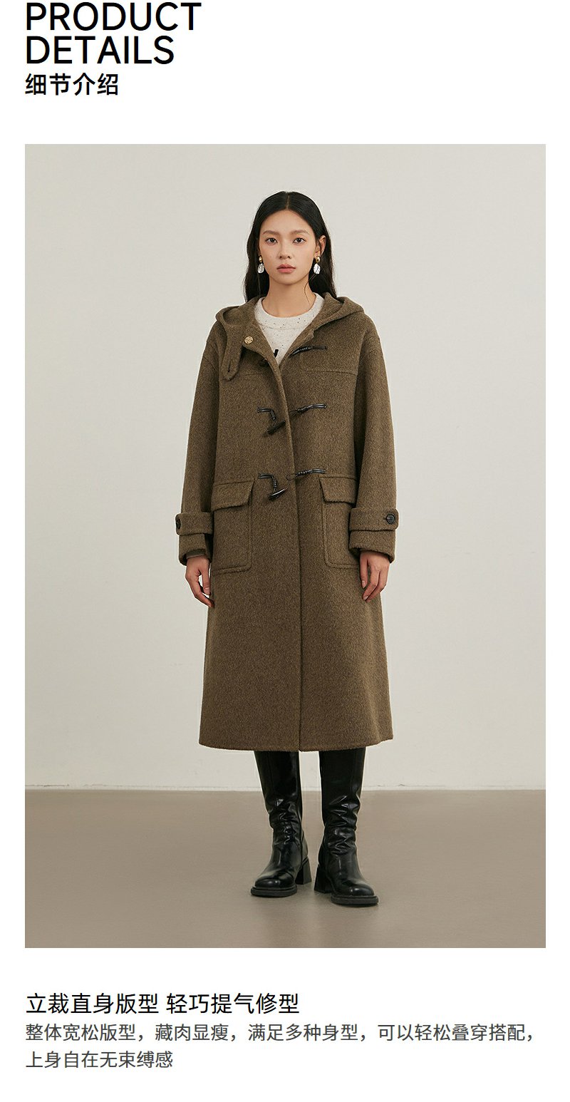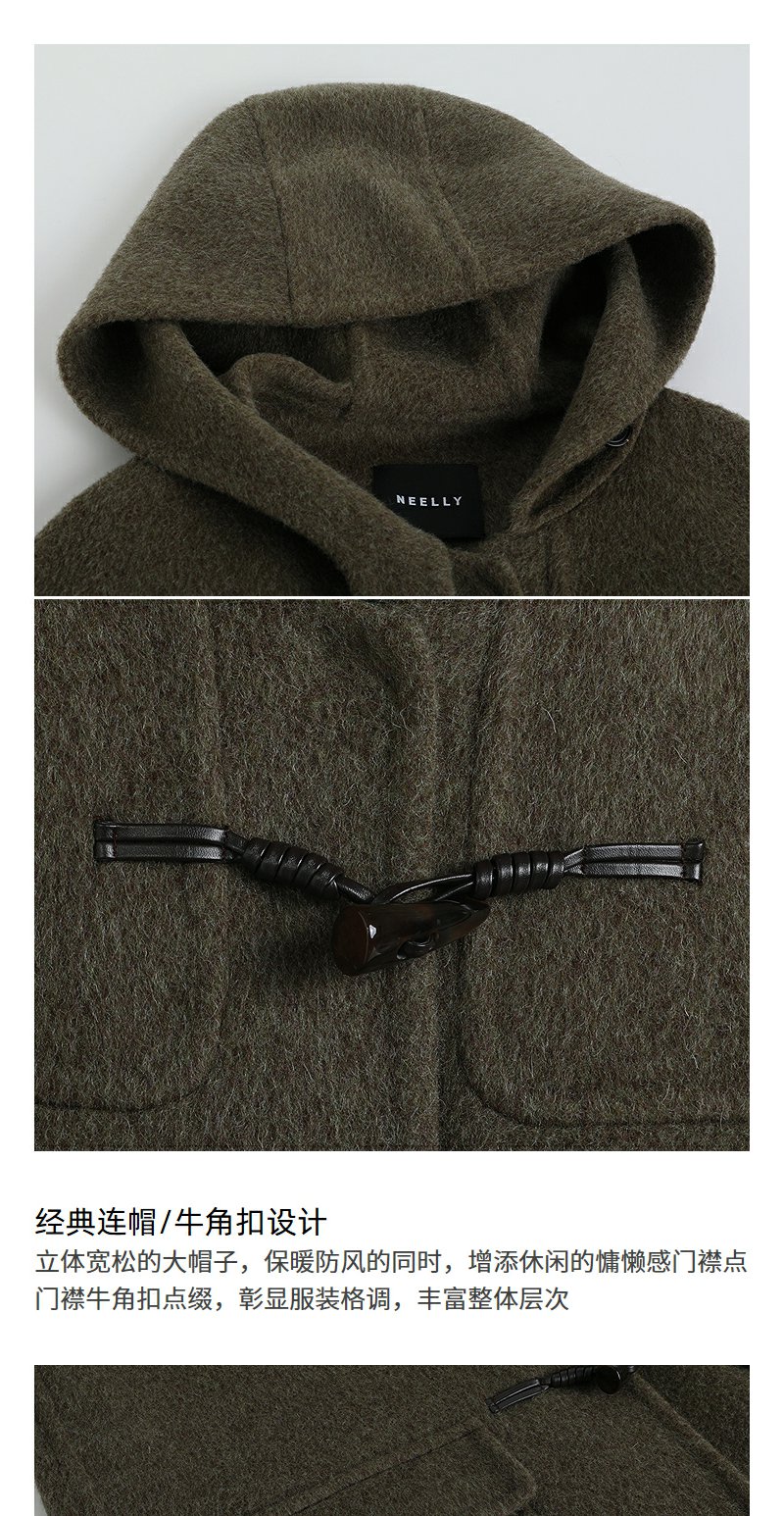 NEELLY纳俪商场同款冬季新款减龄连帽牛角扣长款双面呢大衣保暖女N25114N04607