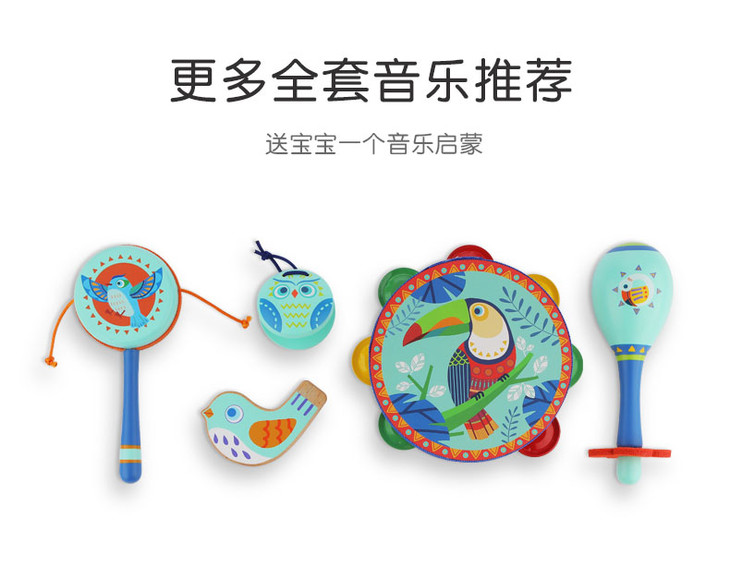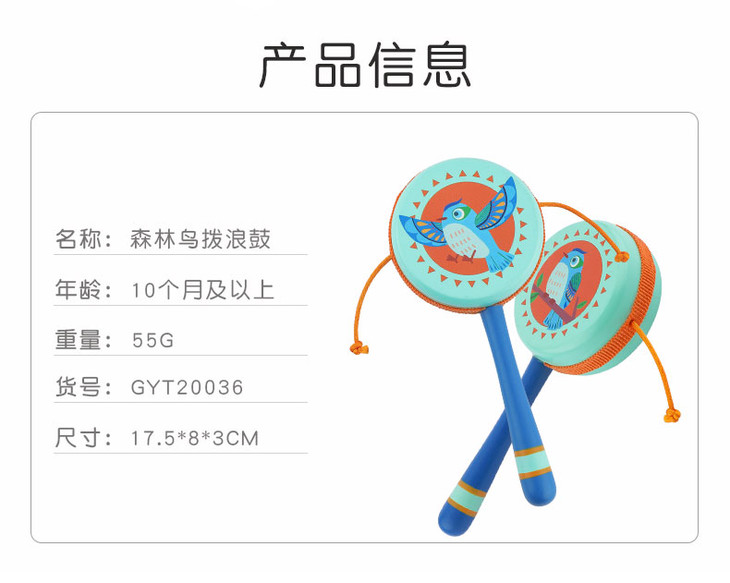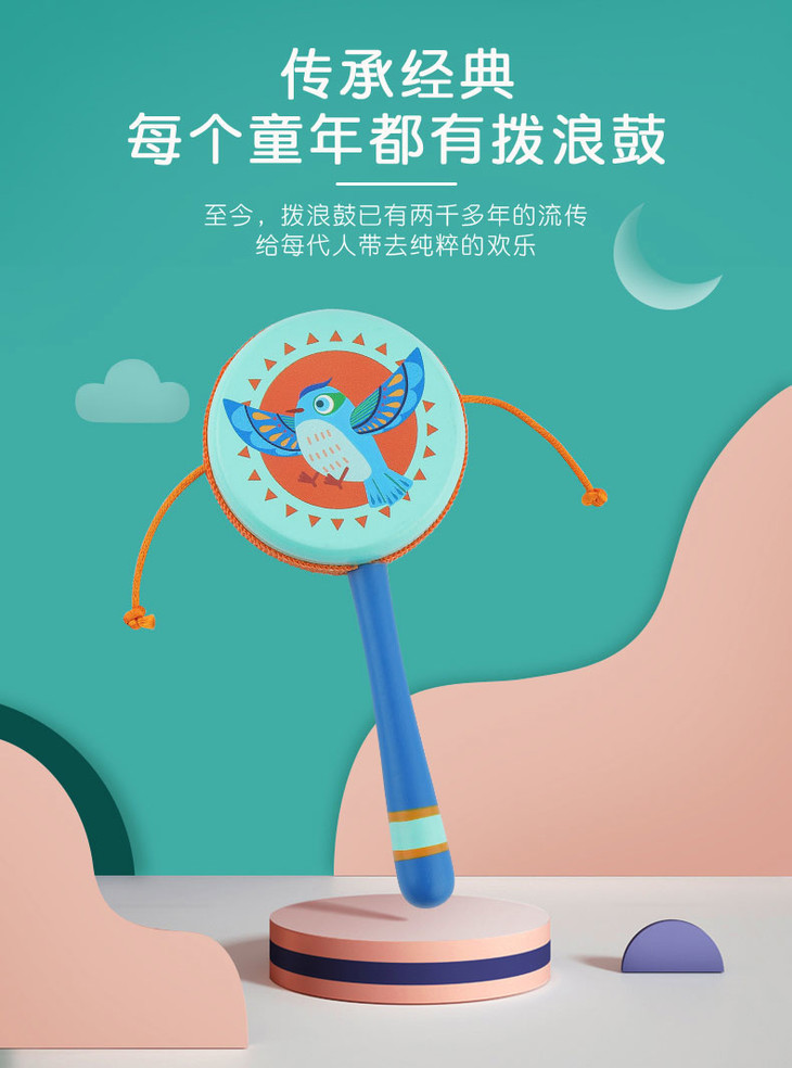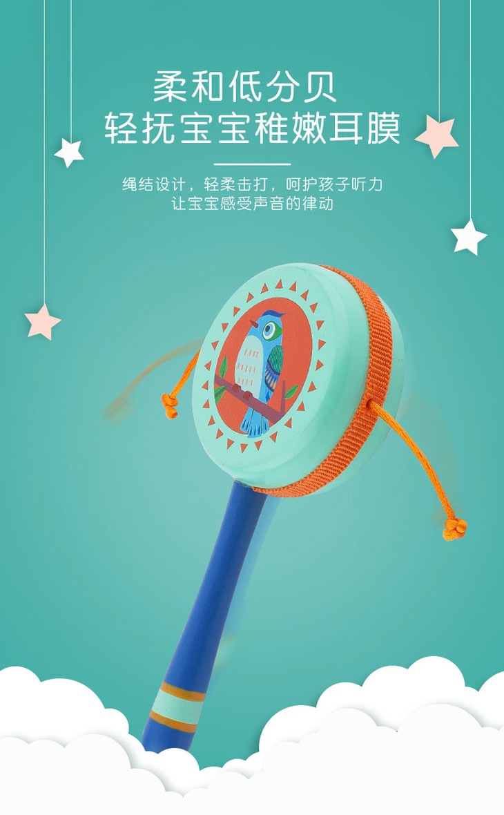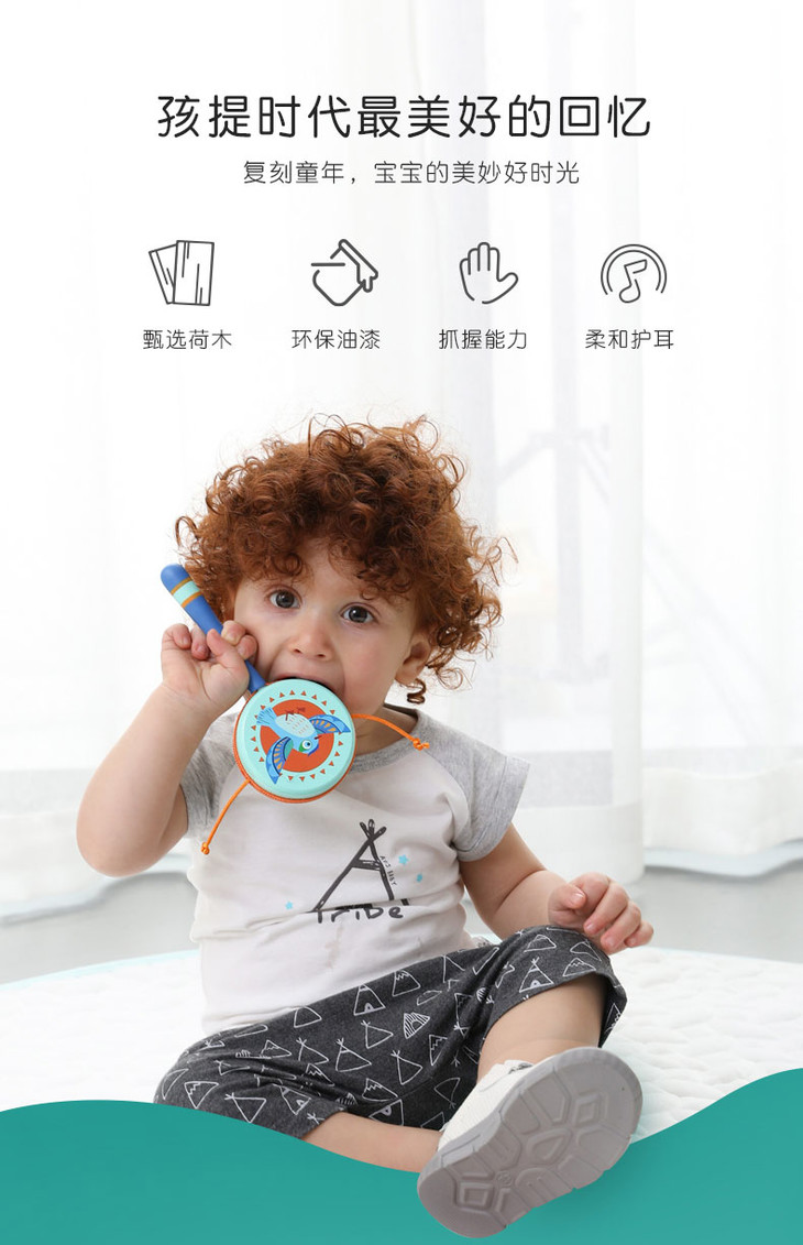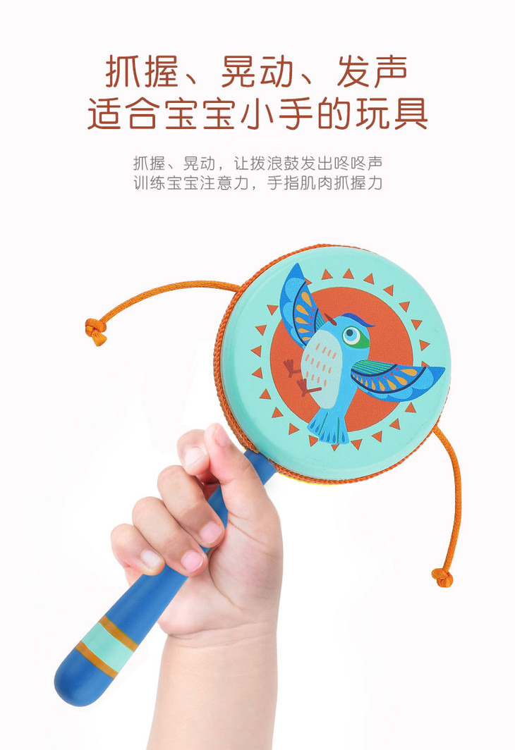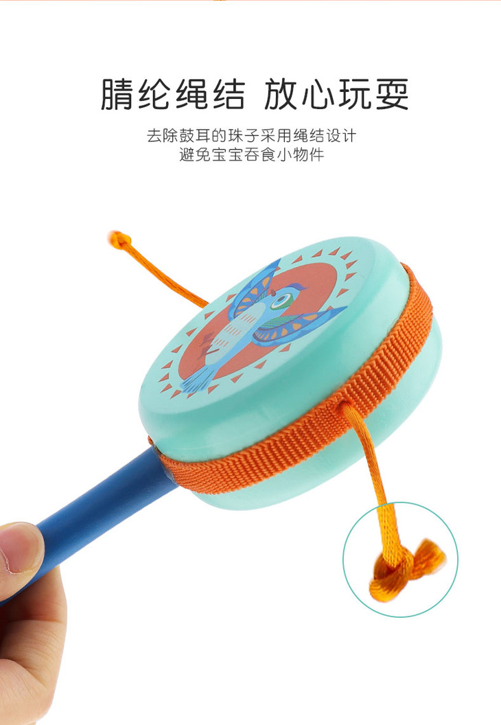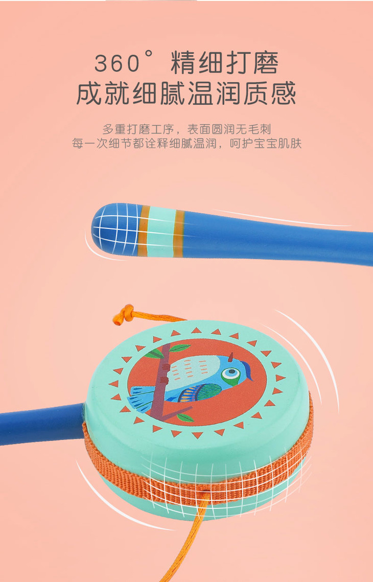 菲加尼婴儿传统木质拨浪鼓可啃咬0-1岁宝宝男女孩手摇鼓音乐玩具