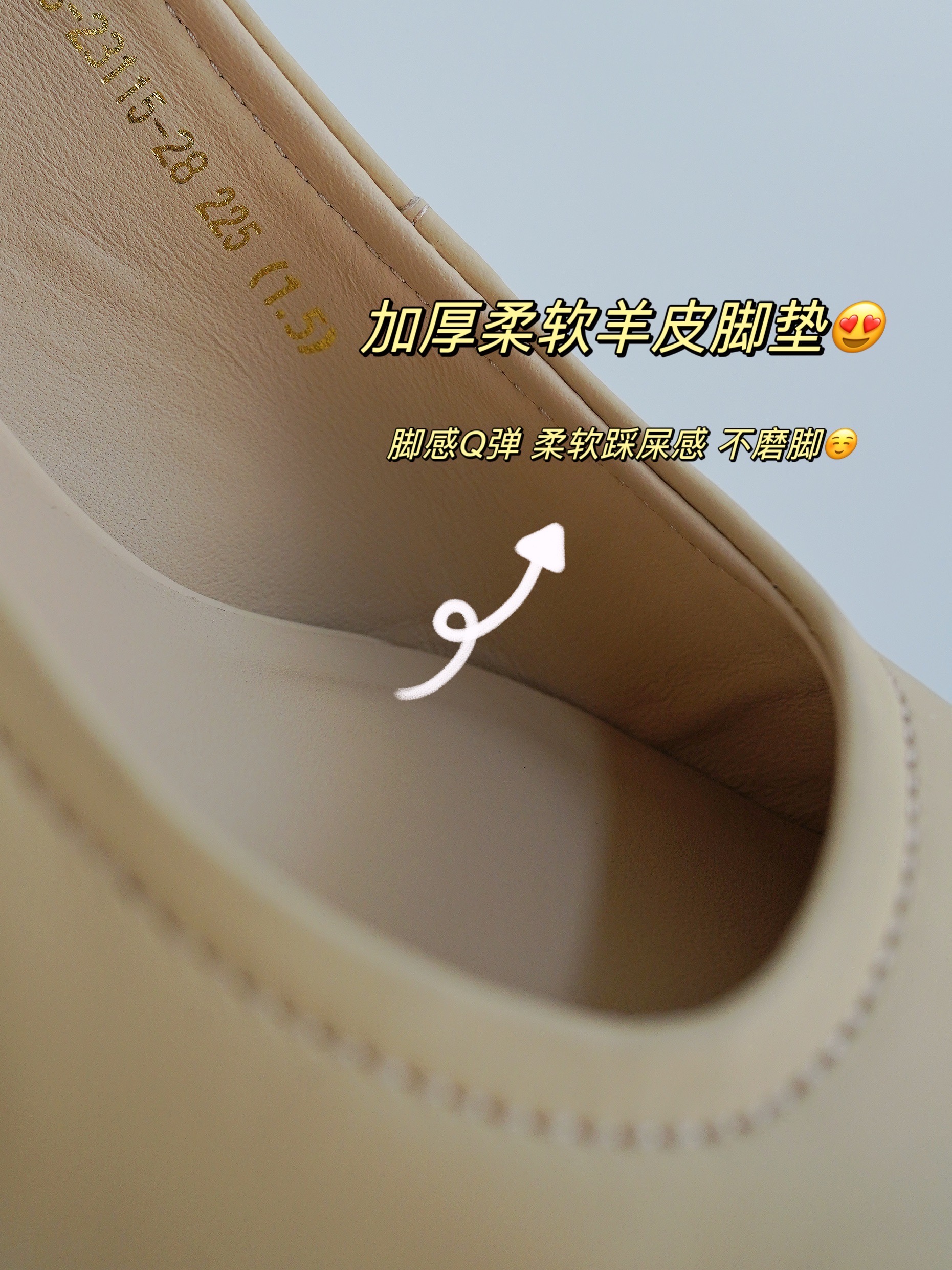 上脚的感受也是柔软Q弹,脚垫采用的是【加厚的超软羊皮脚垫】,上脚舒服感不言而喻!给予双脚棉柔细腻的呵护,透气柔软舒shi,不怕久行与闷热,也不易磨脚!
