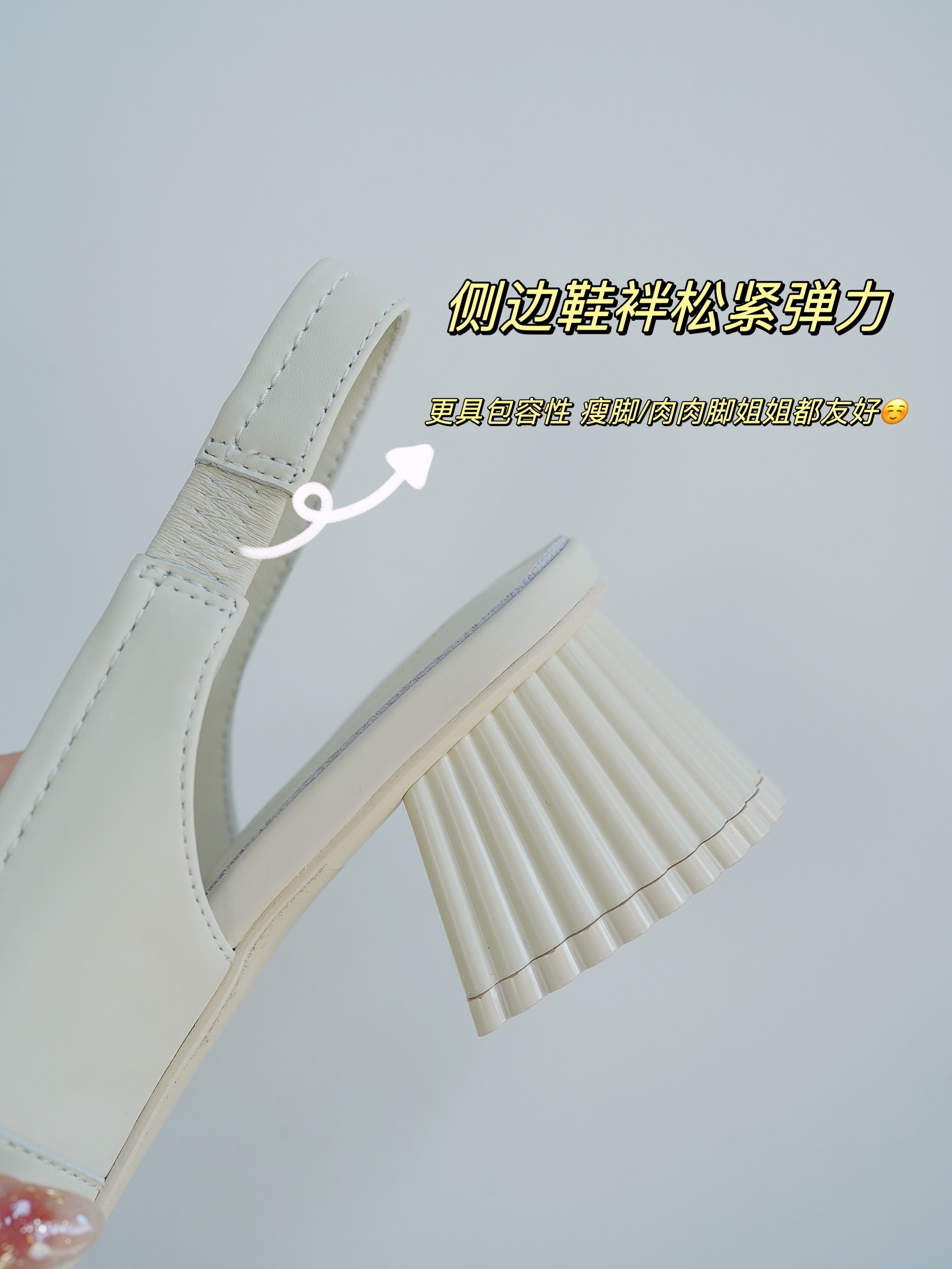后跟鞋袢有松紧弹力,上脚脚感更好,对胖胖脚来说也更具包容性!而且也不用去扣袢,直接一脚蹬!非常好穿、方便!