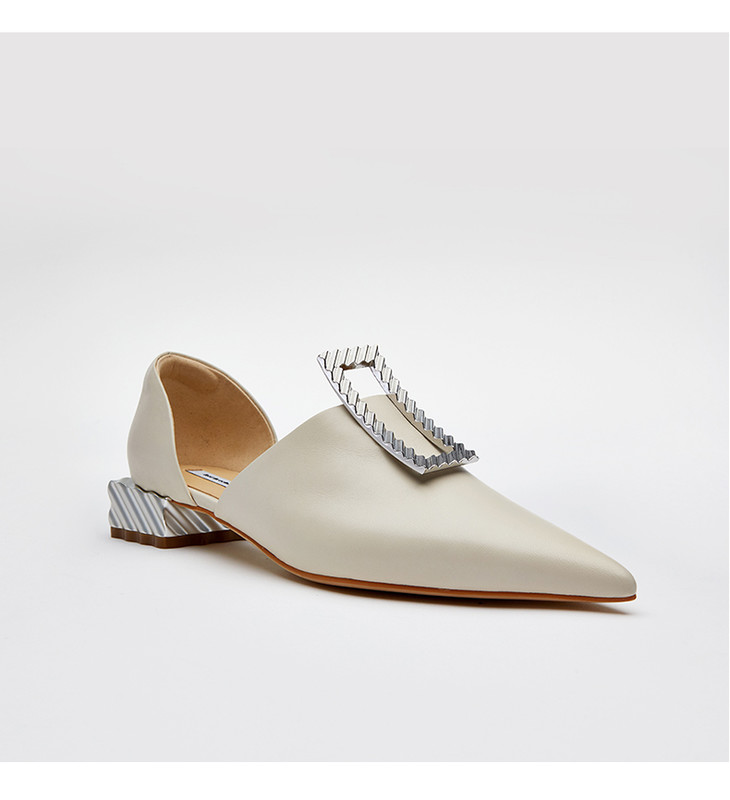 羊皮米白不对称饰扣薯片跟低跟平底中空单鞋女鞋