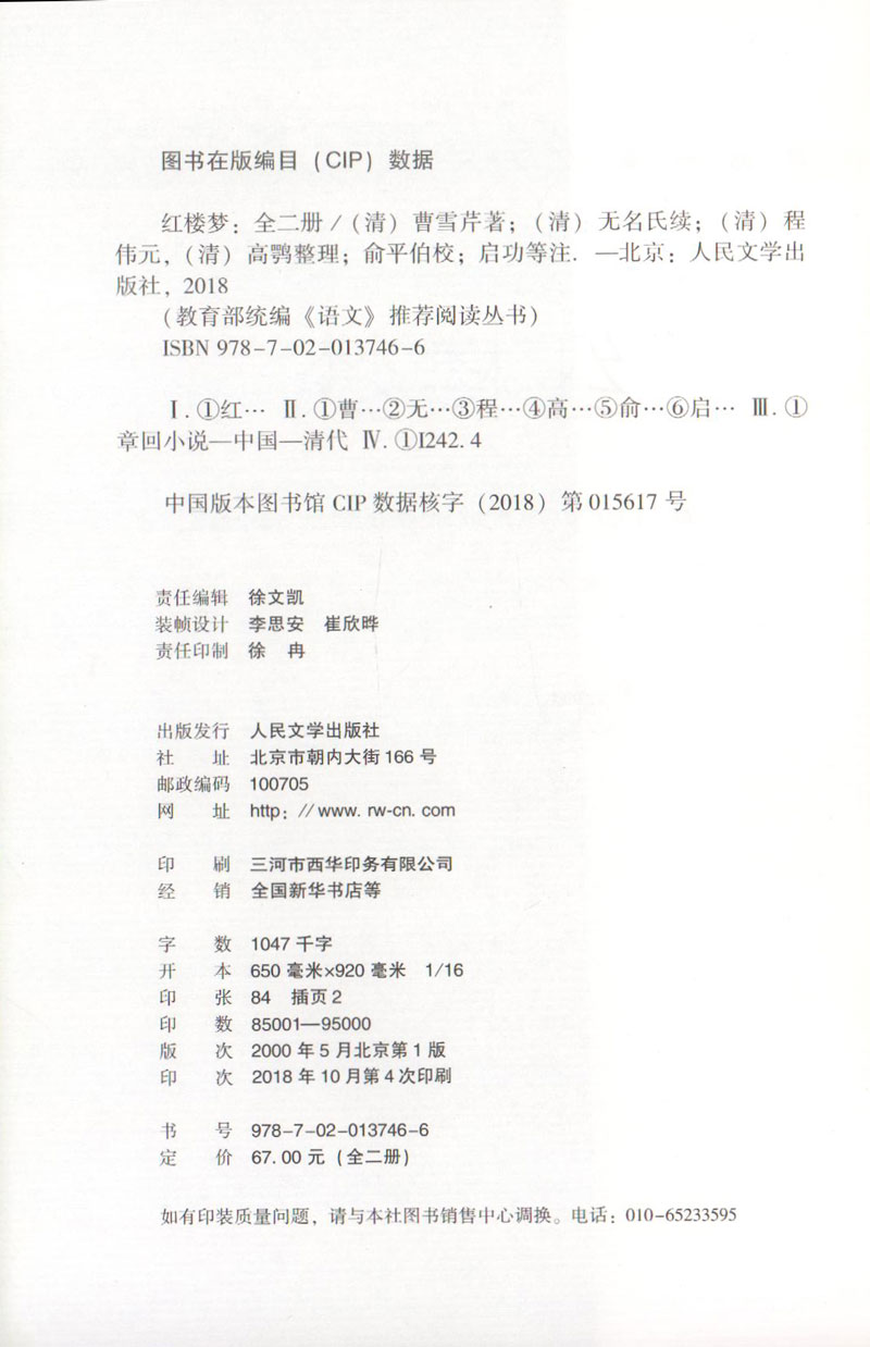 新版 红楼梦上下2册 曹雪芹著人民文学出版社部编版统编语文阅读丛书 语文新课标原著原版青少版珍藏版初中高中书籍成人版四大名著