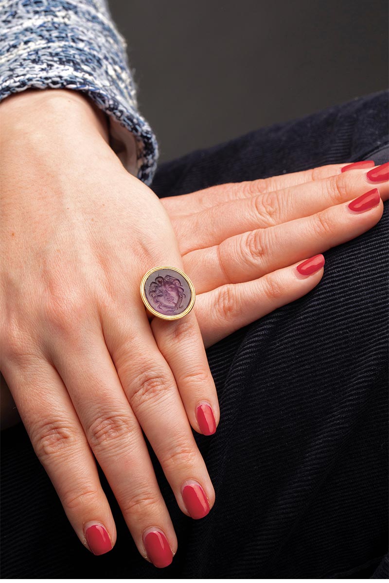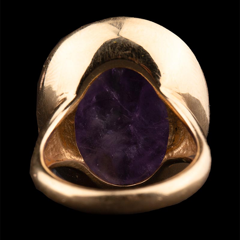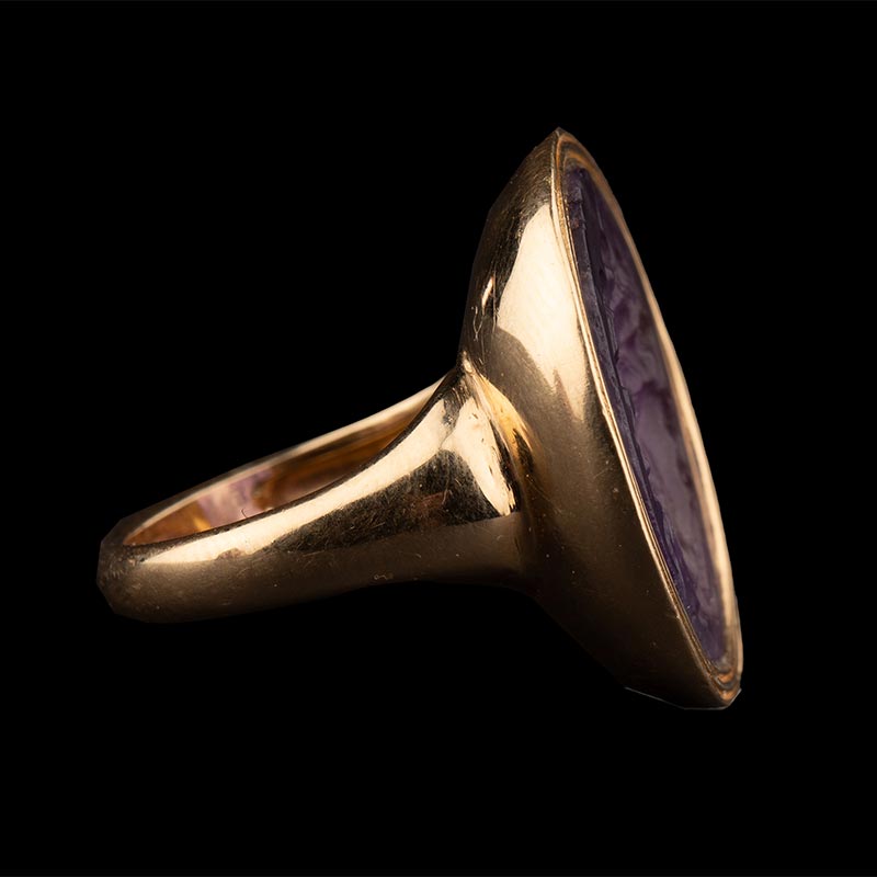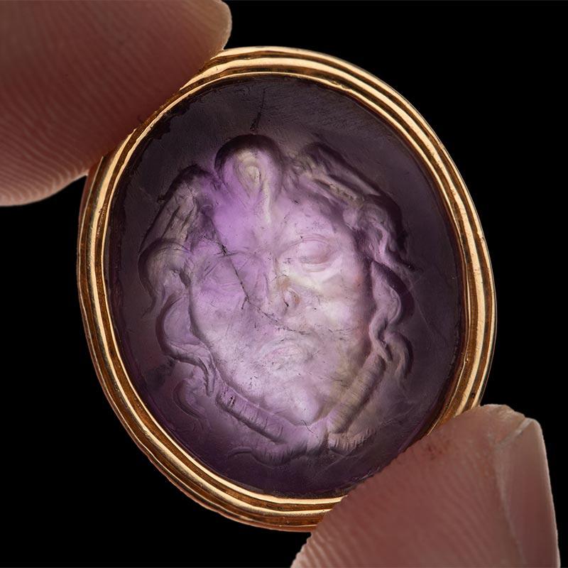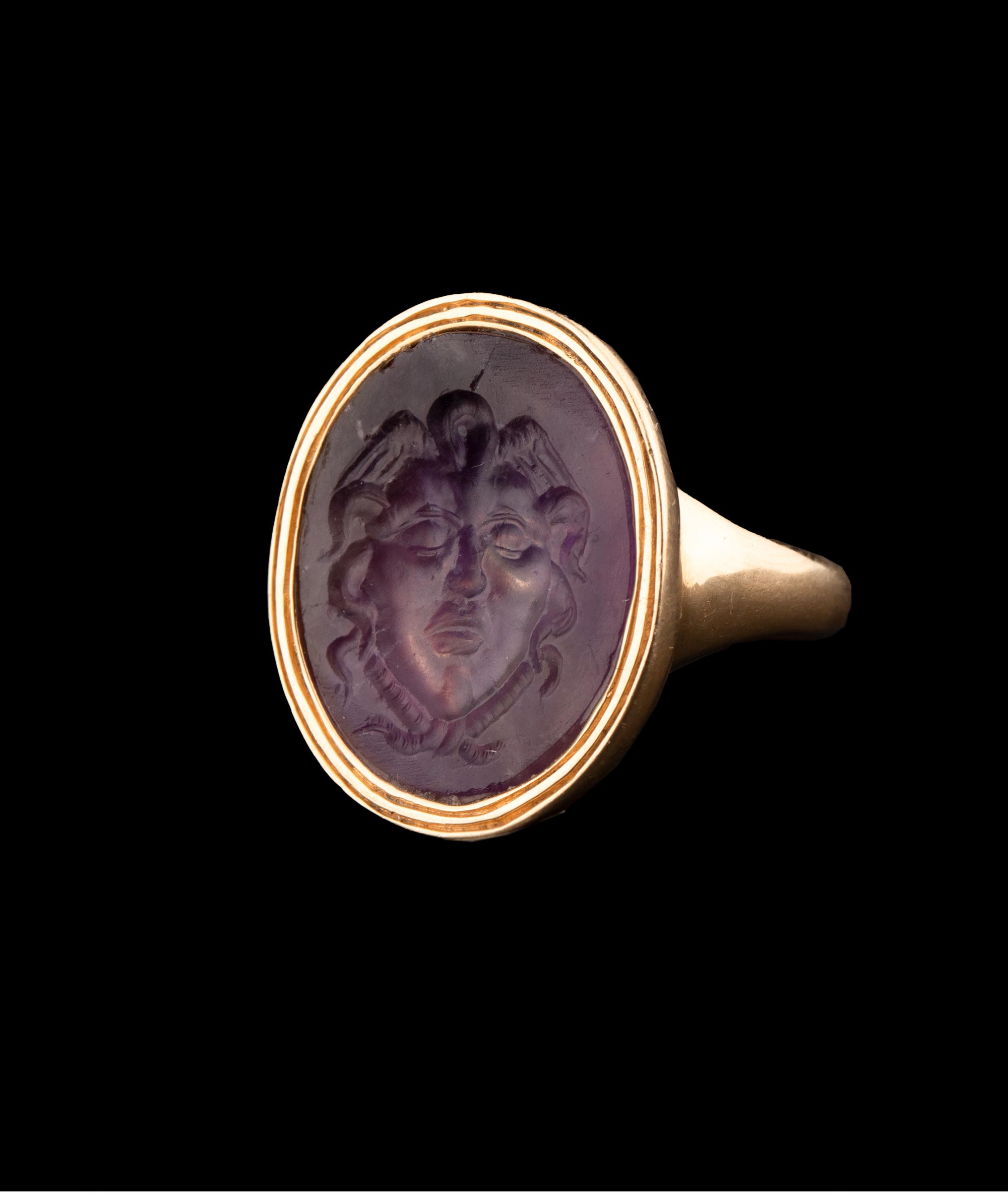 意大利出品18K黄金戒托镶嵌美杜莎肖像主题紫水晶凹雕戒指