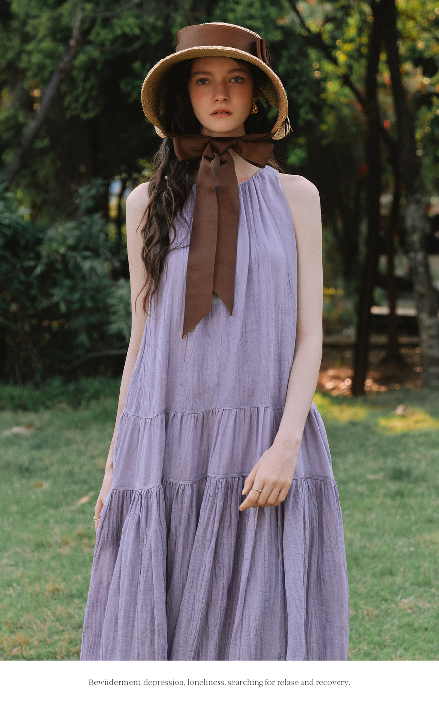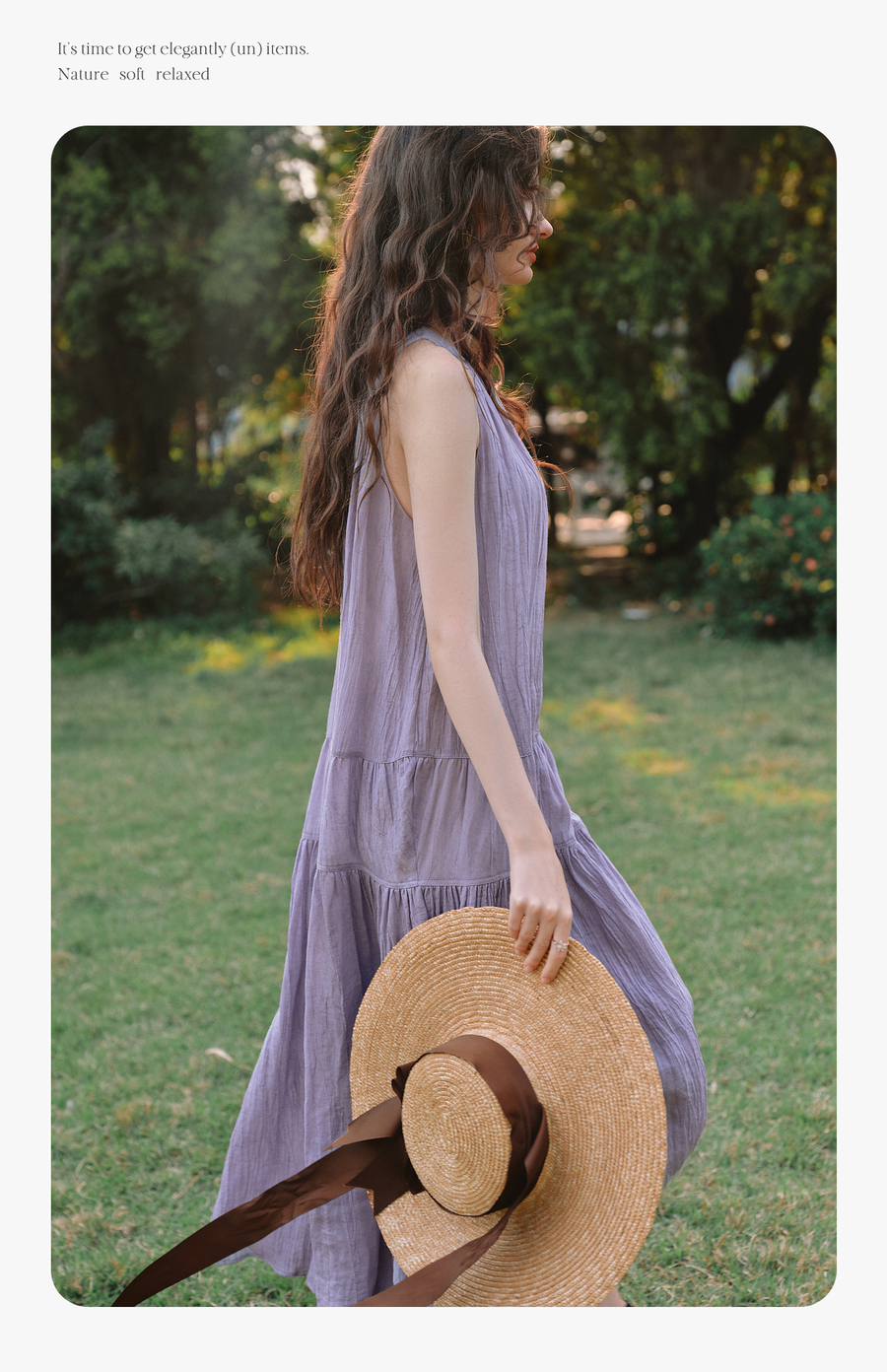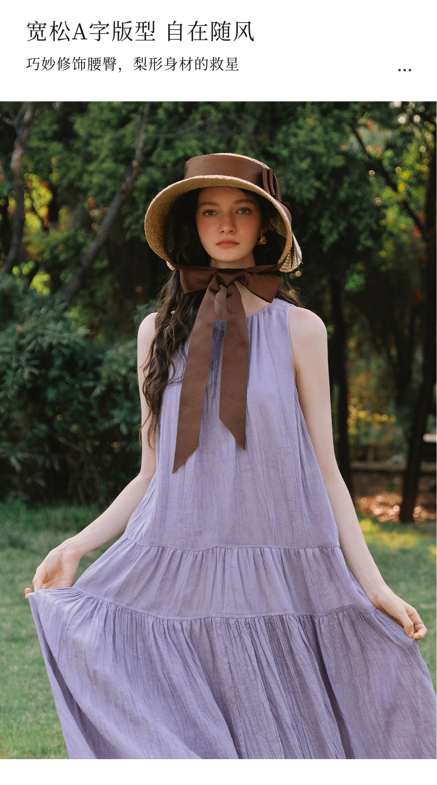 OLrain欧芮儿紫色无袖长款度假连衣裙女夏季2025新款宽松绝美长裙