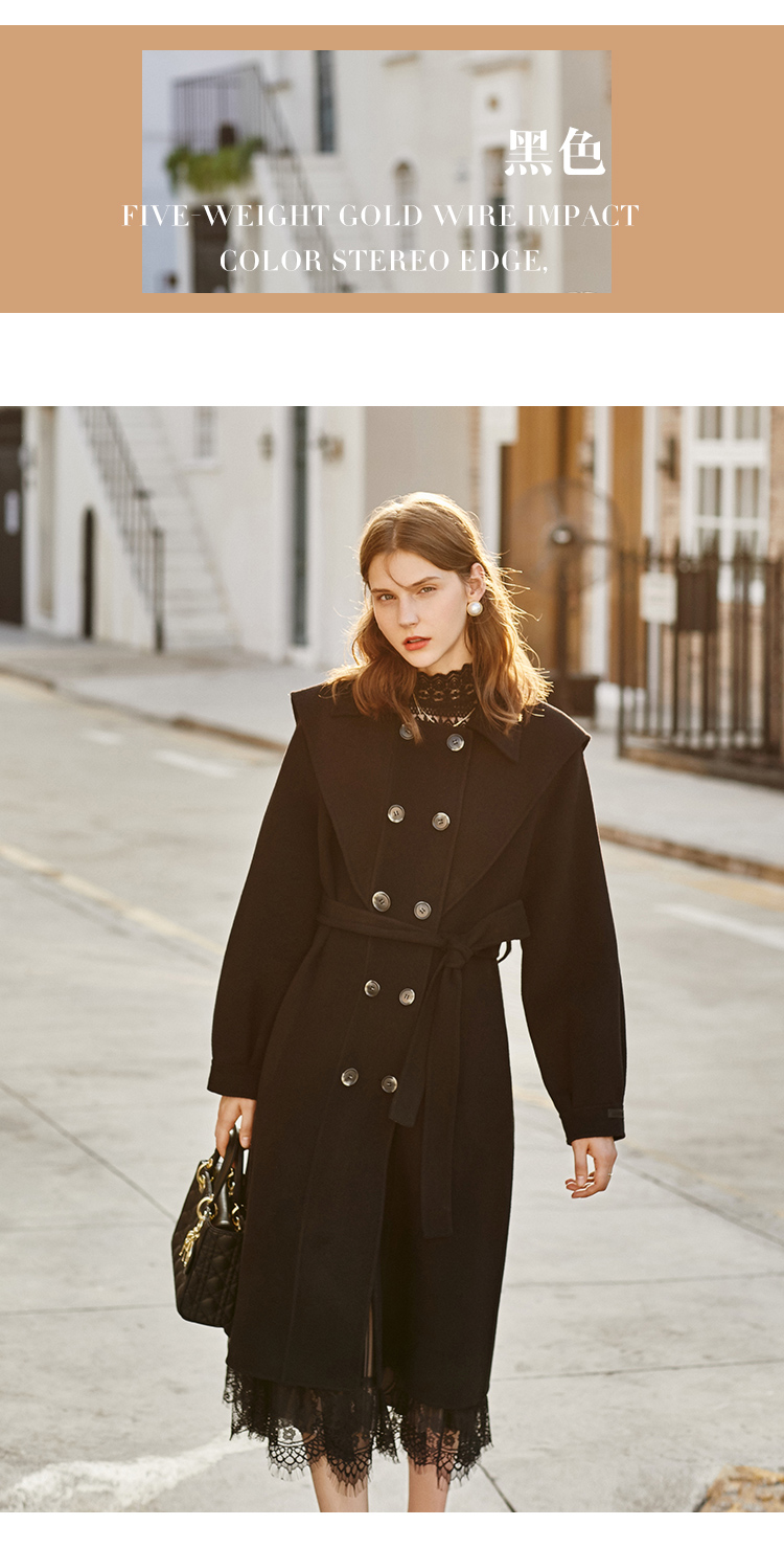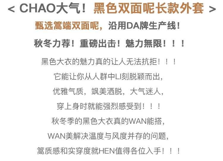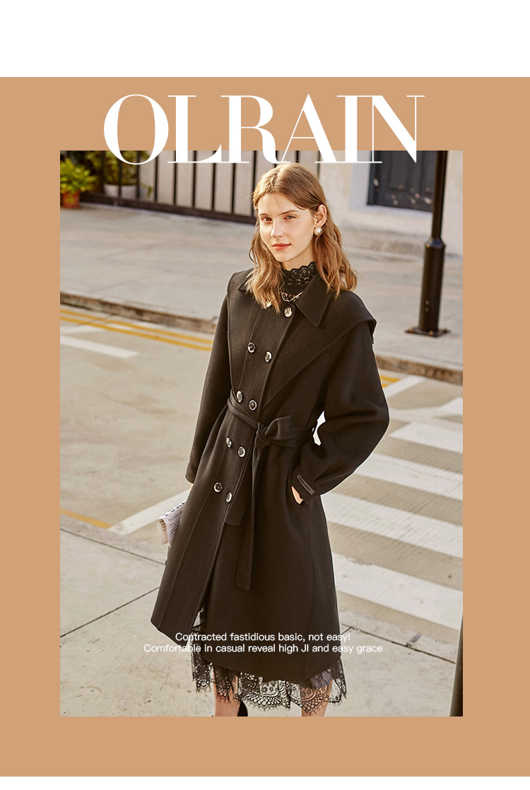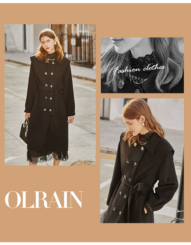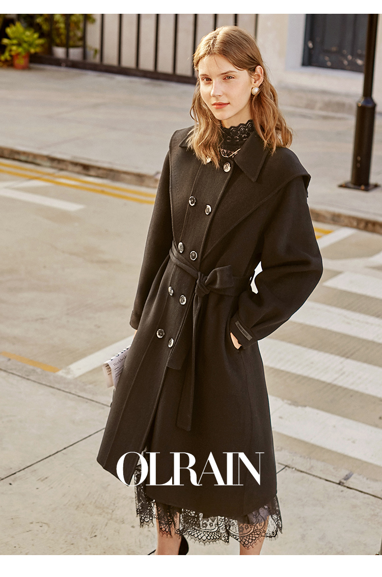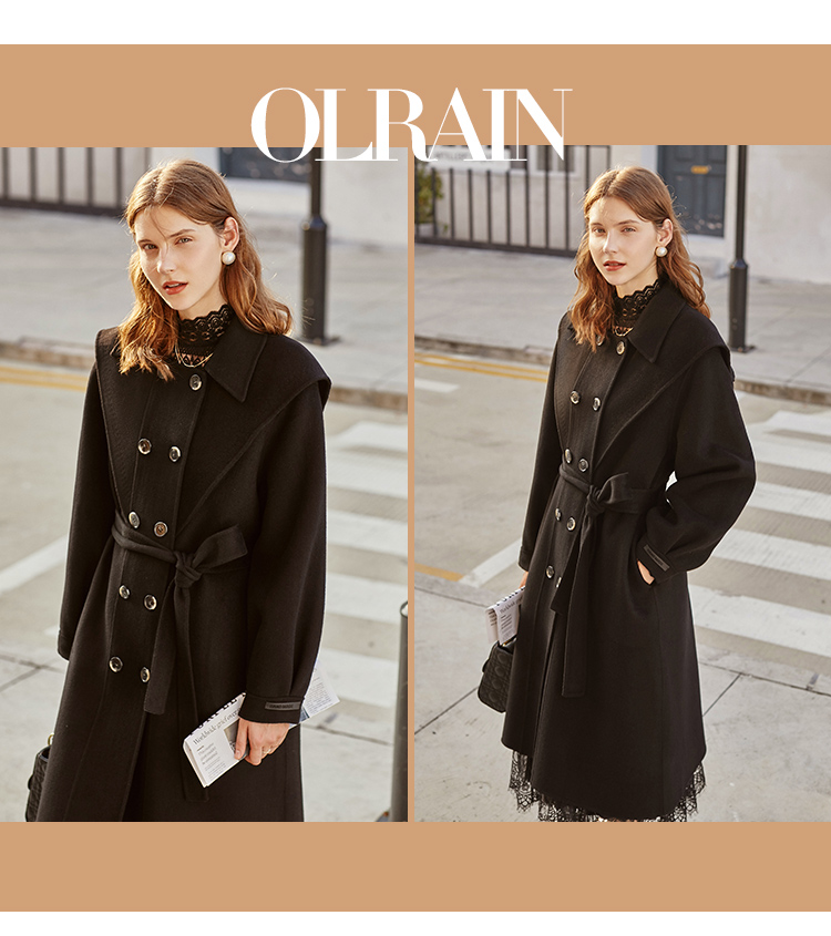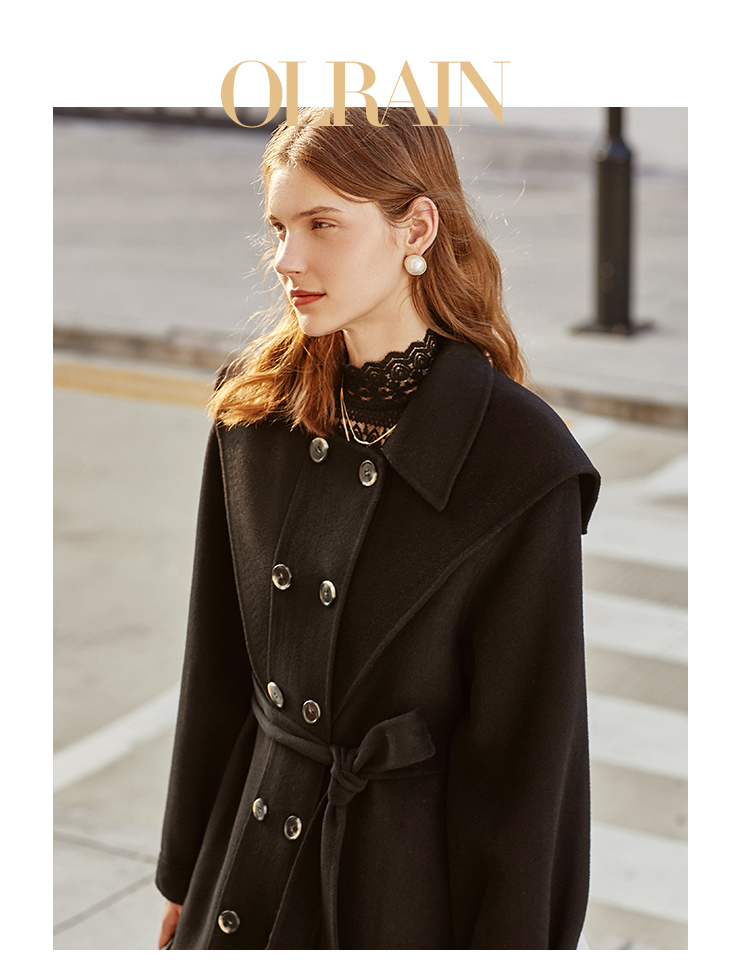 欧芮儿双面呢中长款毛呢外套女冬季收腰显瘦黑色气质呢子大衣