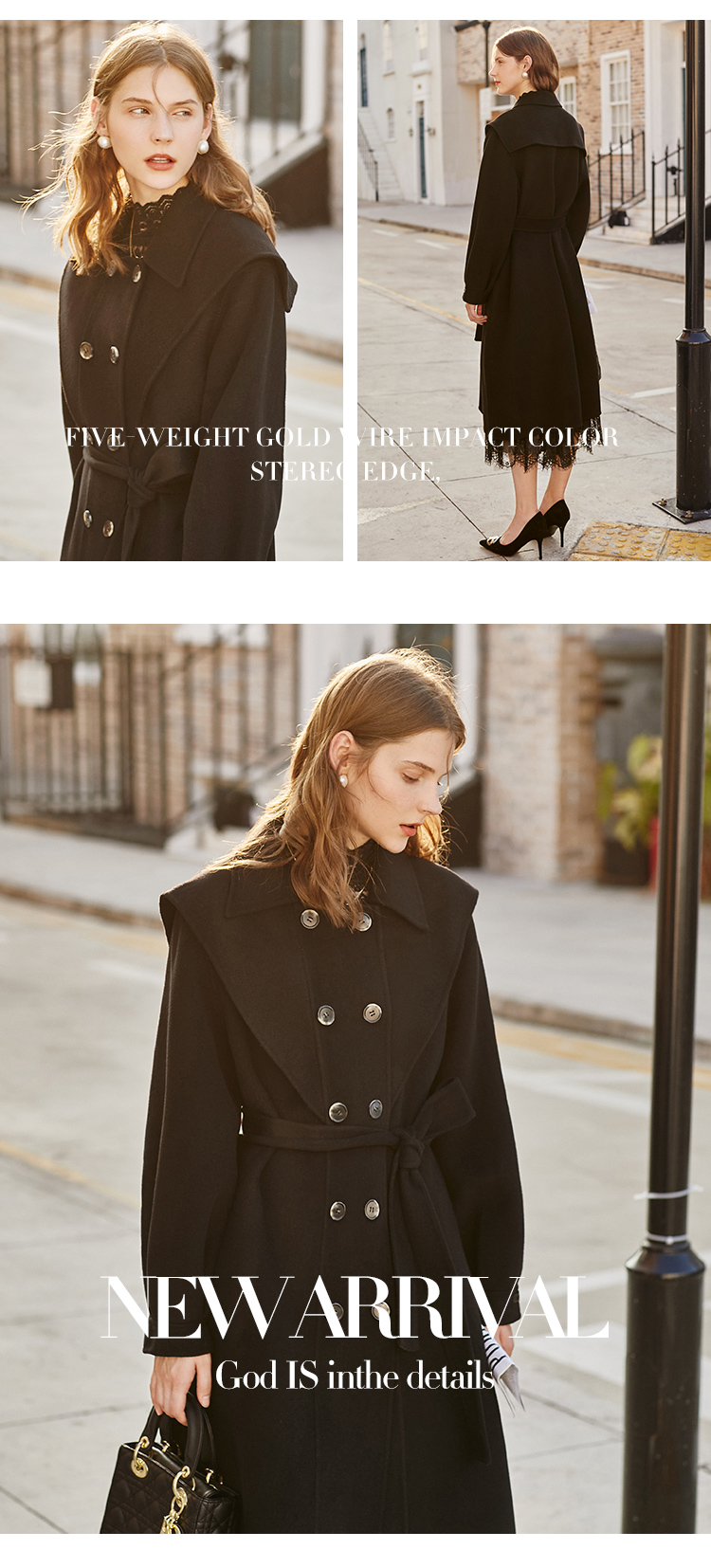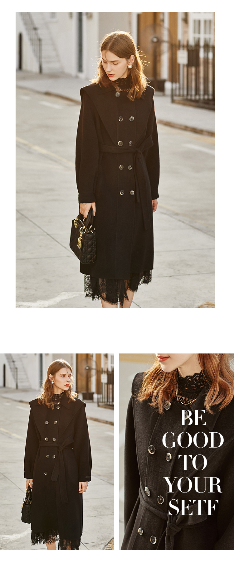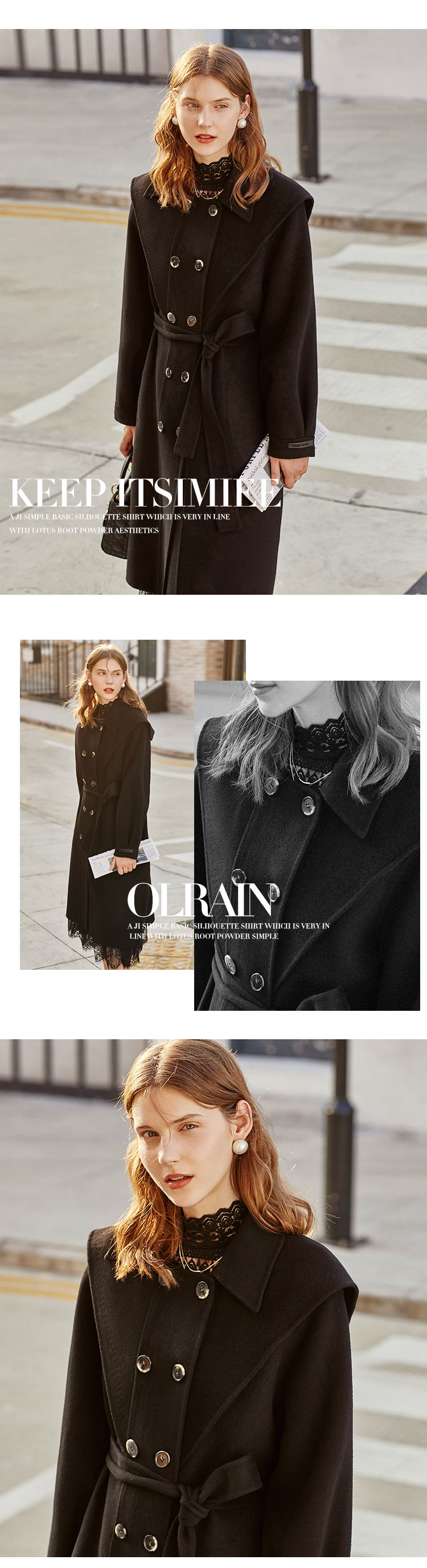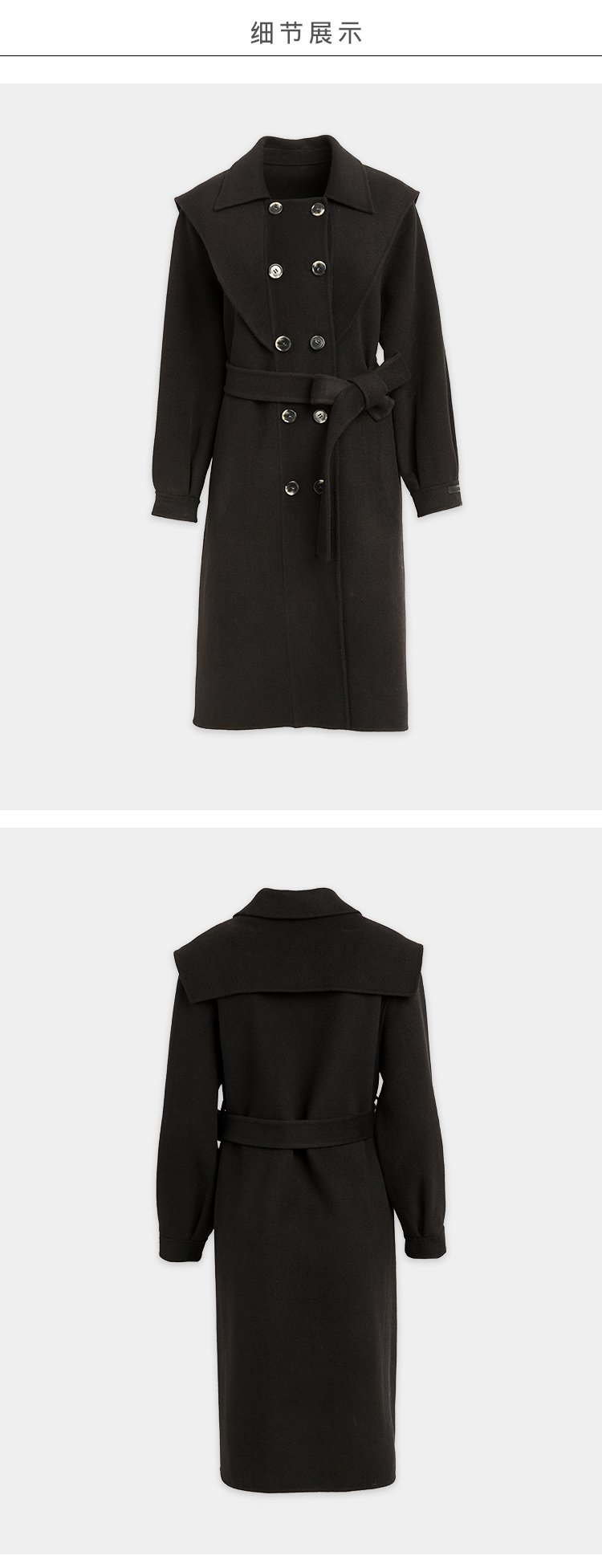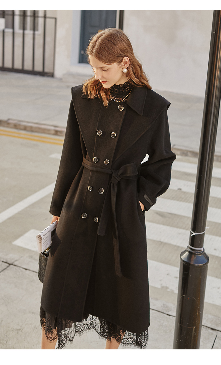 欧芮儿双面呢中长款毛呢外套女冬季收腰显瘦黑色气质呢子大衣