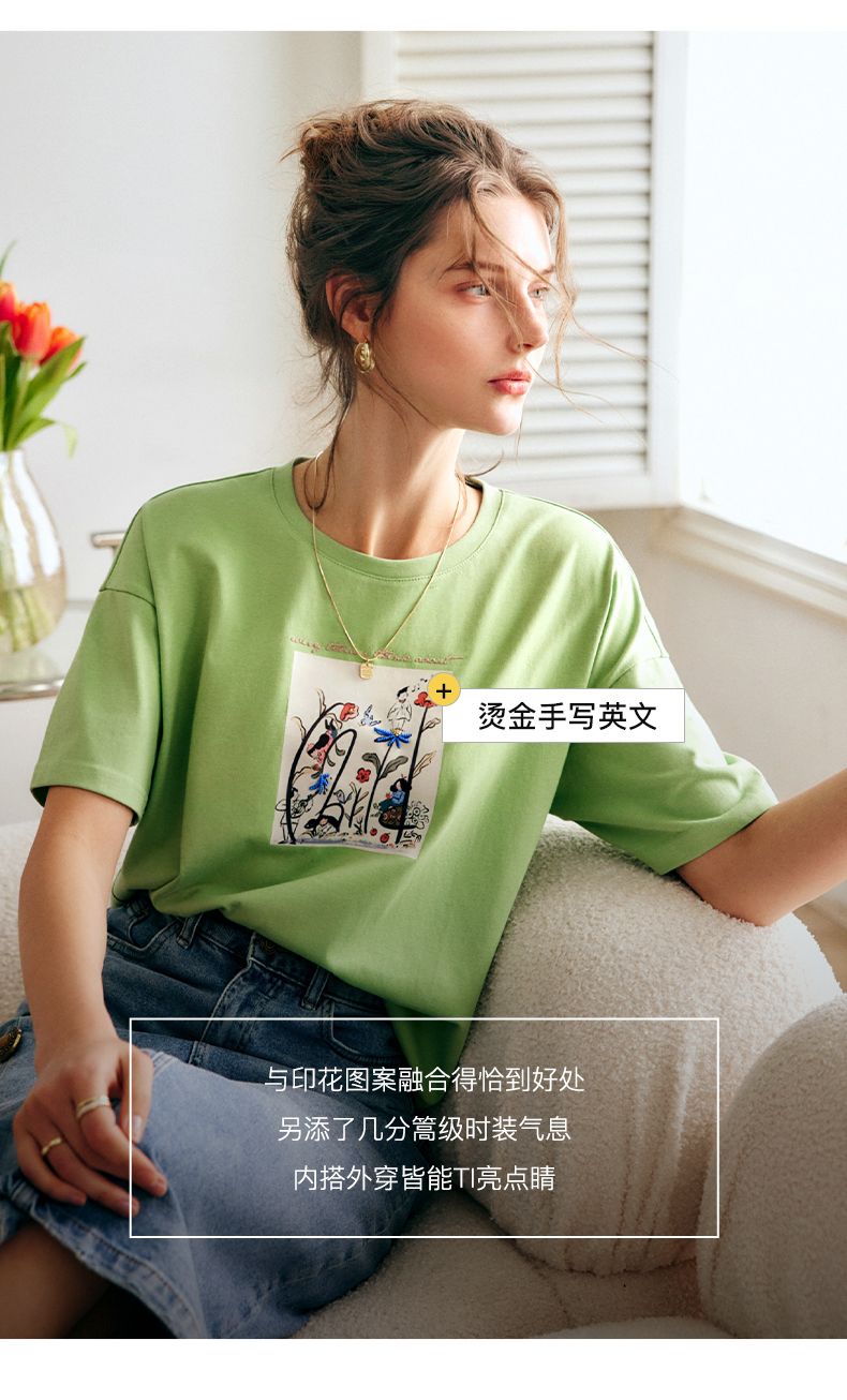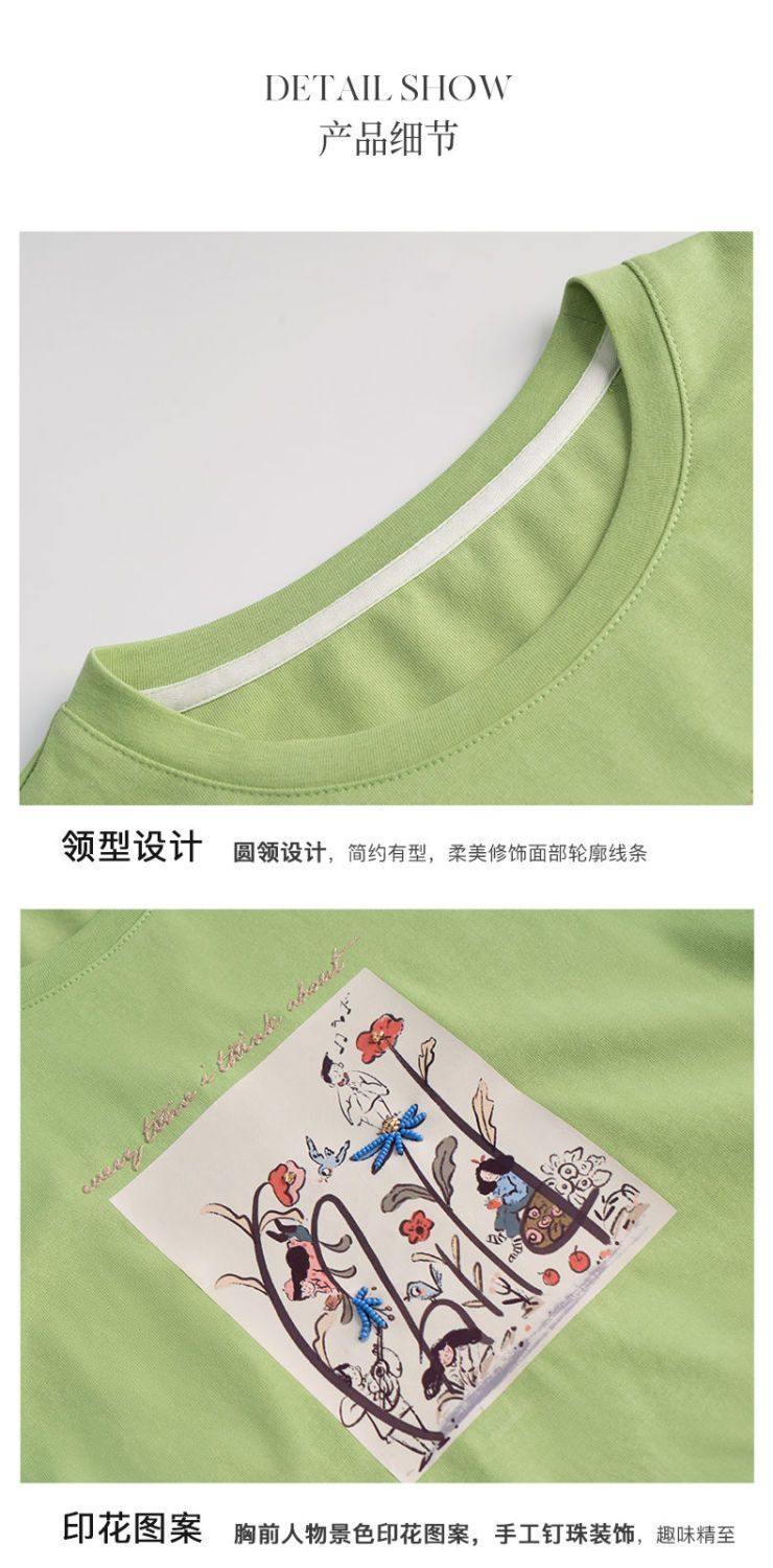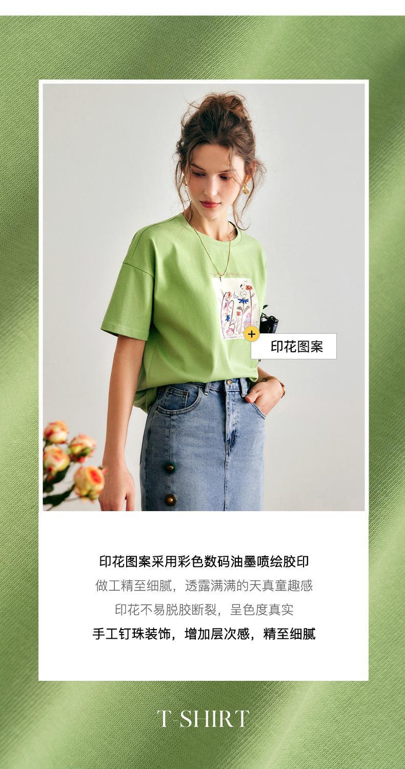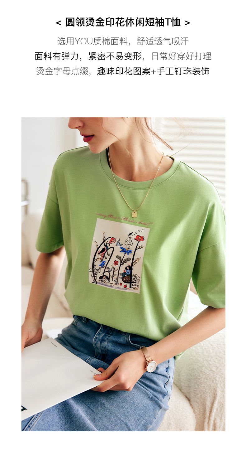 欧芮儿短袖T恤女夏季2022年新款宽松时尚印花钉珠休闲落肩袖上衣