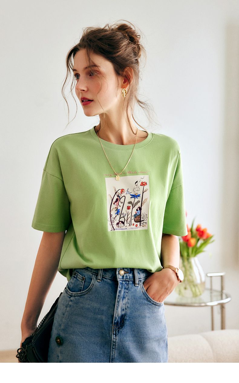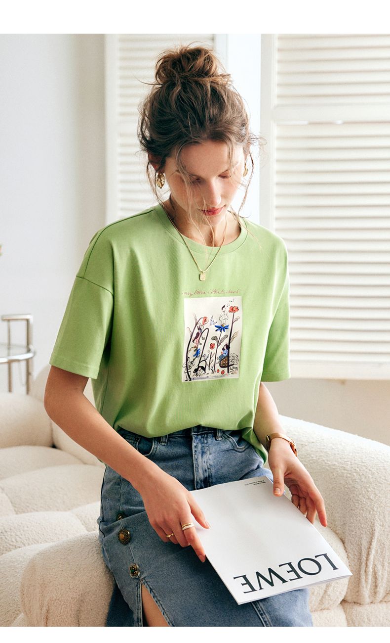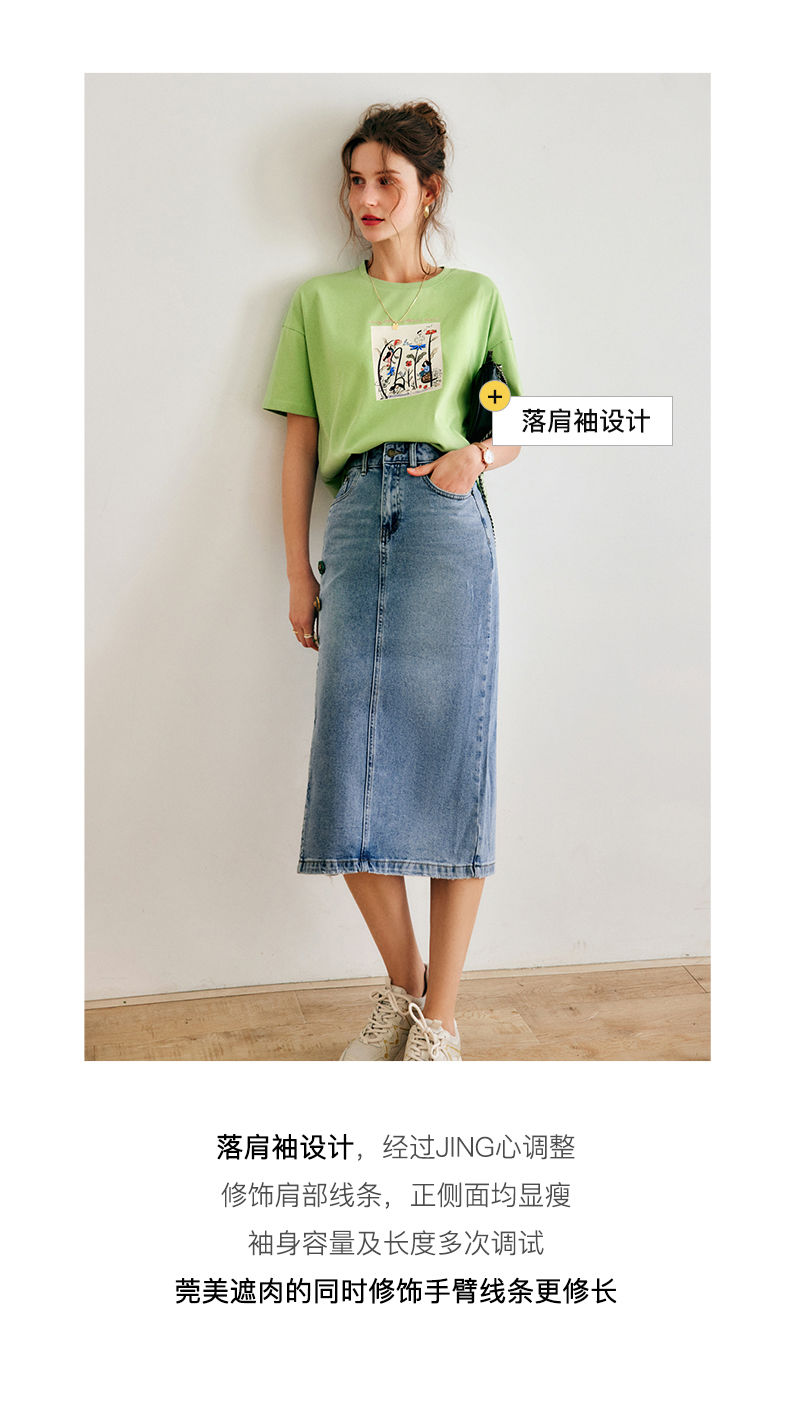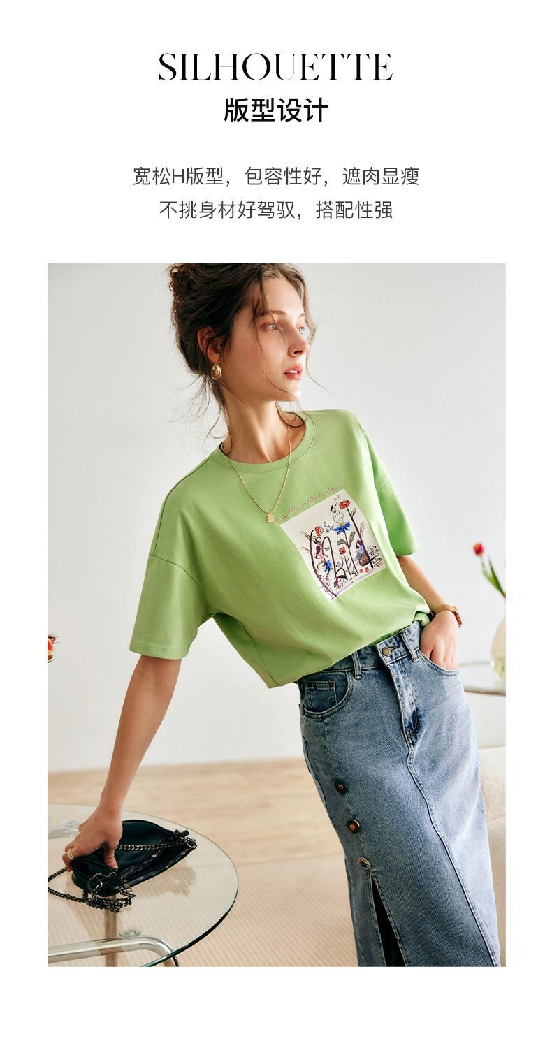 欧芮儿短袖T恤女夏季2022年新款宽松时尚印花钉珠休闲落肩袖上衣