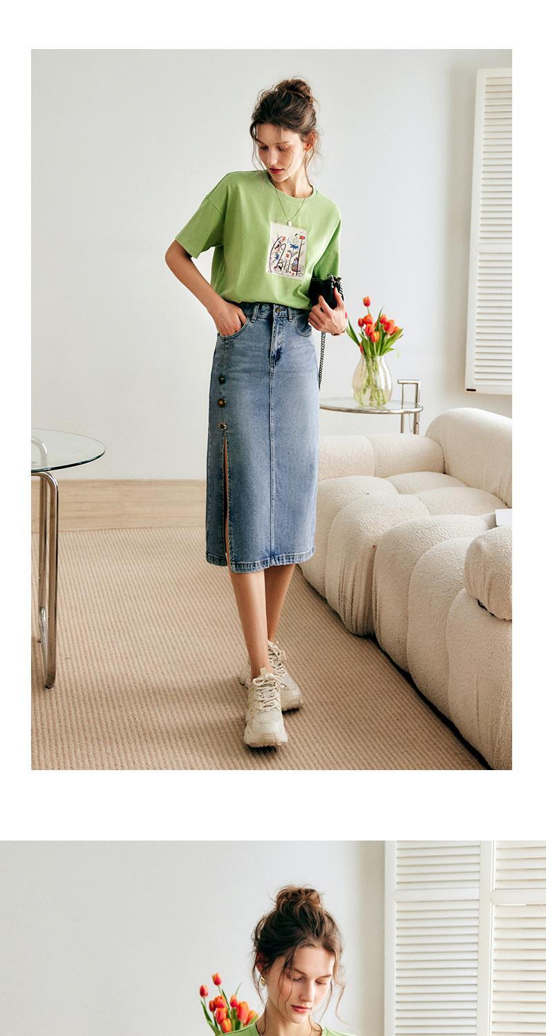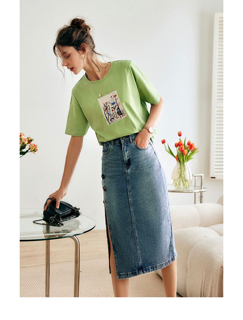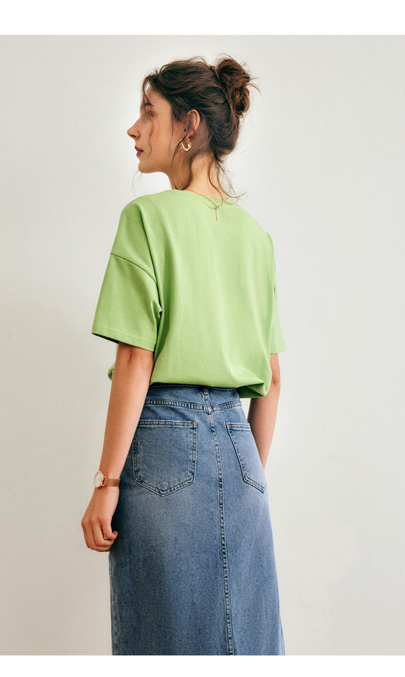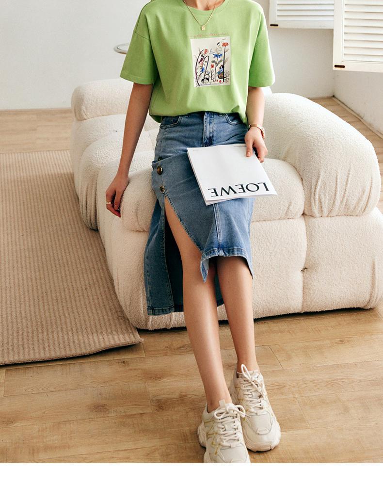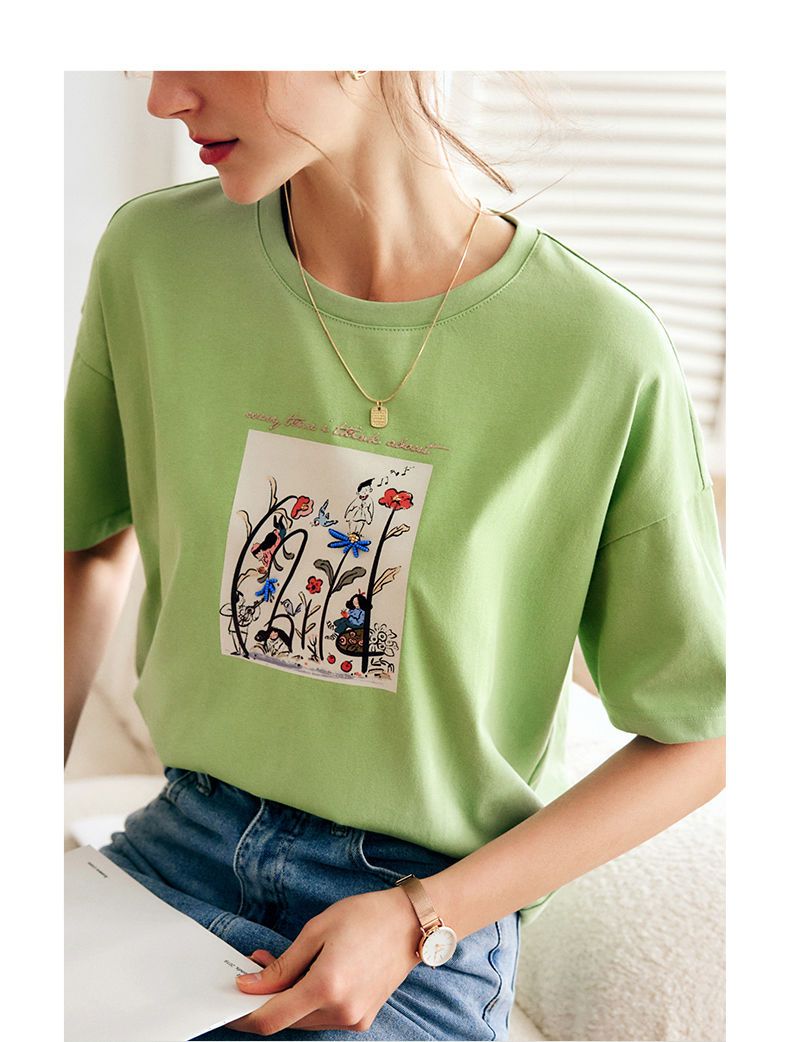 欧芮儿短袖T恤女夏季2022年新款宽松时尚印花钉珠休闲落肩袖上衣