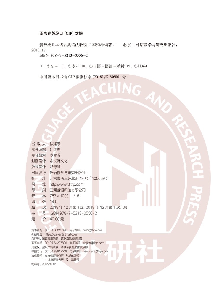 《新经典日本语古典语法》作者李延坤老师的专业为日语古典语法,并一直从事该专业的日语教学工作,这本书是他学术研究与教学实践的总结。《新经典日本语古典语法》特色有三:内容丰富,涵盖面广;语言简洁,用例凝练;注重基础,学用结合。这本日语古典语法教材将为学习者提供简单、便捷的掌握古典语法的平台和学习方法,提升学习者对古典语法的兴趣。