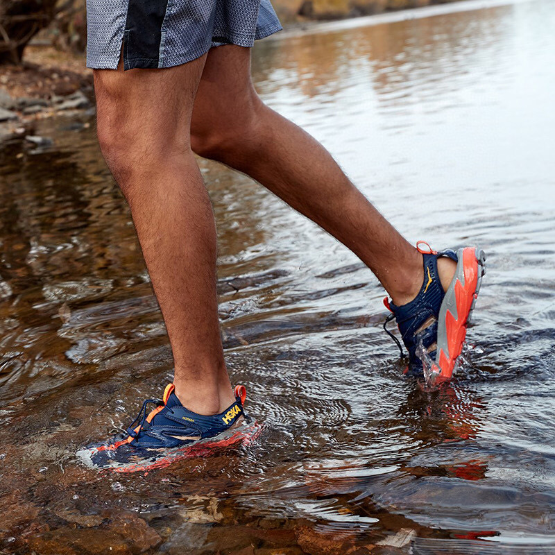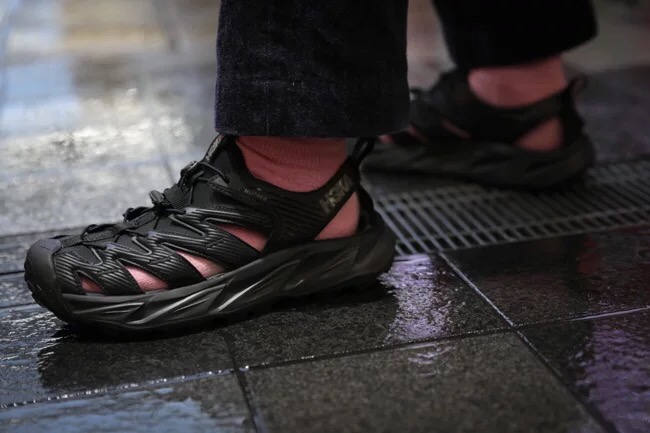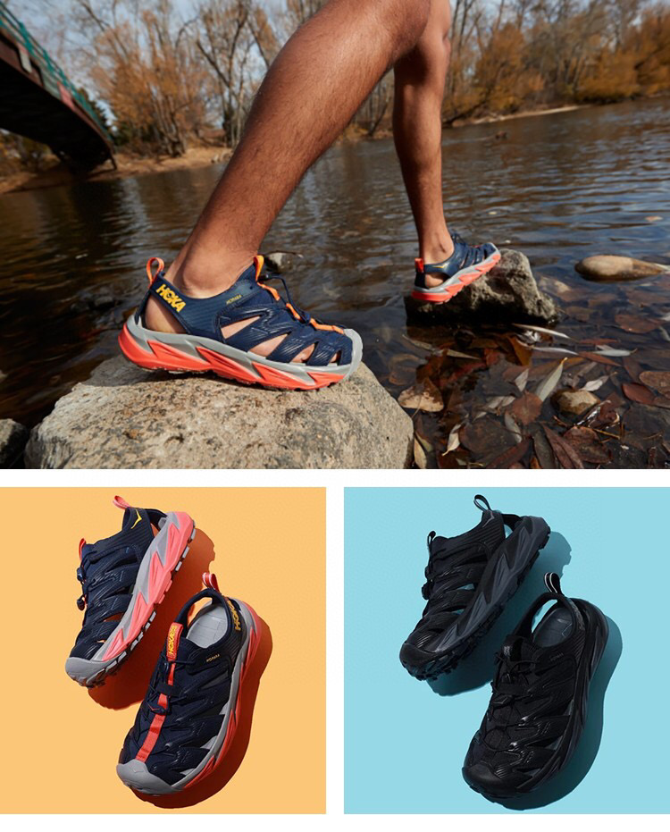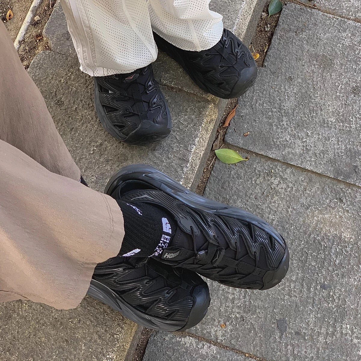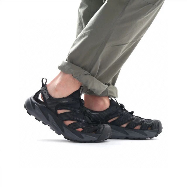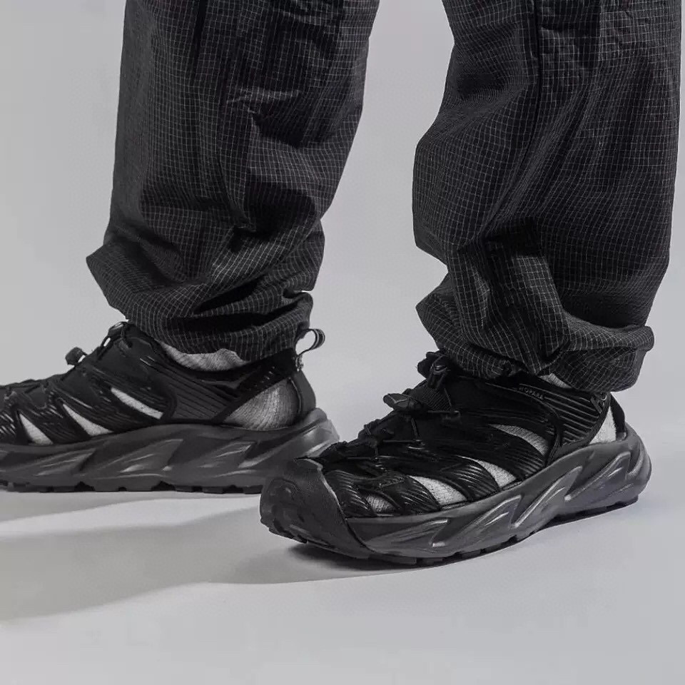 这款黑色HOKA ONE ONE山地凉鞋采用镂空鞋帮设计,可提供安全的Quick Lace系带系统,防护橡胶鞋头盖和橡胶鞋底,底部配有多向鞋钉,可在崎岖不平和潮湿的地面上额外抓地力。