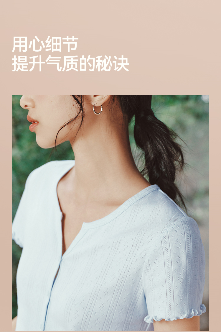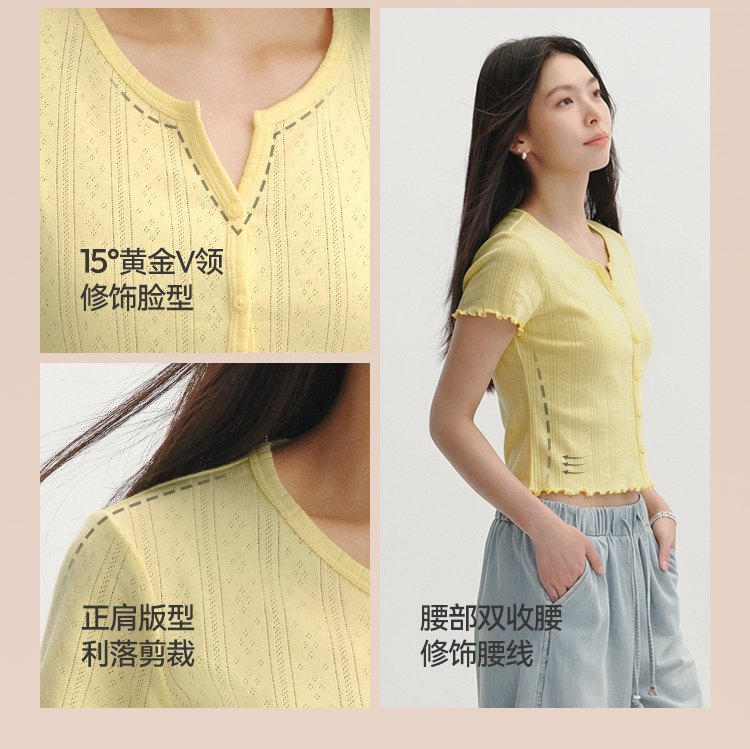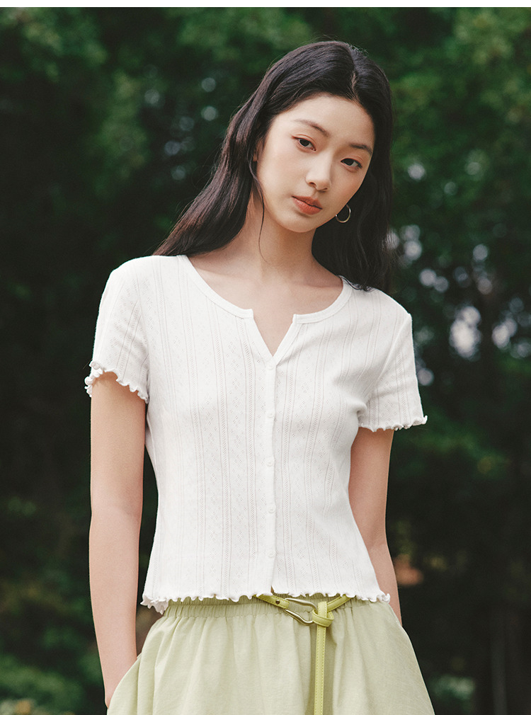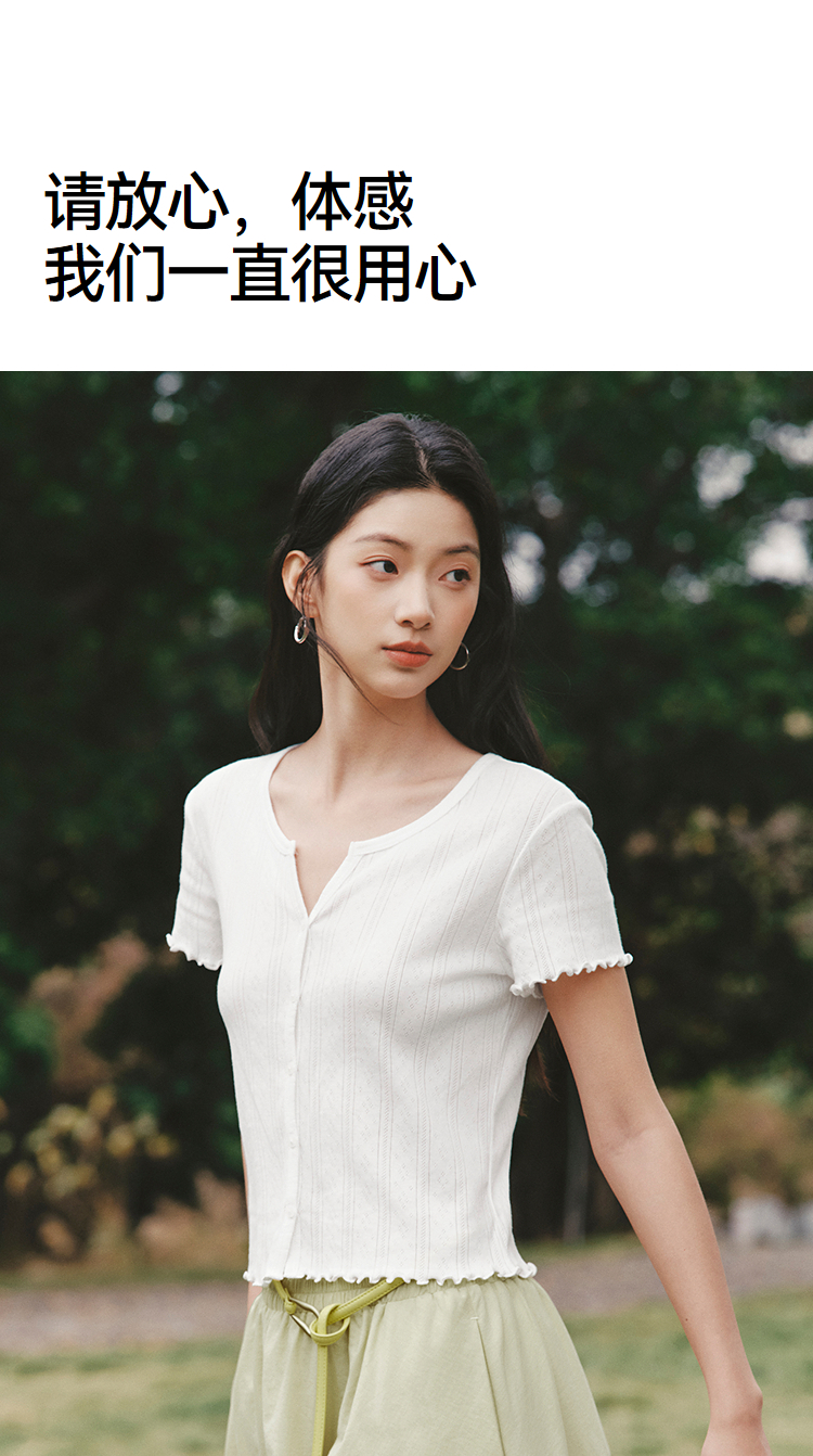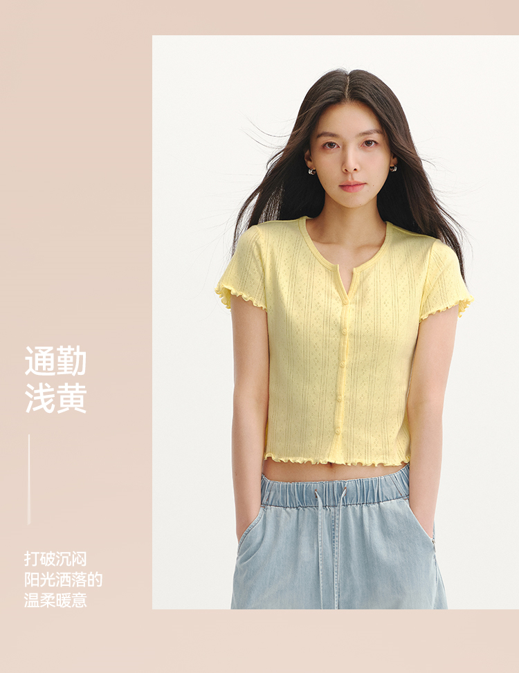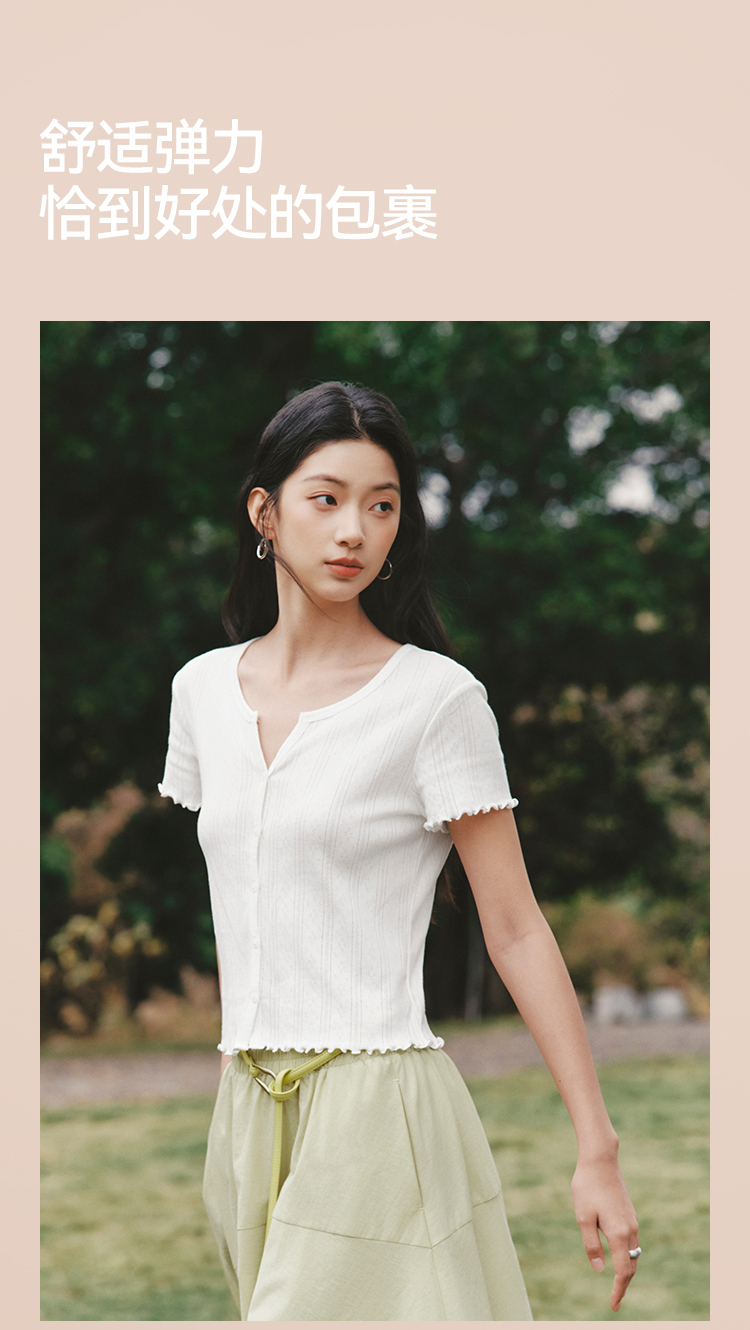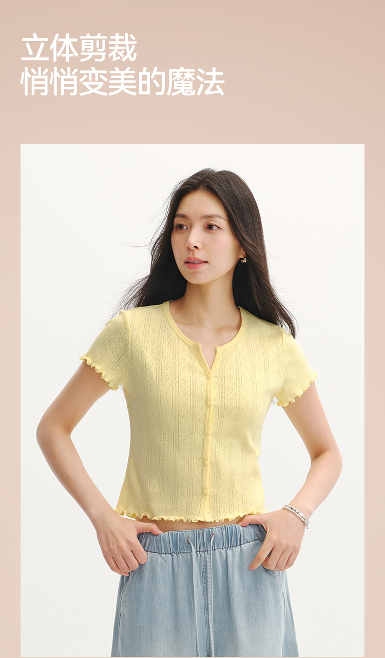森马短袖T恤女夏季短款镂空提花肌理修身纯棉木耳边2026新款开衫