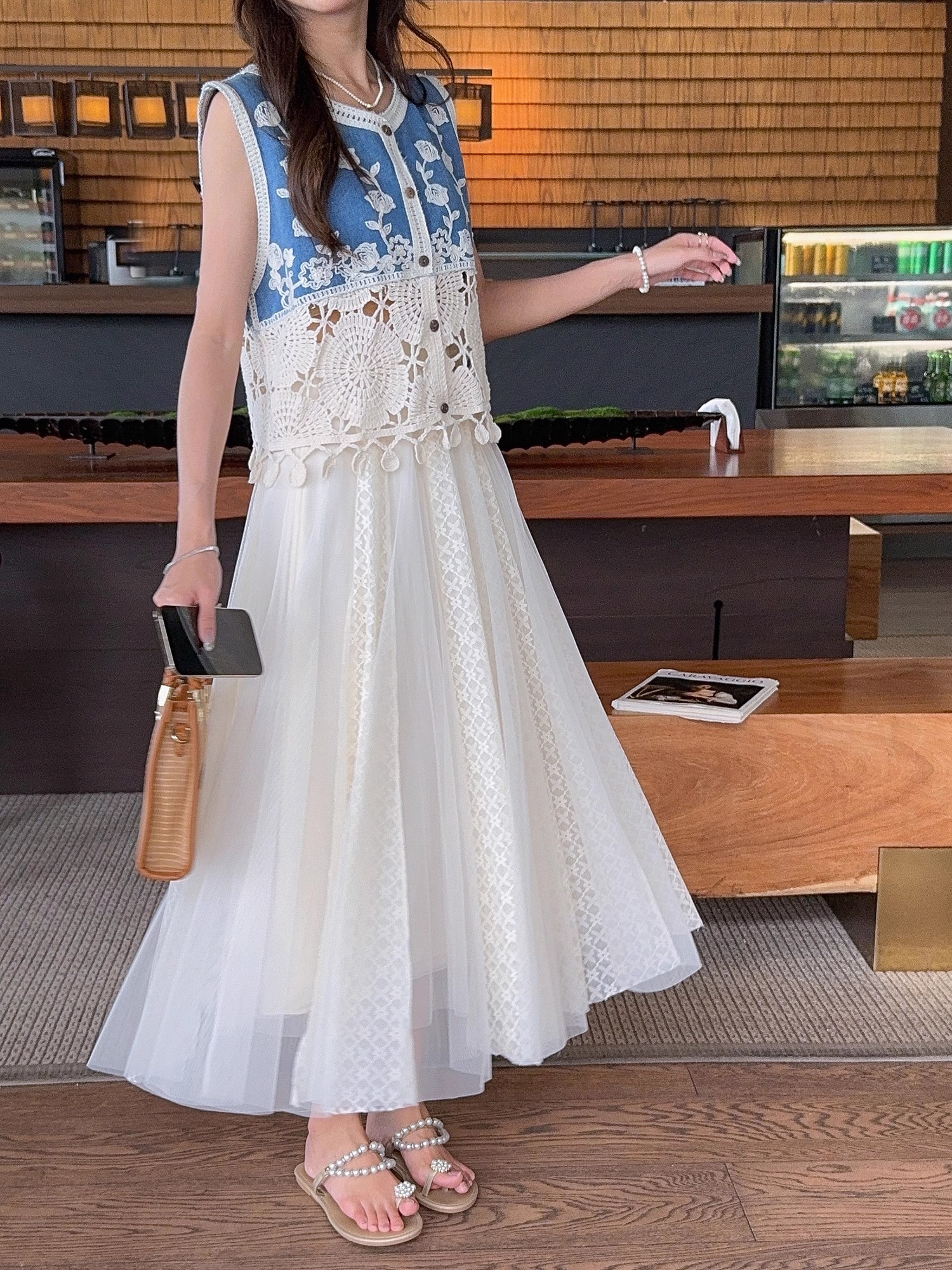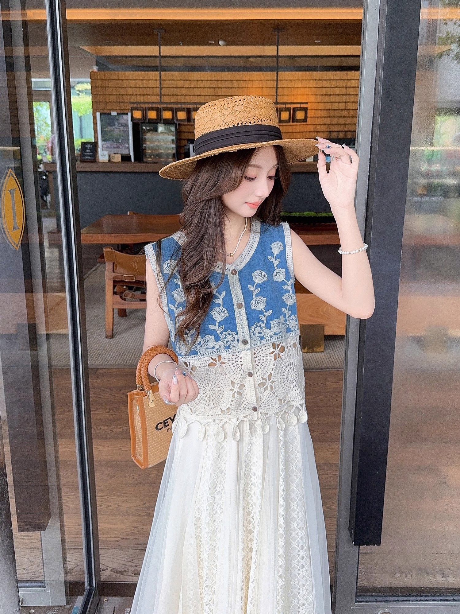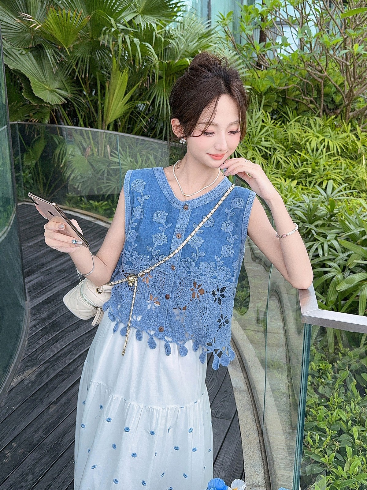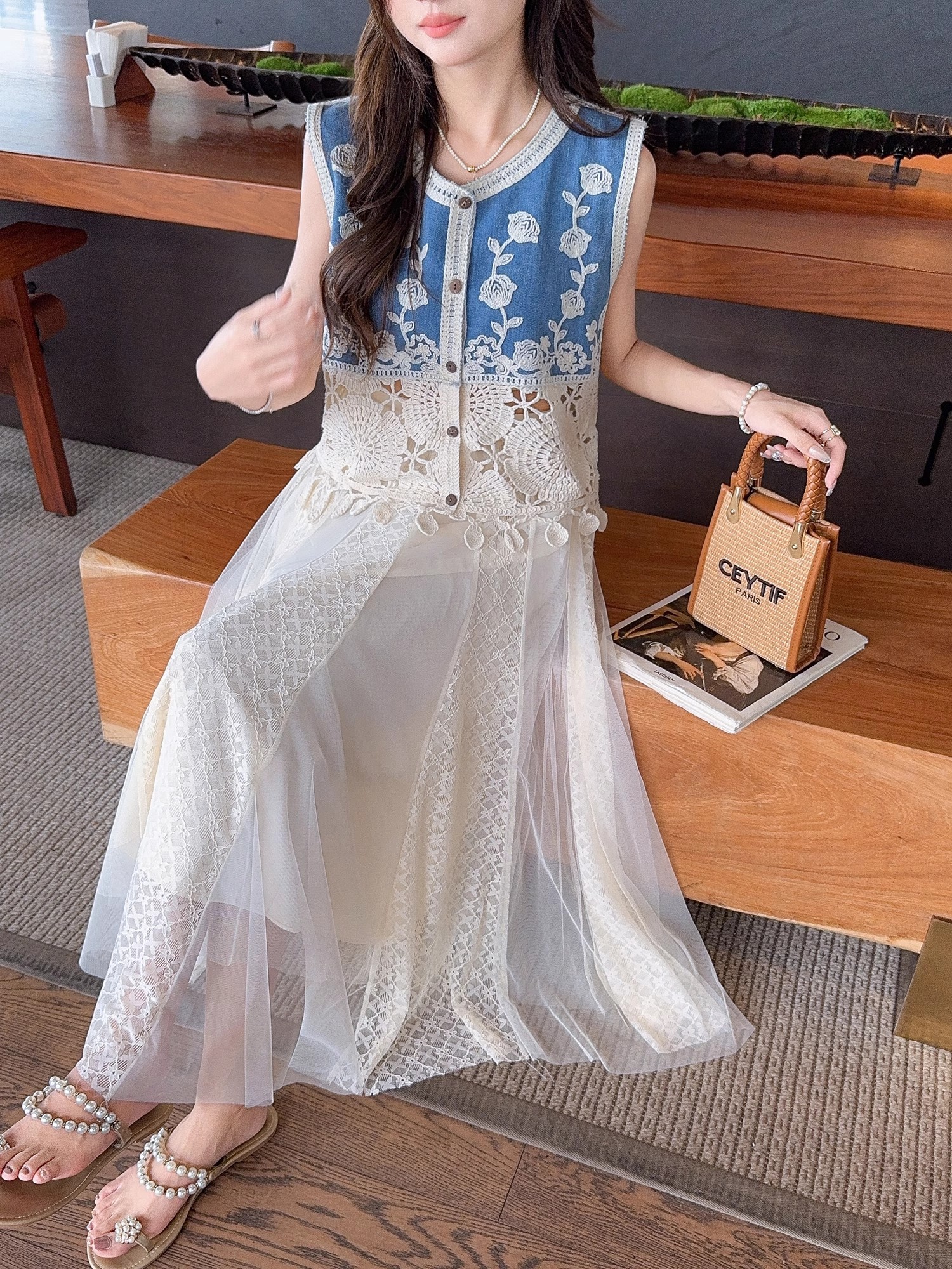张心子【浅草须臾】圆领刺绣拼接开衫气质V领马甲 U2505006