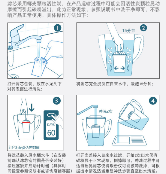 *滤芯第一次使用时,滤除的两壶水可能呈现黑色, 此为活性炭粉末释出,属正常现象,可用于浇花或清洗其它容器。 再一次将水注入水壶中,便可开始饮用。