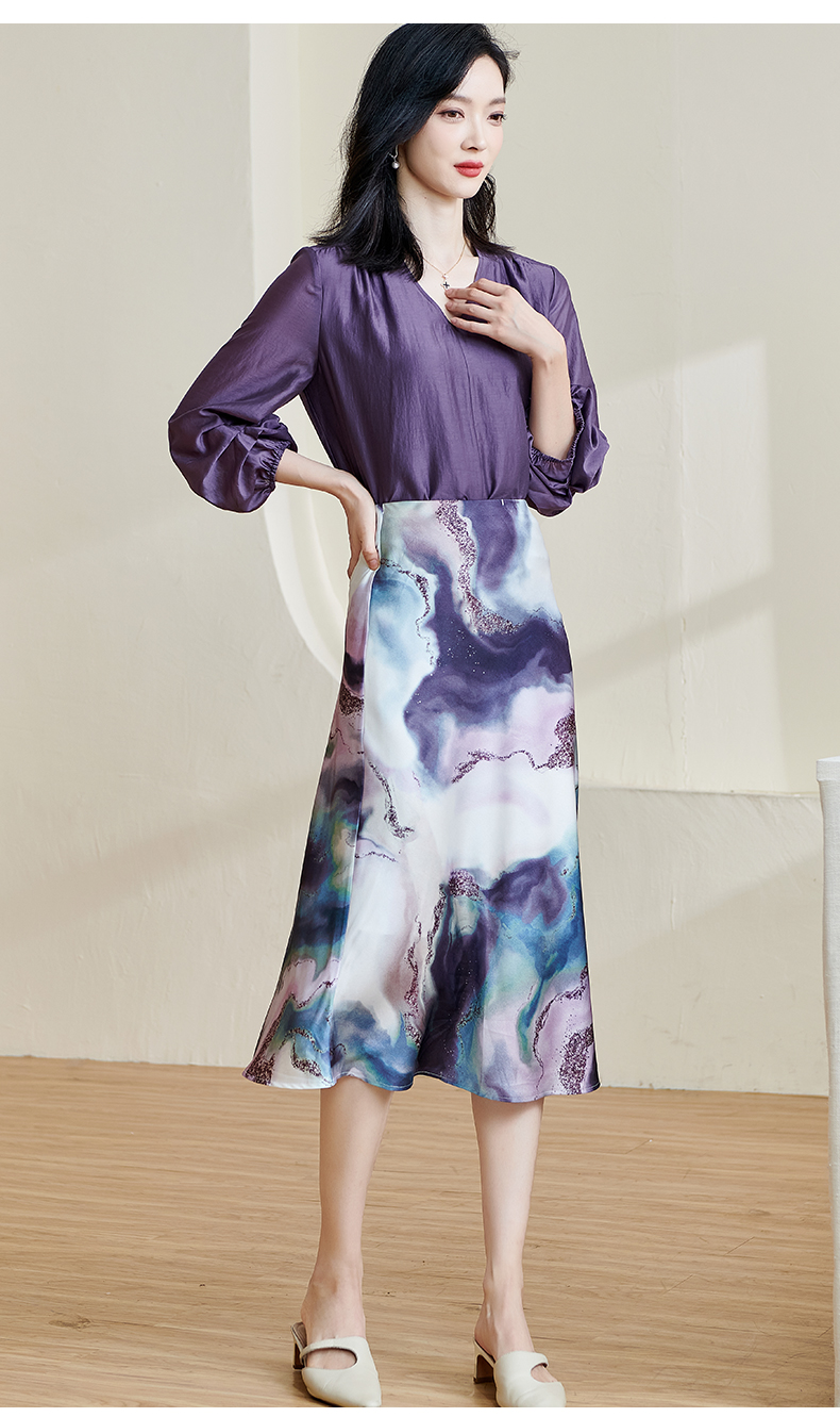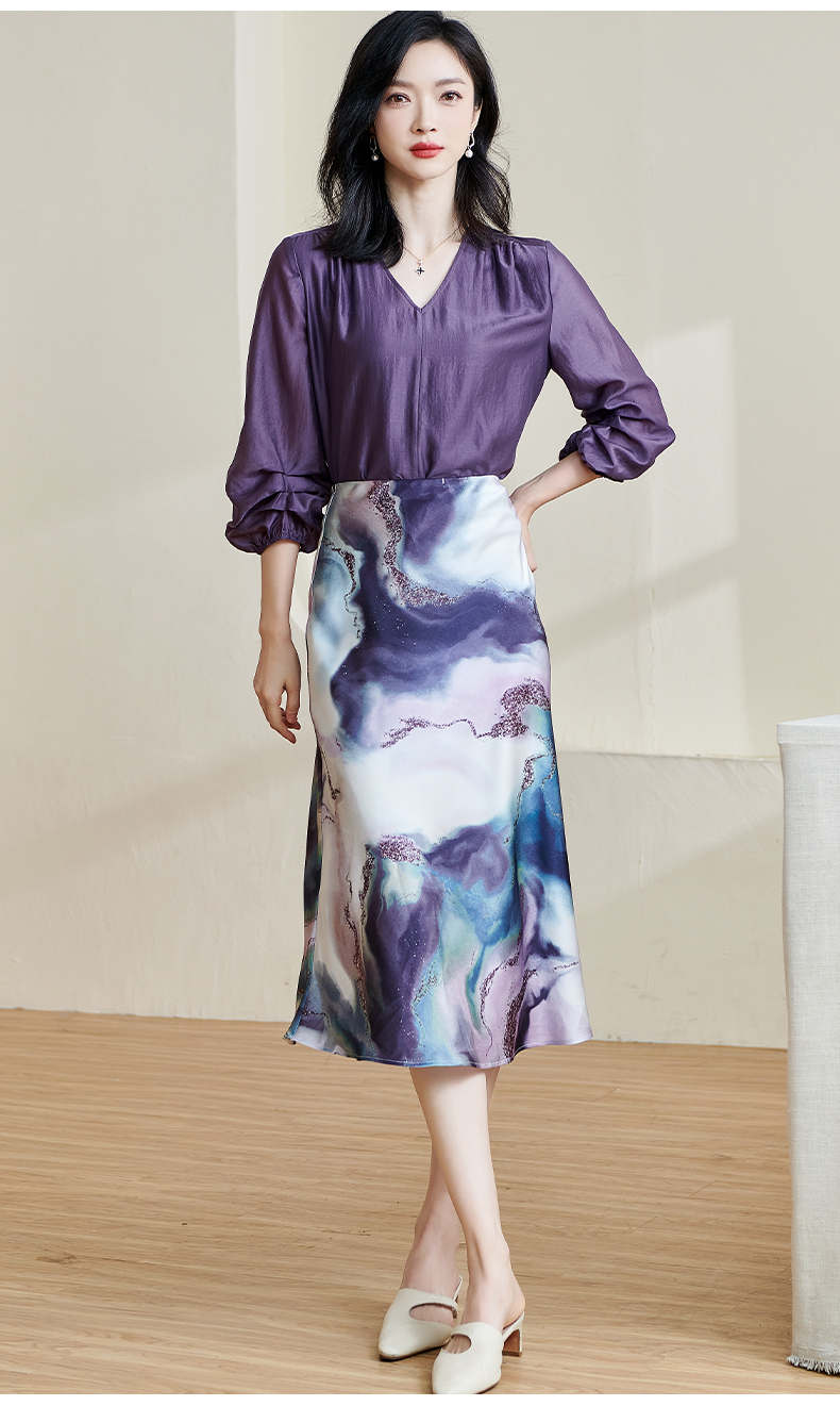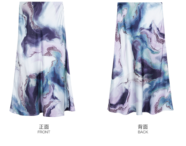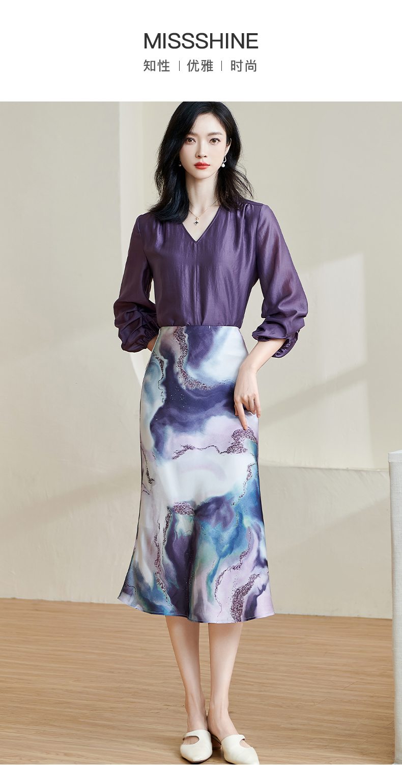 「印花缎面鱼尾半裙」渐变雾紫印花 富有艺术感和贵气感 裙摆自带优雅幅度 知性优雅 米思阳2026春夏新款优雅气质印花包臀裙高腰宽松显瘦半身裙子2466