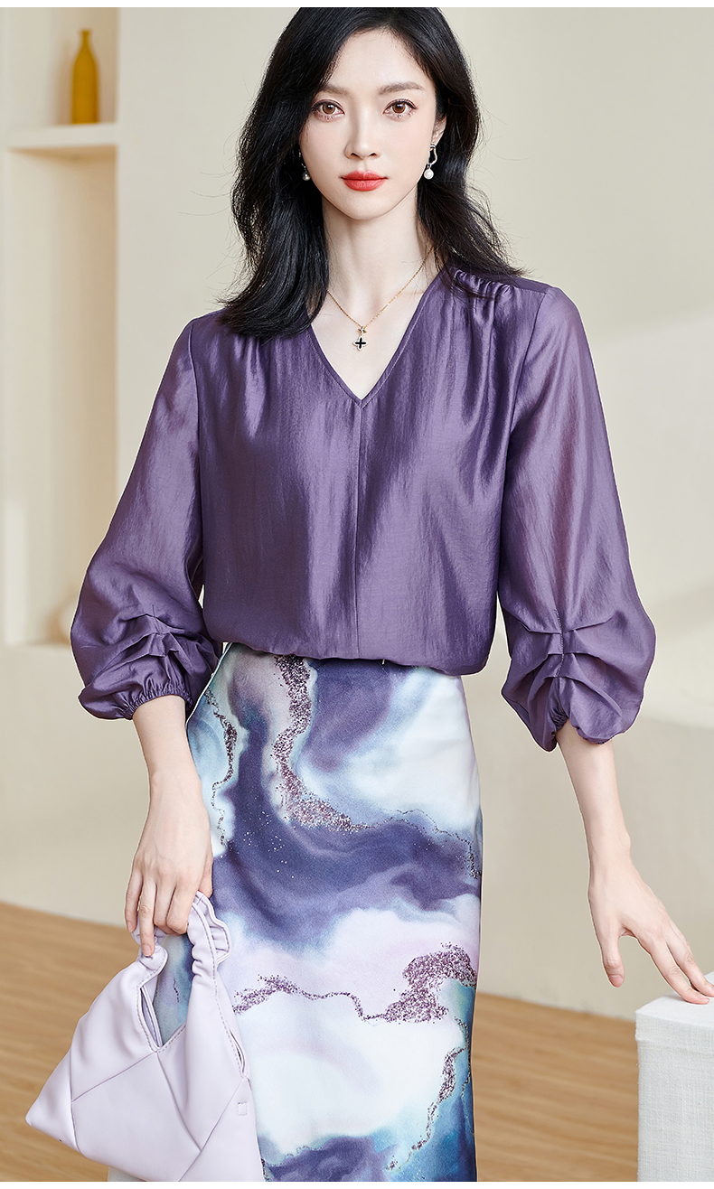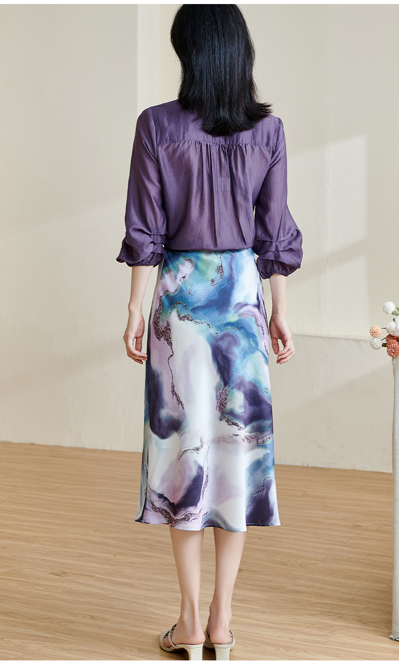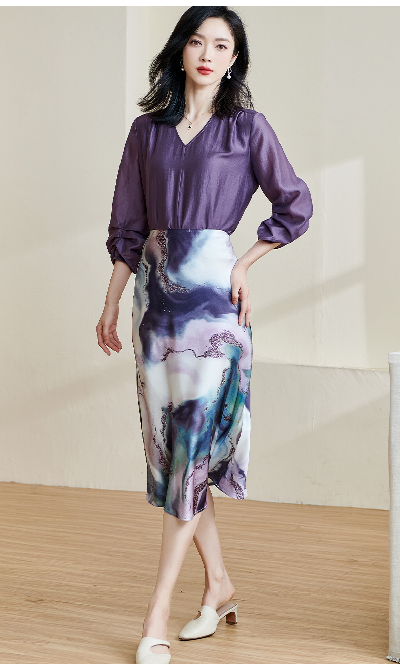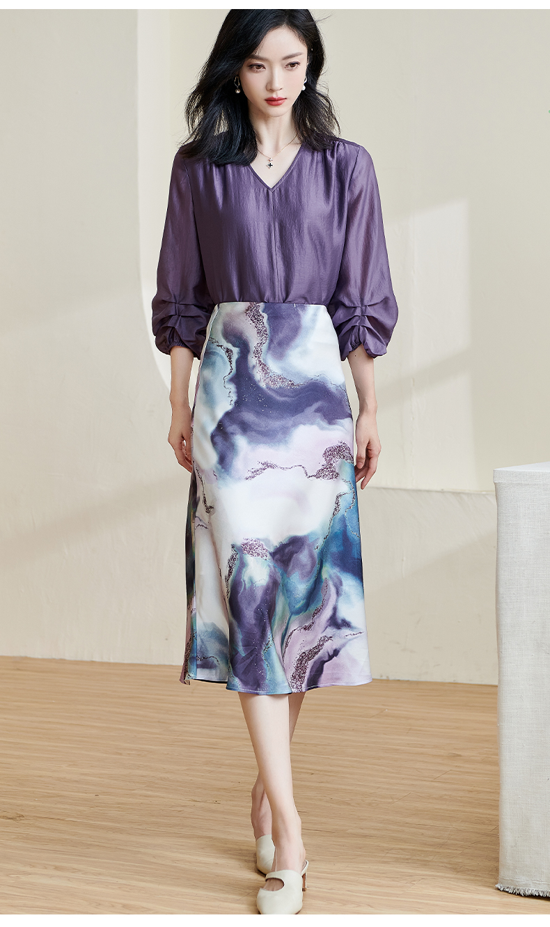 「印花缎面鱼尾半裙」渐变雾紫印花 富有艺术感和贵气感 裙摆自带优雅幅度 知性优雅 米思阳2026春夏新款优雅气质印花包臀裙高腰宽松显瘦半身裙子2466