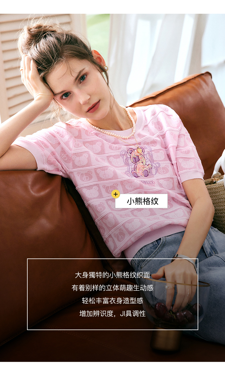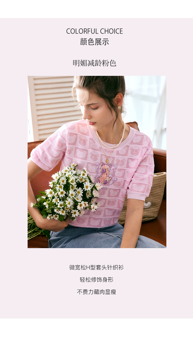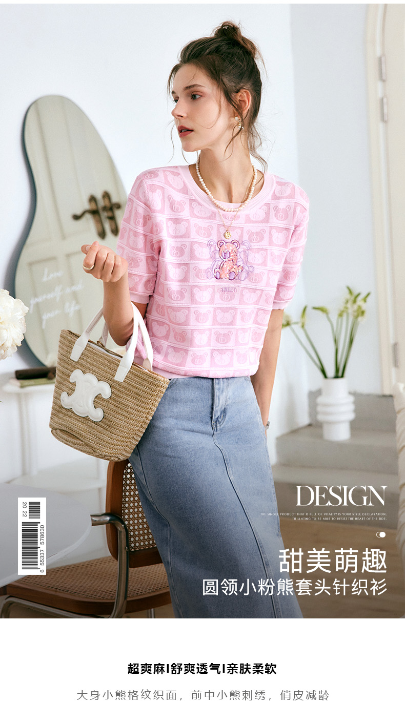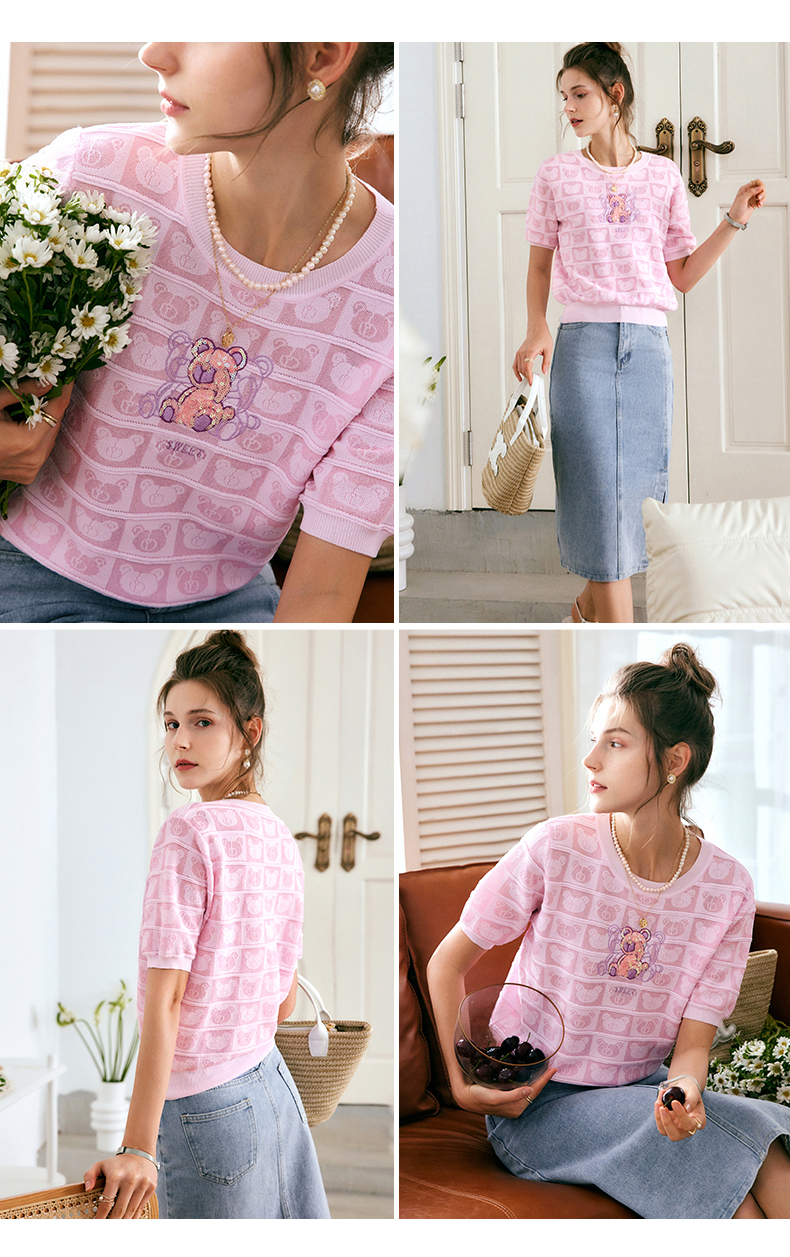 OLrain法式粉色短袖针织衫女夏季2022年新款宽松甜美小熊圆领上衣