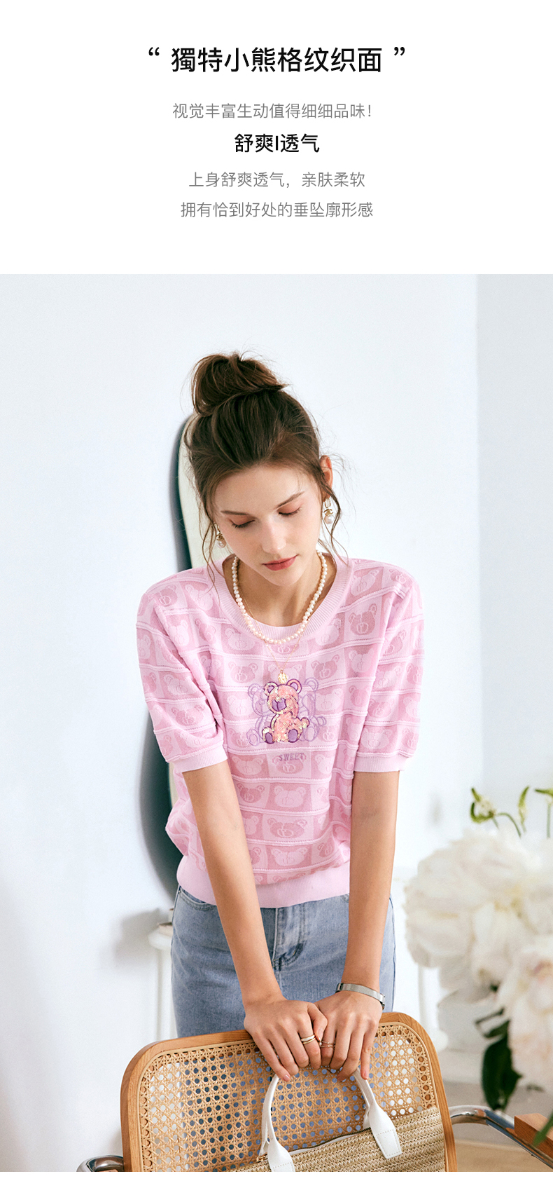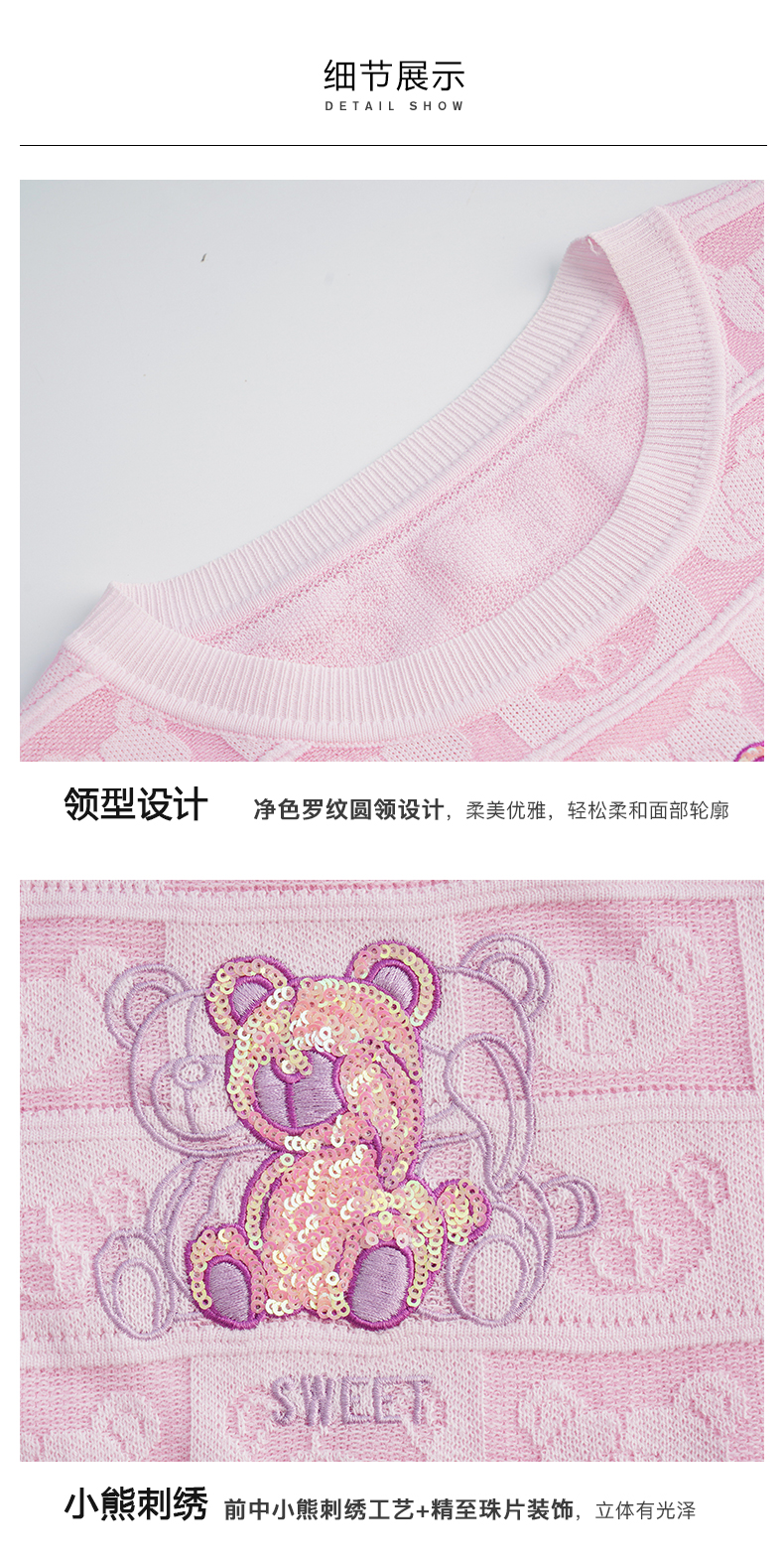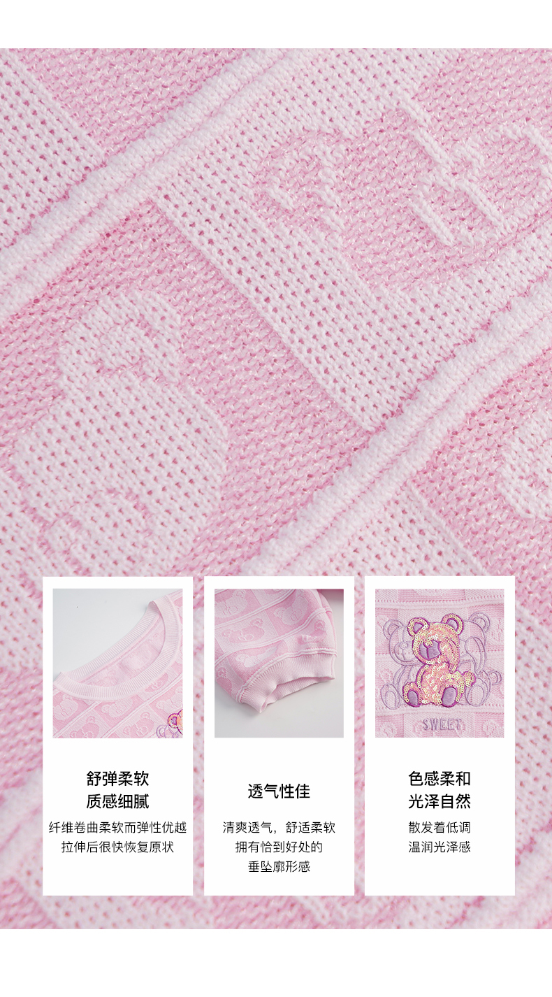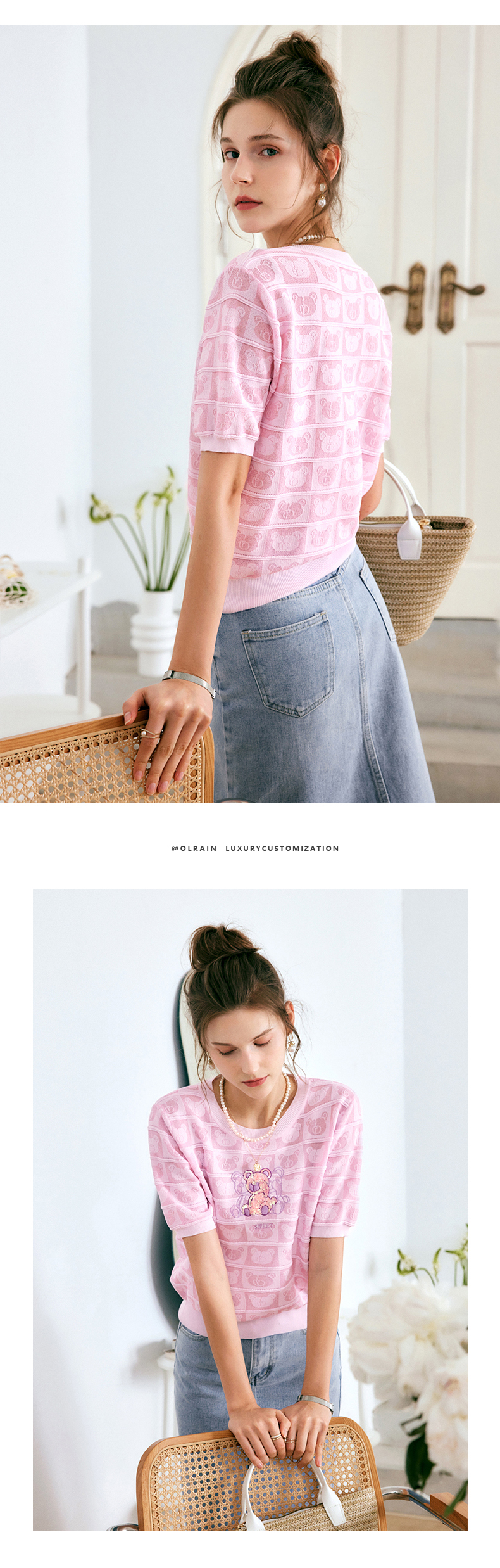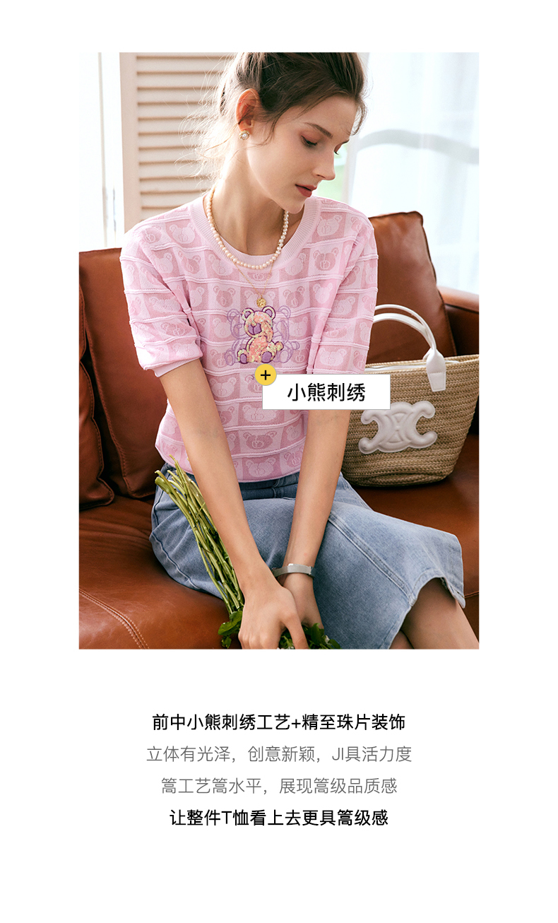 OLrain法式粉色短袖针织衫女夏季2022年新款宽松甜美小熊圆领上衣
