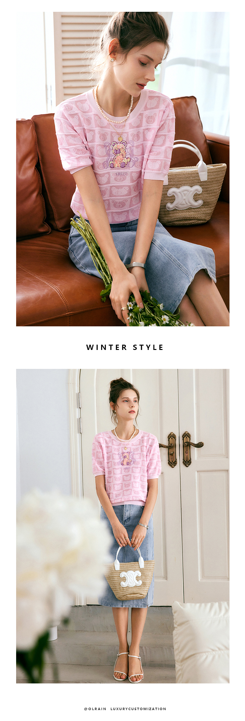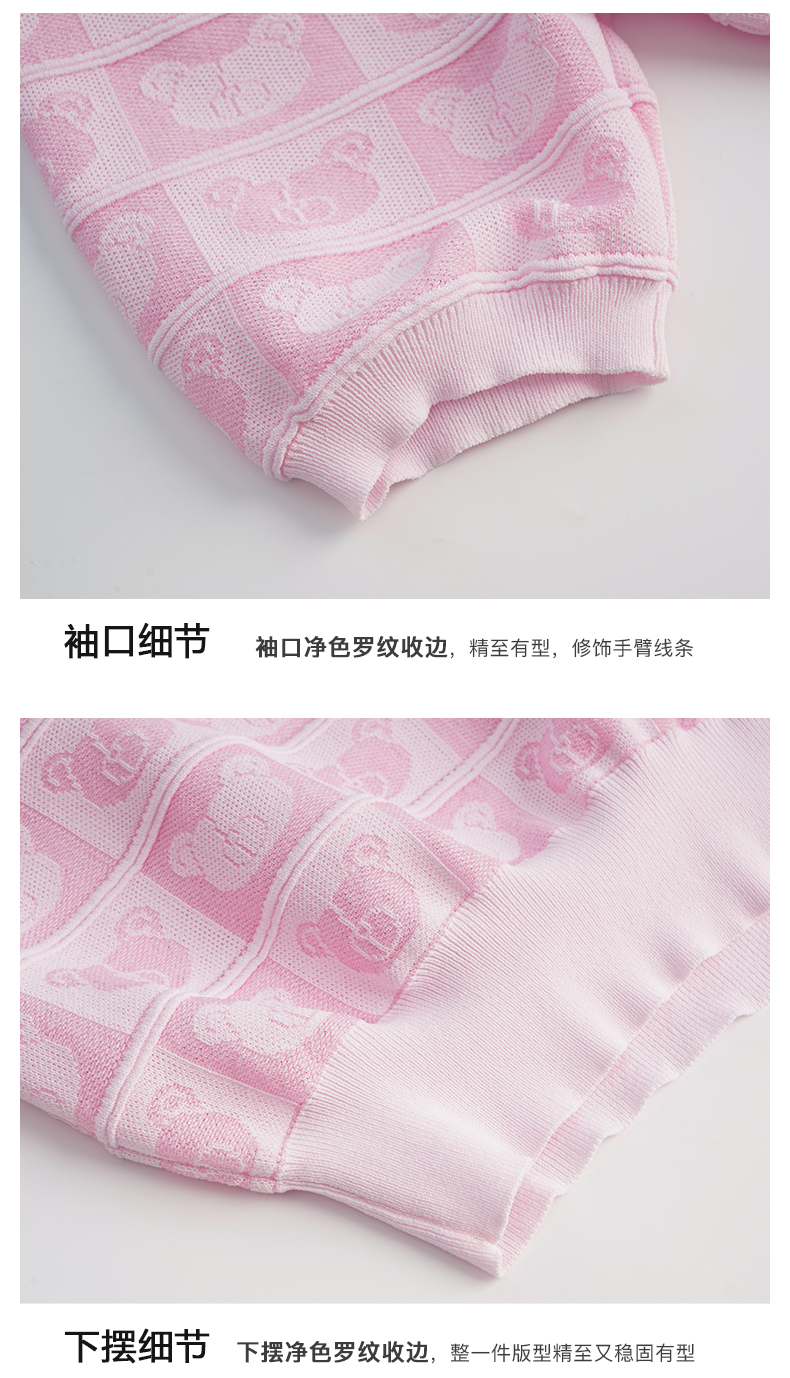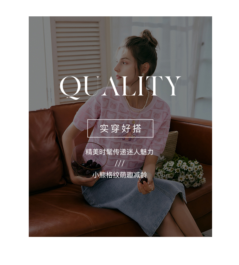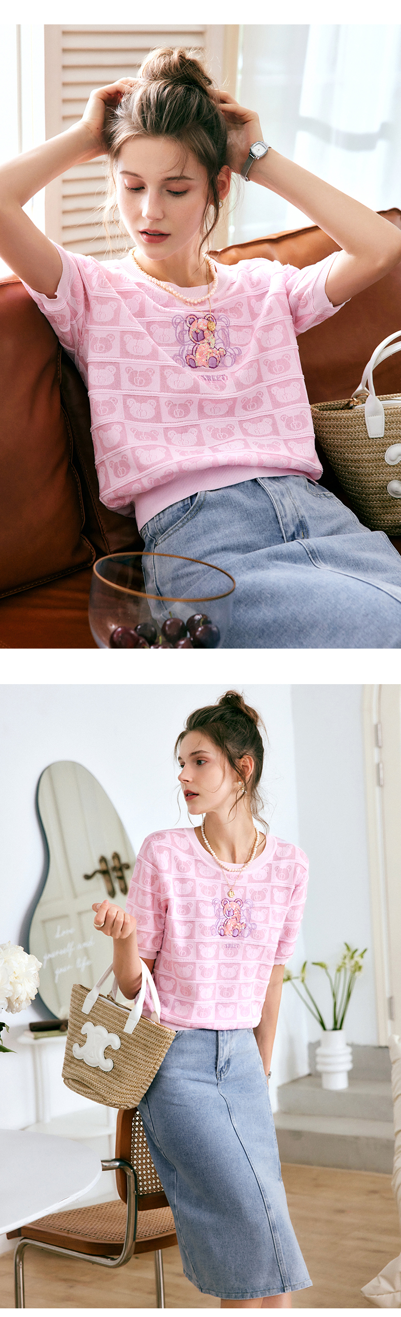 OLrain法式粉色短袖针织衫女夏季2022年新款宽松甜美小熊圆领上衣