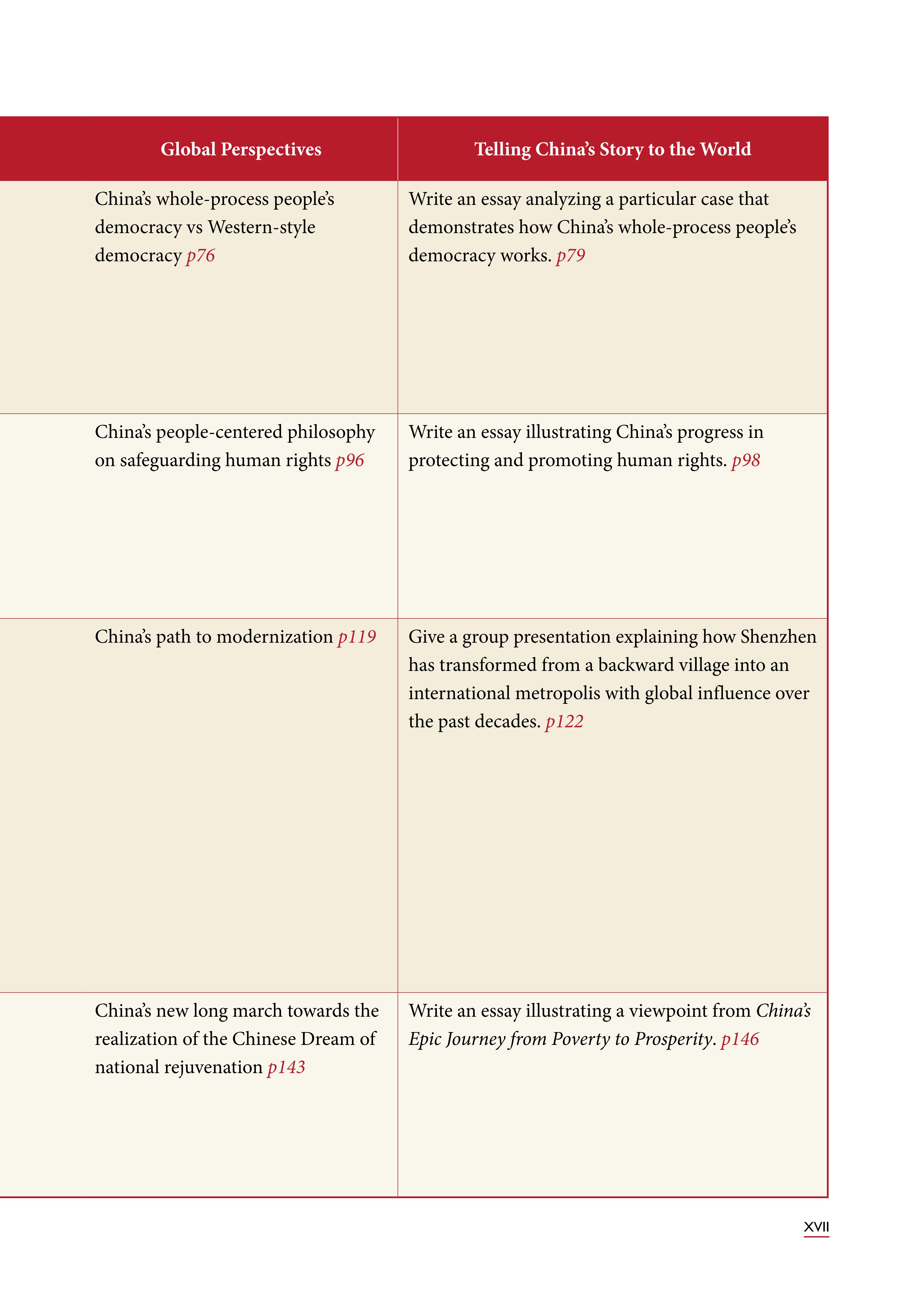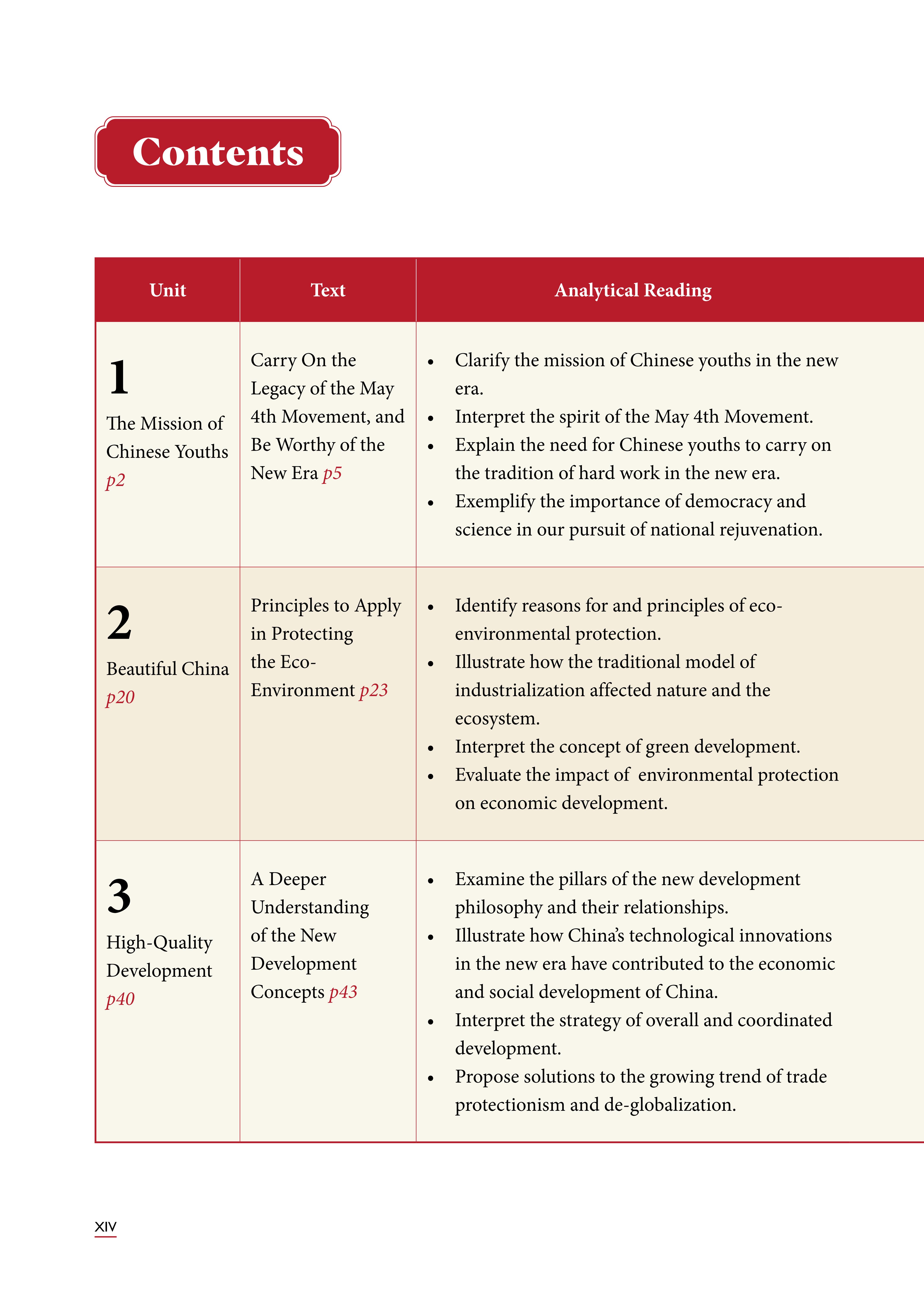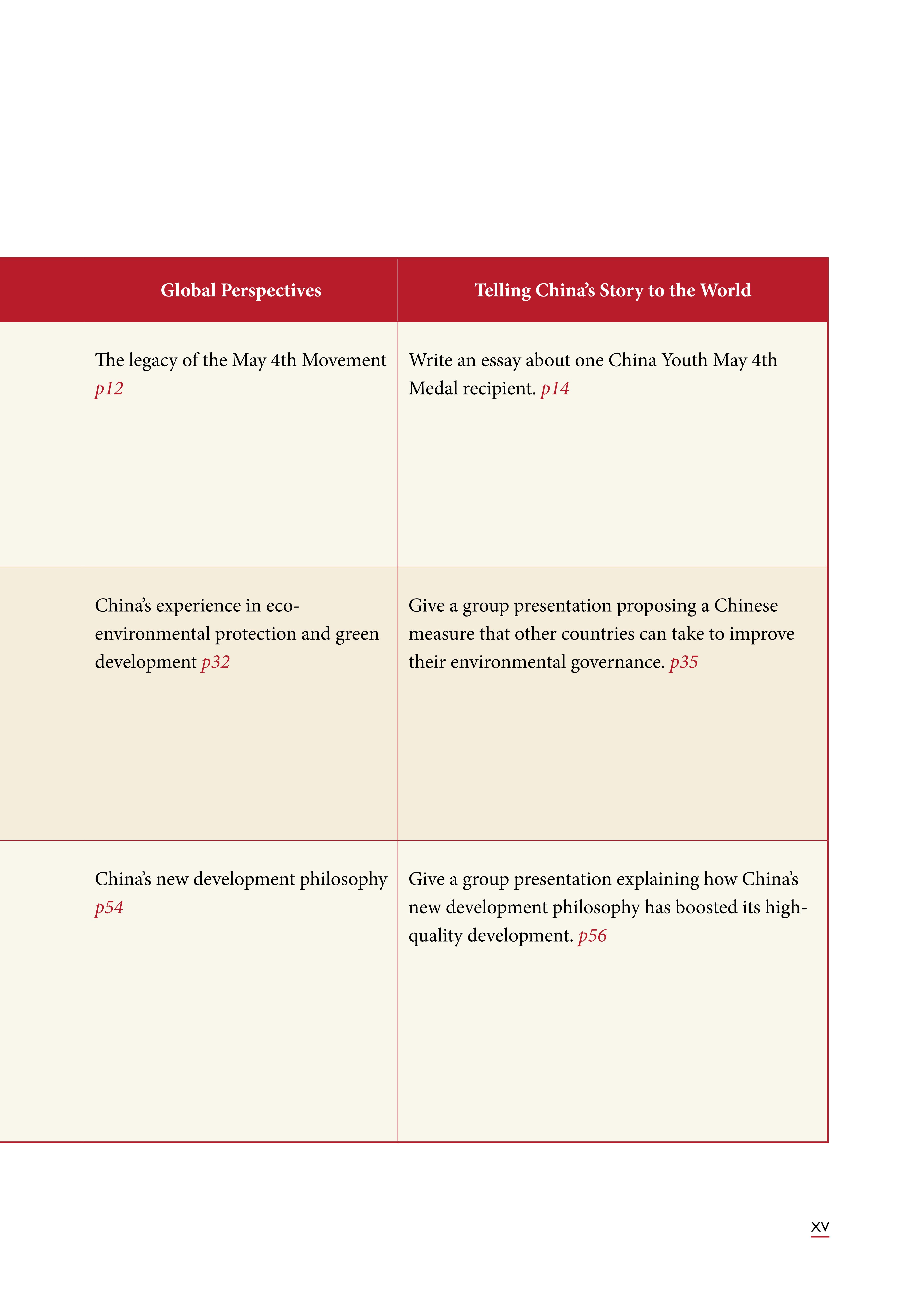 本教材主要包含Lead-in(导语)、Read and Respond(课前预习)、Text(课文)、Analytical Reading(分析阅读)、Global Perspectives(全球视角)、Telling China’s Story to the World(讲好中国故事)、Language in Focus(语言练习)、Ancient Chinese Wisdom(中国智慧)、Further Reading(延展阅读)等板块,注重培养学生的跨文化思辨意识,提高其用英语讲好中国故事的能力;引导学生在研讨与合作探究中提升英语表达与沟通能力,促进其演讲能力、思辨能力、研究能力和创新能力的融合发展。