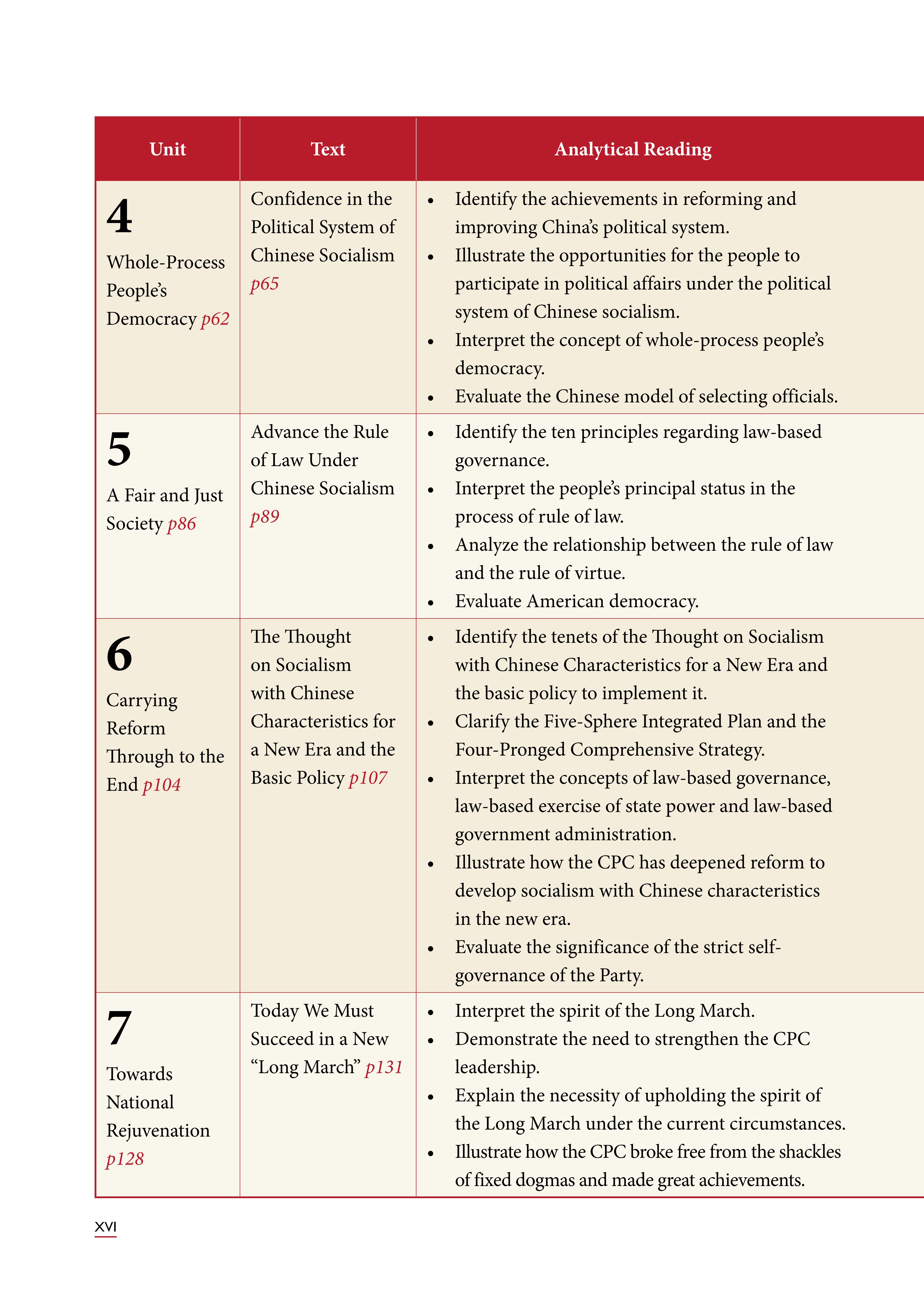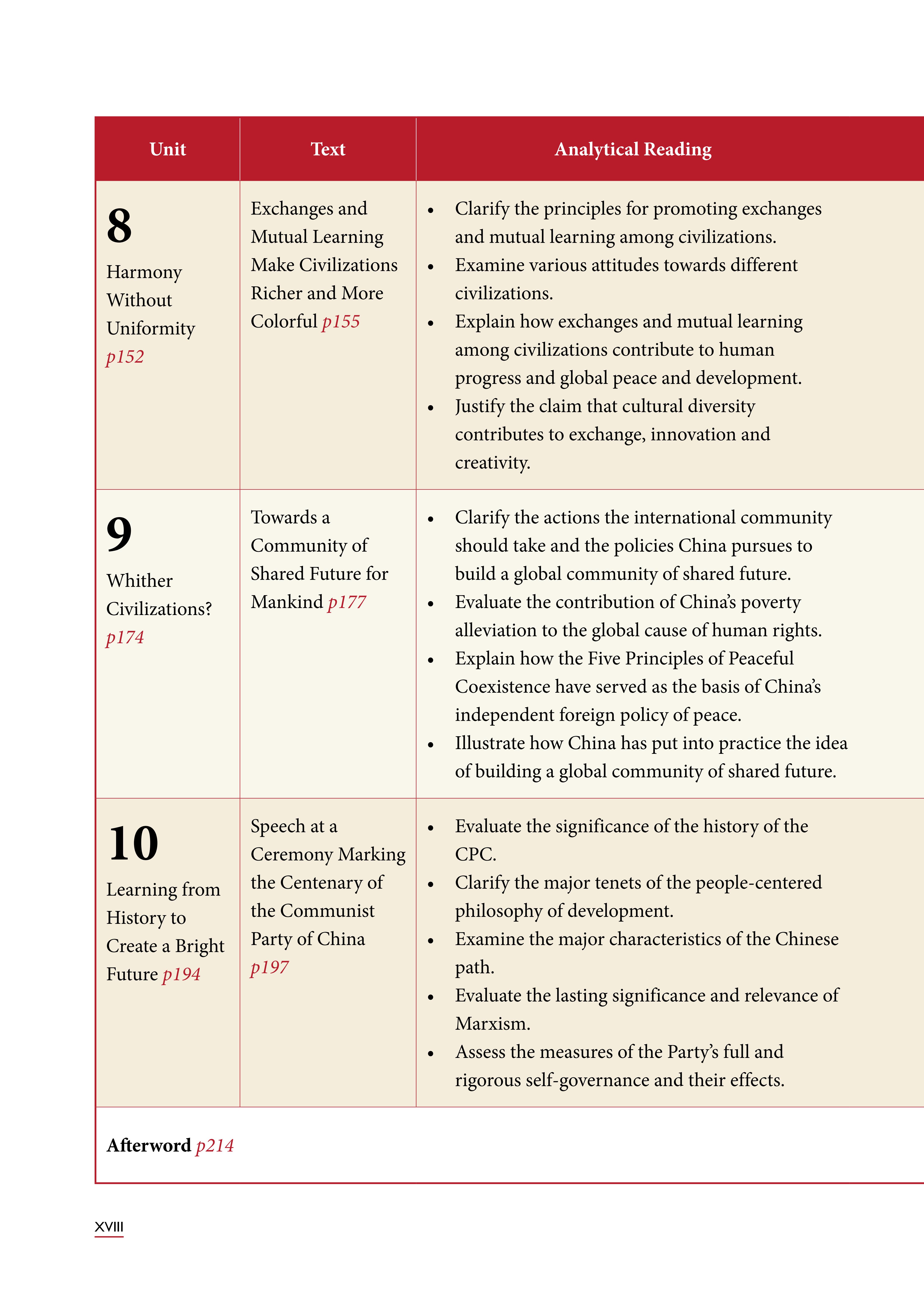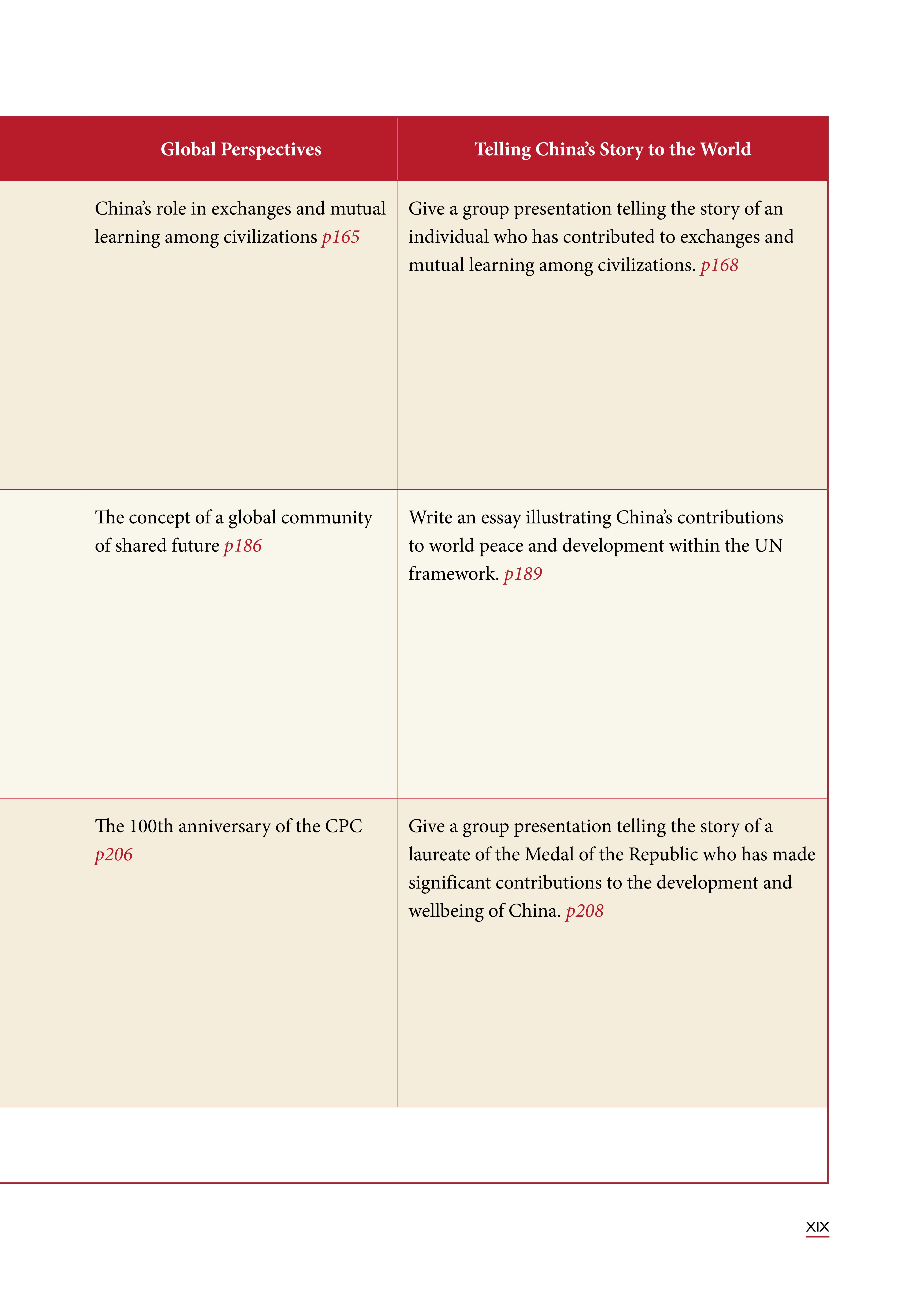本教材主要包含Lead-in(导语)、Read and Respond(课前预习)、Text(课文)、Analytical Reading(分析阅读)、Global Perspectives(全球视角)、Telling China’s Story to the World(讲好中国故事)、Language in Focus(语言练习)、Ancient Chinese Wisdom(中国智慧)、Further Reading(延展阅读)等板块,注重培养学生的跨文化思辨意识,提高其用英语讲好中国故事的能力;引导学生在研讨与合作探究中提升英语表达与沟通能力,促进其演讲能力、思辨能力、研究能力和创新能力的融合发展。
