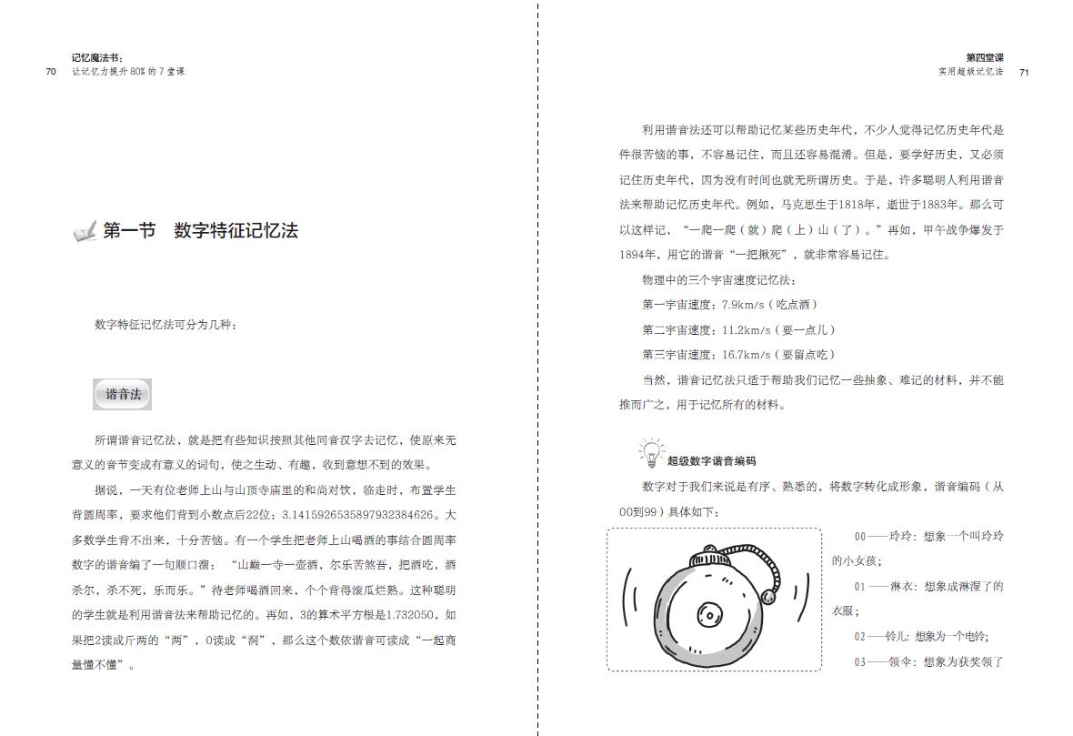 本书介绍了多种记忆方法:谐音法/超级数字谐音编码/拆拼法/运算法/特征法/奇特联想法/表象联想法/接近联想法/类似联想法/对比联想法/主题概括法/内容概括法/缩略概括法/数字概括法/顺序概括法/罗列法/概括法/简缩法/形象法/密码记忆法/谐音记忆法/关键点记忆法