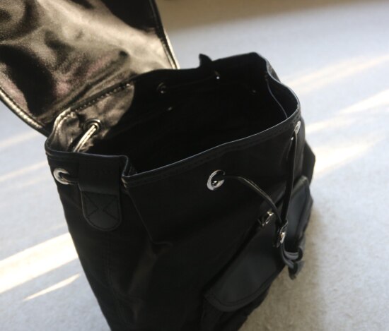 翻盖式包口 磁扣闭合 内包口是皮质抽绳 可收紧